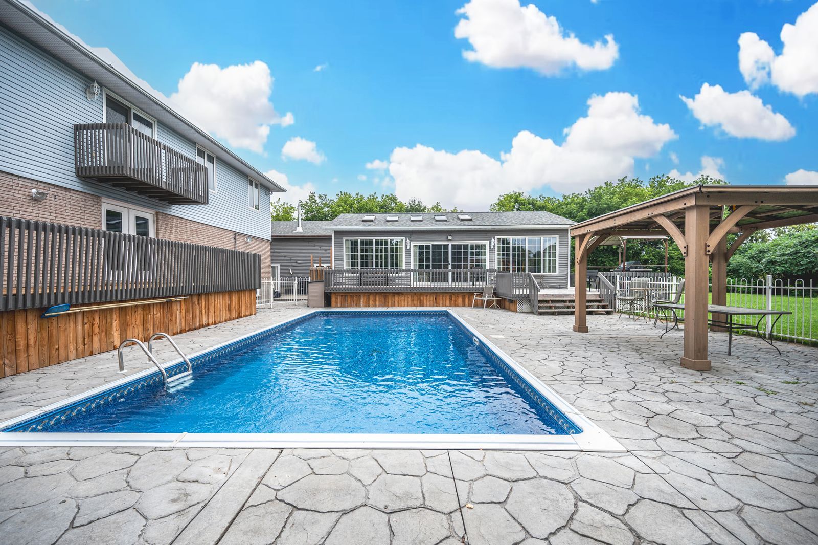Live together without compromise on 1. 3 acres with three complete living spaces, an in-ground pool & a basketball court! Big families, blended families and multi-generational households will immediately see the value in this layout, with three separate living zones and over 8,400 finished square feet of living space. Situated on 1. 3 acres with a wooded backdrop only 5 minutes from barrie, the backyard delivers a resort-style experience with an in-ground pool, stamped concrete patio, ample greenspace, a concrete basketball court that doubles as a winter rink, landscape lighting, an irrigation system, two 12 x 19 sheds, and a side gate offering drive access to the yard for easy boat and toy parking. The main residence features 5 bedrooms and 4 bathrooms, updated flooring, contemporary paint colours, and a functional kitchen with butcher-block counters, white cabinetry, a tile backsplash, stainless steel appliances, and an island. Upstairs, the primary retreat stands apart with soaring skylit ceilings, a generous sitting area with a fireplace, an entertainment area with a walkout to the balcony, and a spa-like ensuite with a walk-in closet and convenient access to the laundry room. The finished basement adds even more room, with a large rec room, a cozy fireplace, a solid oak wet bar, and a full bathroom. For in-law potential and added flexibility, the pool house offers 2 bedrooms, 2 full bathrooms, its own kitchen, and a bright open living space overlooking the pool, plus a 690 sq ft unfinished lower level, while the separate studio adds its own kitchen, living area, full bathroom and laundry, creating a fully equipped space for extended family, guests, or working from home. Few properties solve space, privacy and multi-generational living this cleanly, with the bonus of a backyard that feels like a destination!