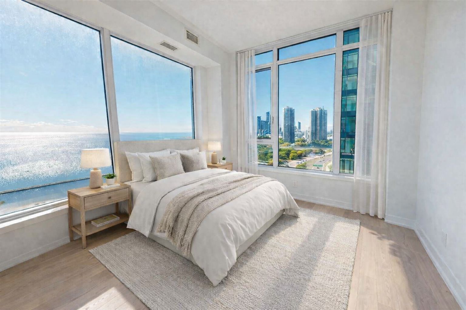 Perched high above the waterfront at mirabella luxury condos, this 3-bedroom, 2-bathroomresidence feels equal parts polished and effortless. Sunlight pours through every room, highlighting a bright open-concept layout and elevated finishes throughout. The best part? Panoramic, south facing views of lake ontario, a constant, calming backdrop from morning coffee to golden hour. Enjoy resort-style amenities and a lifestyle that's as convenient as itis beautiful, with quick access to hwy 427, the gardiner, qew, and transit, plus trails, parks, and toronto's vibrant waterfront just steps from your door. Parking and locker included