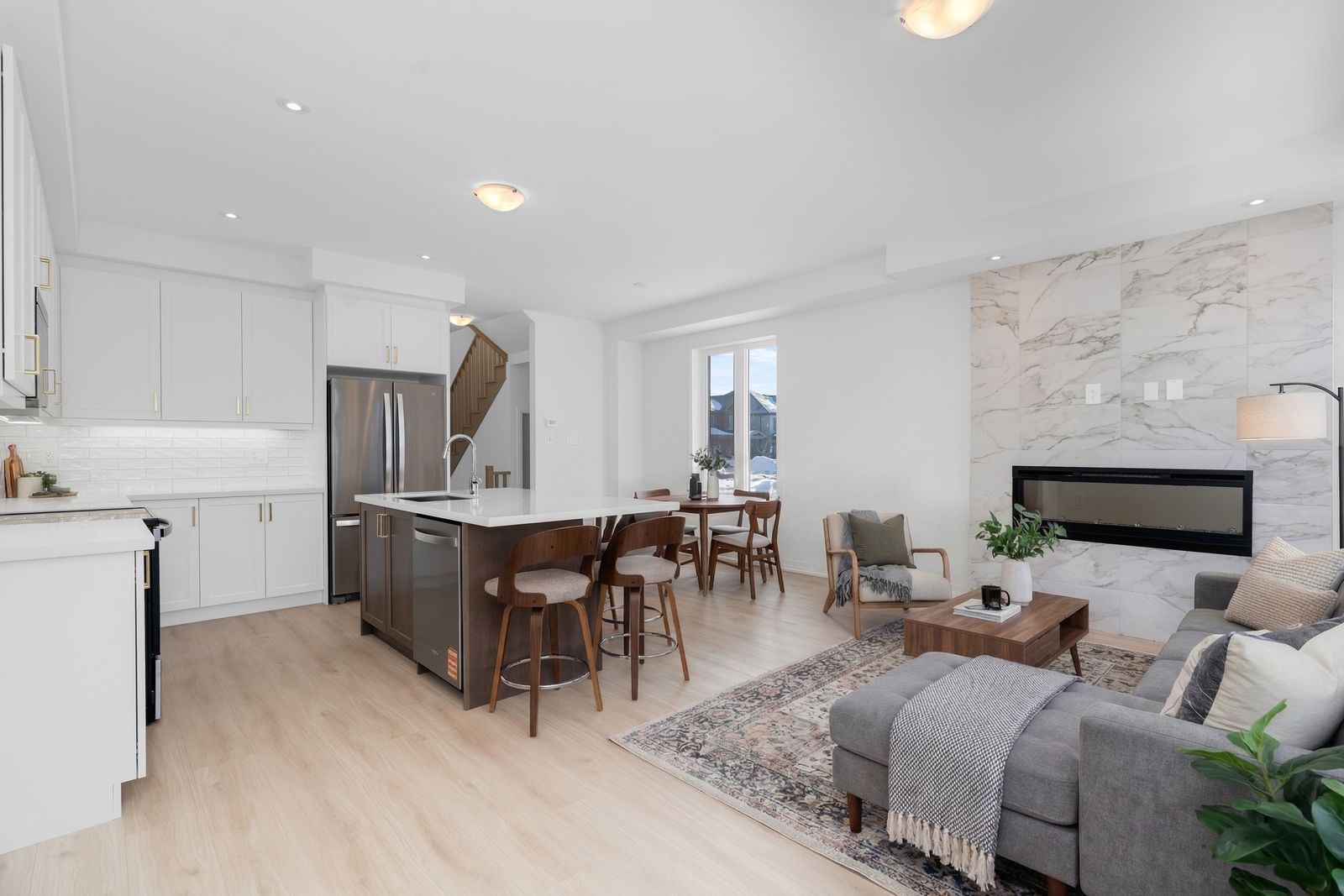 Act quick & unlock additional government hst rebates on all new builds! Your first home just got that much more affordable! There is something exciting about being the very first to live in a home, and this brand-new end unit townhome at 193 durham ave stands out with its bright, open-concept layout and premium builder upgrades. A brick-and-vinyl exterior, covered porch, and a stylish front door with a transom window make an immediate statement, while the attached garage with inside entry and 8 ft garage door add practicality. Smooth 9 ft ceilings, recessed pot lights, a 50" electric fireplace, a walkout to the backyard, and main-floor laundry highlight the main level. Quartz counters, breakfast bar seating for six, valance lighting, an undermount sink, stainless steel appliances, and a gas line rough-in give the kitchen a high-impact look. The primary bedroom presents dual walk-in closets and a 4-piece ensuite with dual sinks, while the main bath features a glass shower enclosure. The unfinished walkout basement brings in abundant natural light and offers an open layout with a bathroom rough-in, ready to be finished to suit your needs. Additional builder upgrades include wood-composite and tile flooring, decor upgrades, an a/v rough-in package, upgraded trim and stair package, hrv, bypass humidifier, and a 7-year tarion warranty. Set in innishore within a master-planned community with trails, bike paths, playgrounds, a 12-acre sports park, and hyde park just a short stroll away, this #hometostay is also minutes to schools, shopping, commuter routes, and daily essentials, with centennial beach, friday harbour resort, golf, and ski hills all within 30 minutes.