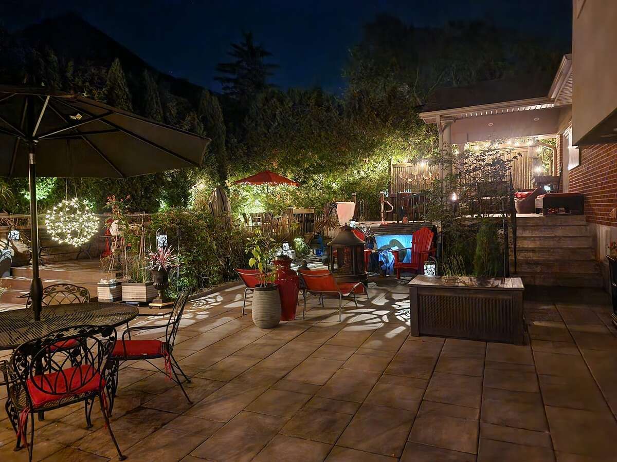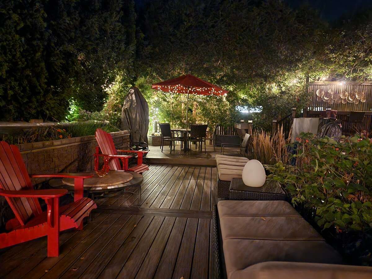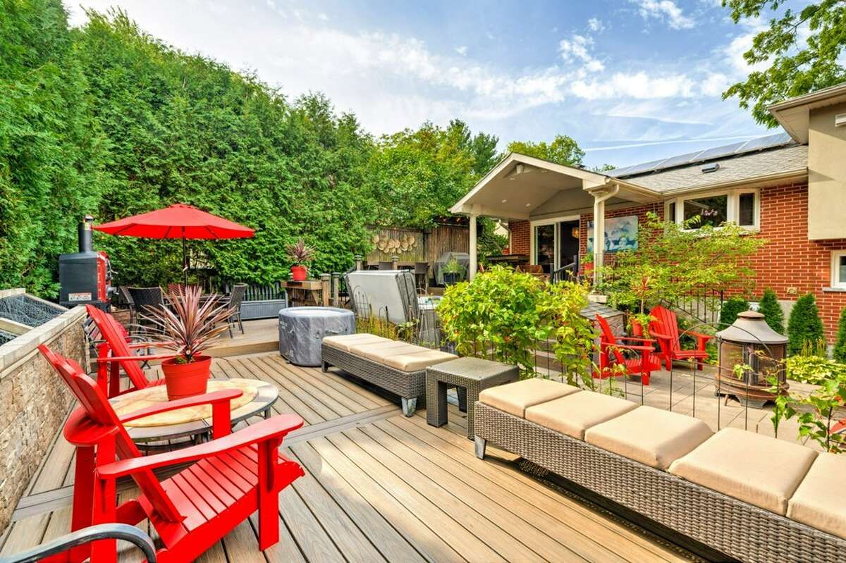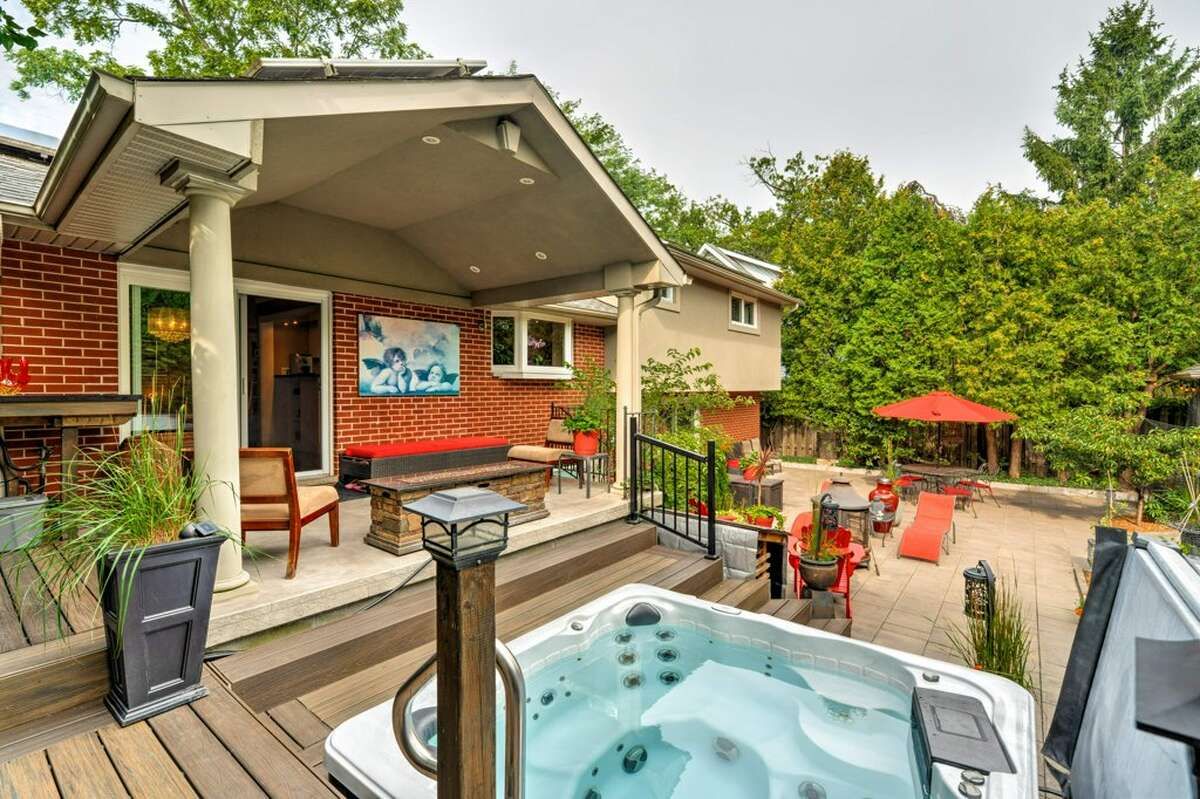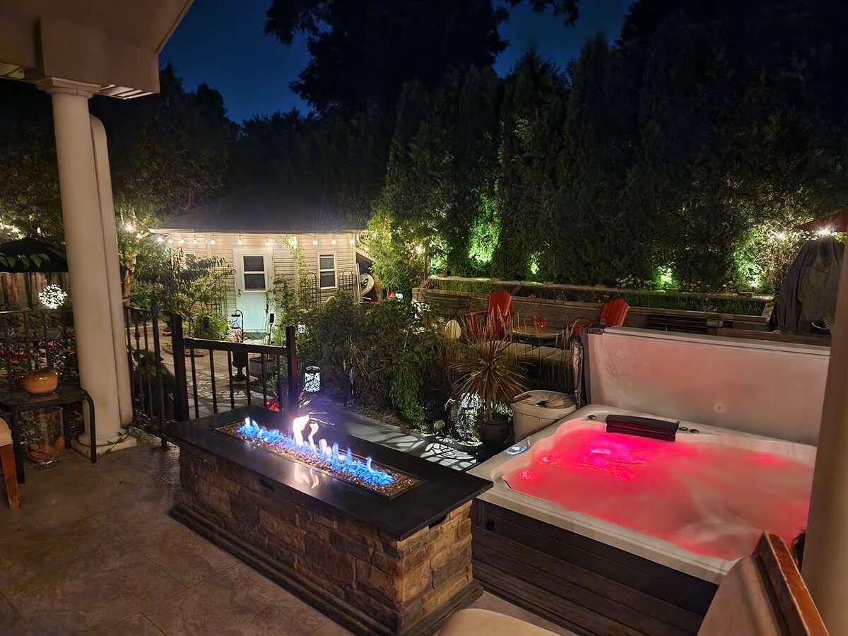• Private backyard oasis with hot tub, outdoor shower, and multilevel deck.