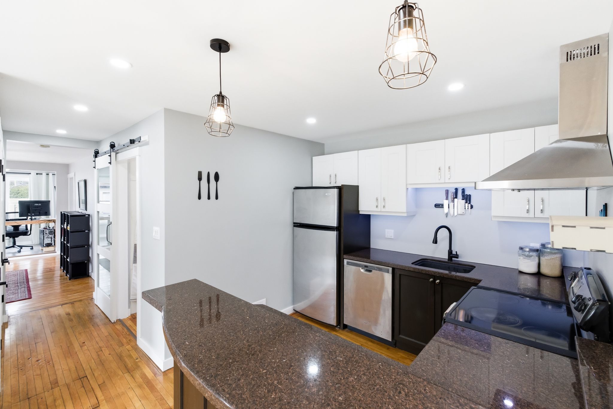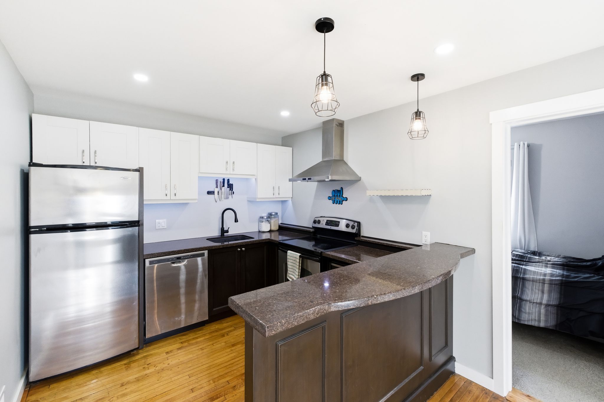 • Functional kitchen with stainless steel appliances and granite counters.
