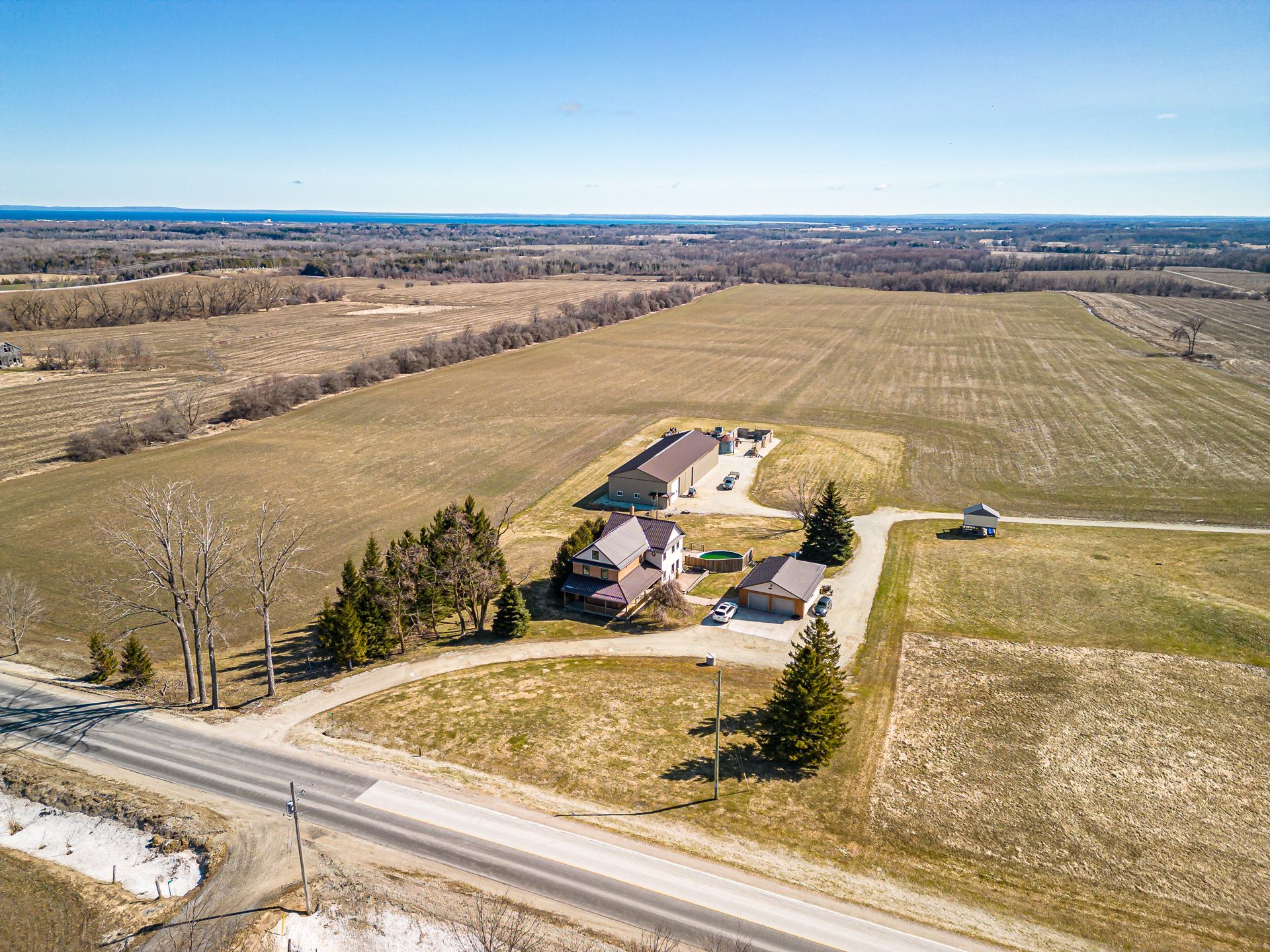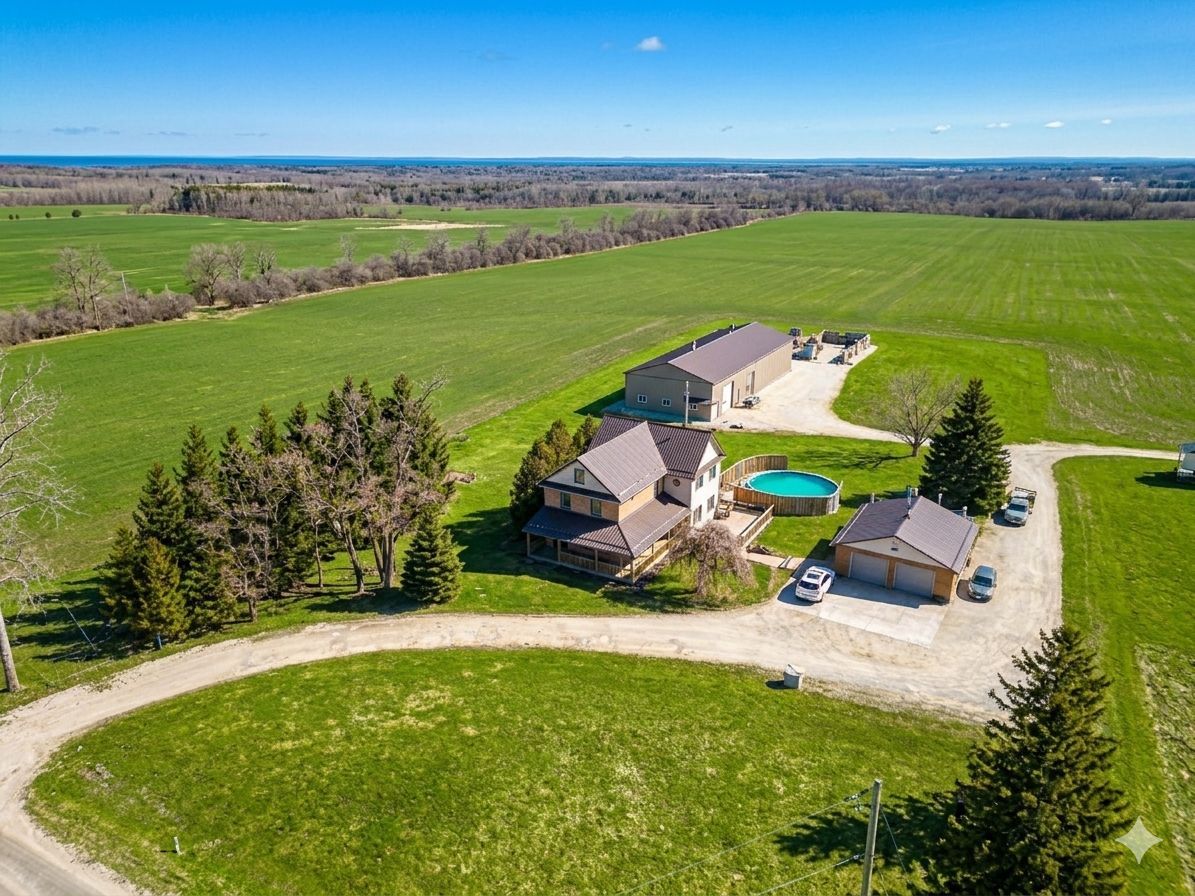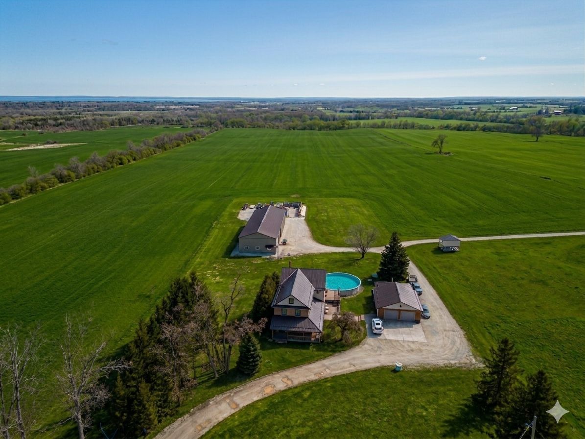 Discover the charm of country living with this 4 bedroom, 3. 5 bath, 3. 5 storey renovated farmhouse with 3000 square feet of stylish open concept living space. Nestled on 2. 68 acres this property offers a blend of modern comforts and rustic appeal. Walk-out from the living room to a large deck and patio area and soak in views of the bay and refreshing pool. The gorgeous batteaux creek custom kitchen (2021) features a huge island with a quartz countertop, ideal for family gatherings or entertaining! Experience the ultimate retreat in the massive primary bedroom, complete with a 6 piece ensuite bath (2016) and walk-in closet. Step out onto the private balcony and take in the breathtaking views of georgian bay! The finished bonus room in the attic is perfect for a kid's playroom, music or art studio. The freshly painted family room on the lower level features a cozy wood stove and includes a walk-out to the expansive rear yard. Full bath and sauna complete the lower living space. The 7 foot high unfinished basement area is ideal for storage. Enjoy a morning coffee on the charming wrap around veranda. Steel roof on house and garage, windows and exterior doors all replaced in 2018. The 26 x 26 detached, double car garage has an attached 14 x 23 propane-heated workshop area. The quality built 2018, 40 x 112 outbuilding consists of a 32 x 40 shop with a 16 foot ceiling and is roughed-in for in-floor heating. 14 x 16 foot insulated overhead and slider doors. Impressive 40 x 80 cold storage area complete with a storage mezzanine. Primary underground service, 50kva transformer, 200 amp service to the shop area and central metering. From hobbies to business ventures, the uses for this building are endless! The original barn foundation is transformed into an outdoor party area complete with a silo converted bar! This is a very unique and special property located just minutes to collingwood, blue mountain, private ski clubs and golf courses with a stunning million dollar view!