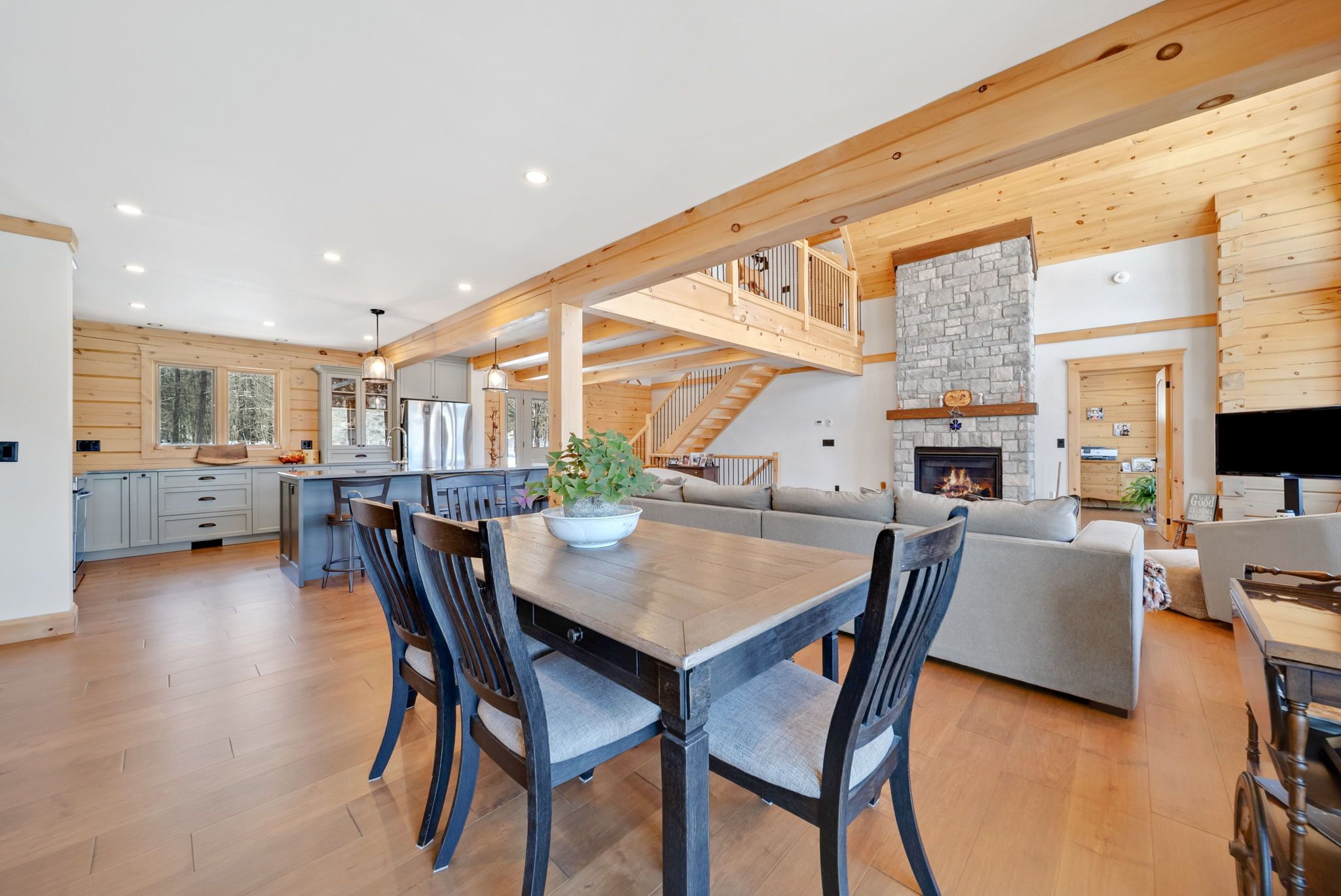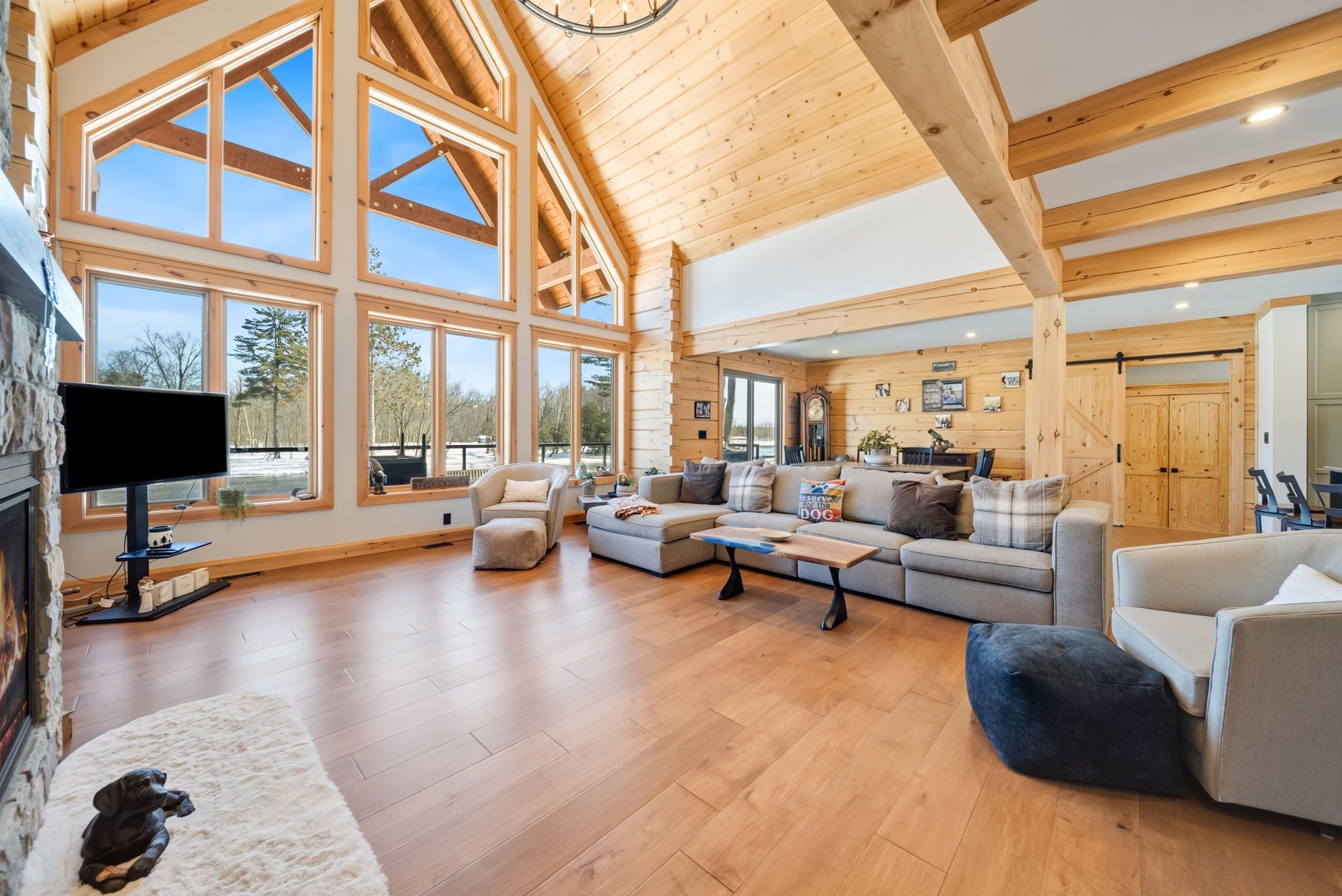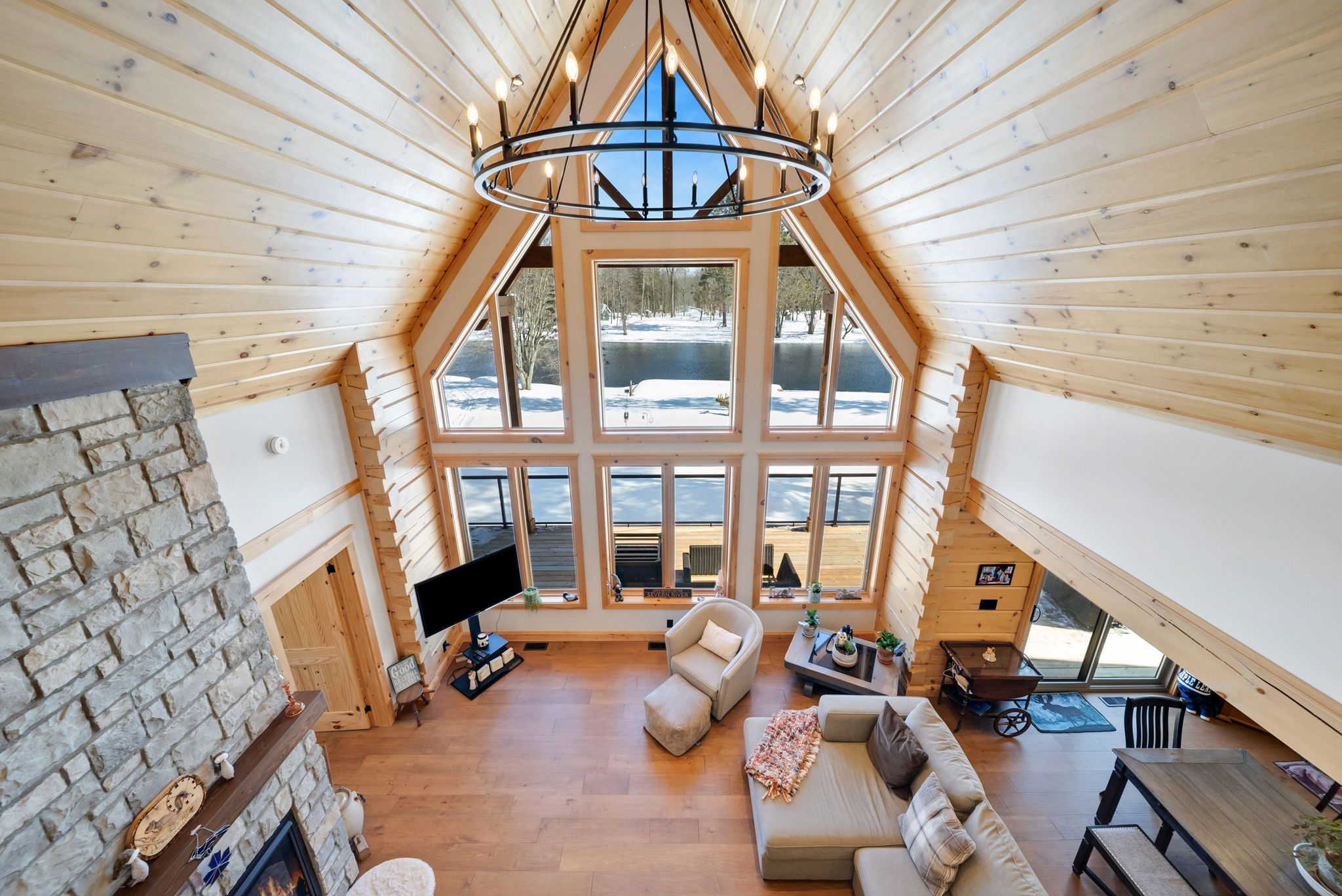 Set along 103 feet of open waterfront on mcleod drive in severn, this custom built solid log residence offers a rare blend of craftsmanship, scale, and natural setting. The moment you step inside, the architecture makes an impression. Soaring ceilings, an open concept living and kitchen area filled with natural light, and expansive windows frame beautiful river views from many of the principal rooms. It is a home designed not just for living, but for enjoying its surroundings. The kitchen and family room connect seamlessly, creating a comfortable space suited to both entertaining and quiet evenings at home. Patio doors open to a riverside porch where the outdoors becomes a natural extension of the living space. A main floor bedroom with a private ensuite offers excellent flexibility for guests or multi generational living. Above, the open loft style primary suite provides a peaceful retreat with large his & her custom walk in closets and a well appointed spa like ensuite. The loft design maintains a connection to the open living space below while still offering privacy. The fully finished walkout lower level adds even more living space with a large recreation room, two additional bedrooms, and a 3 piece bathroom, providing comfortable accommodation for family and guests. Step outside from the walkout and unwind in the hot tub, perfectly positioned to take in the river setting year round. With 103 feet of frontage on the severn river and a solid log home designed for lasting quality, this property offers an exceptional waterfront lifestyle 15 minutes from orillia and its amenities while still feeling comfortably removed from the pace of town.