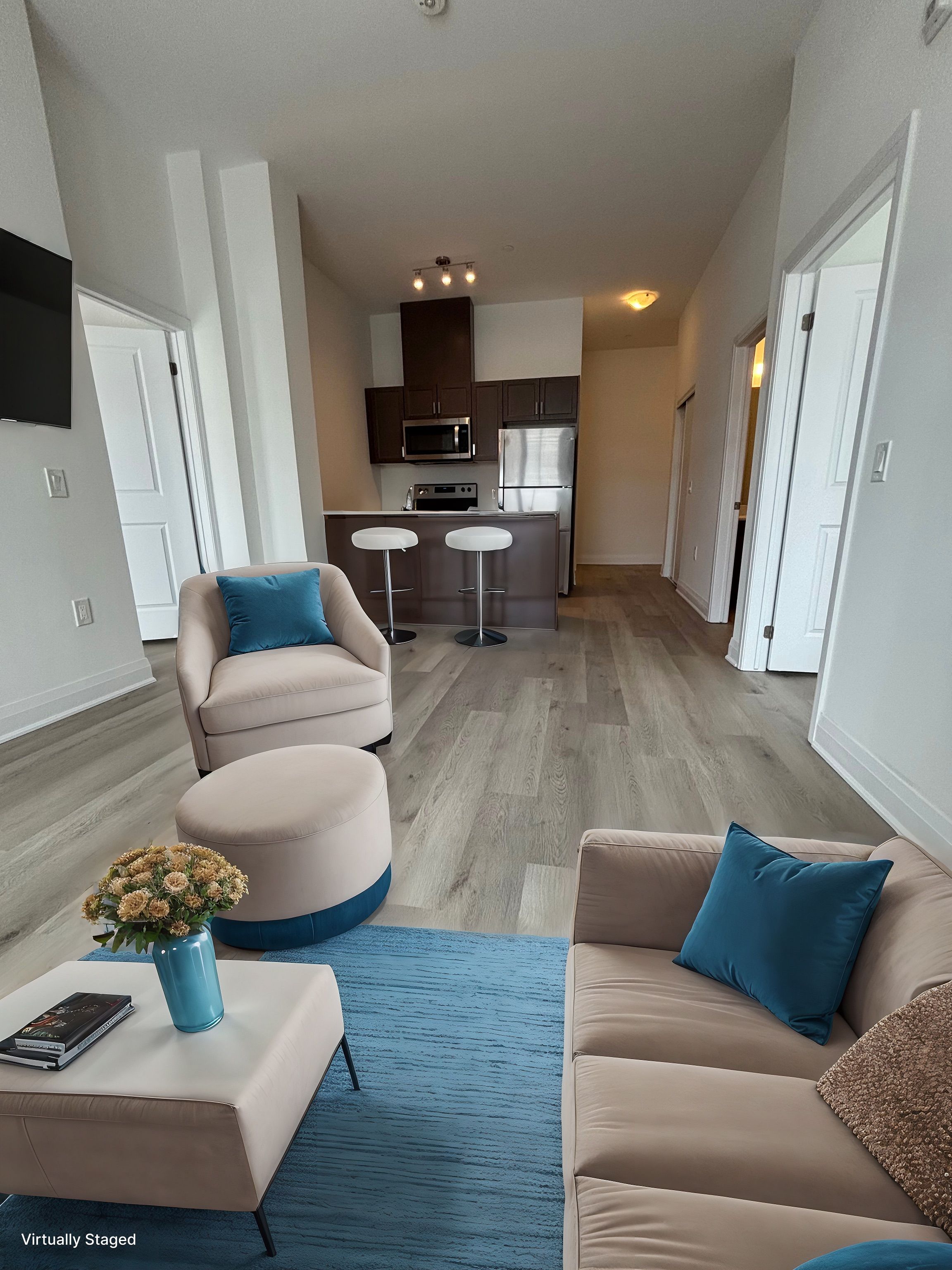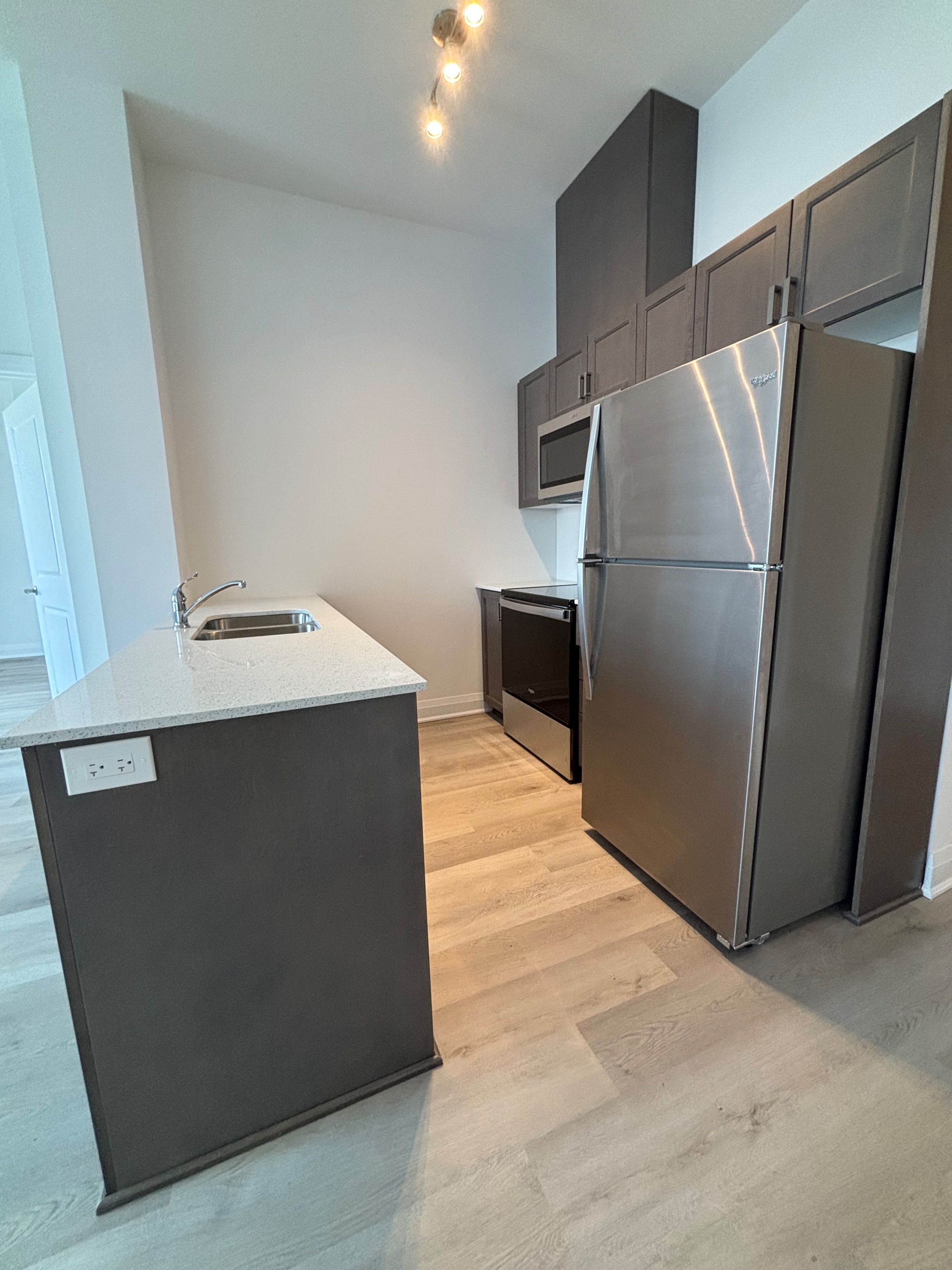 • Modern kitchen with quartz countertops and stainless steel appliances.