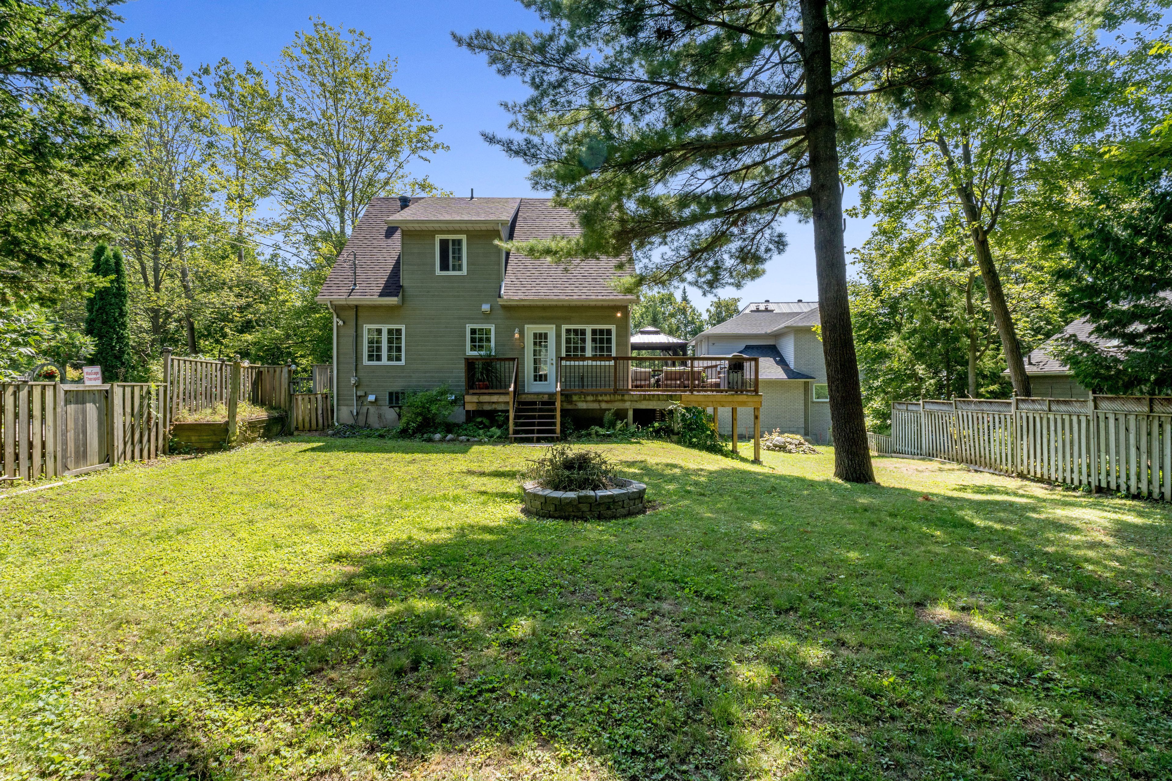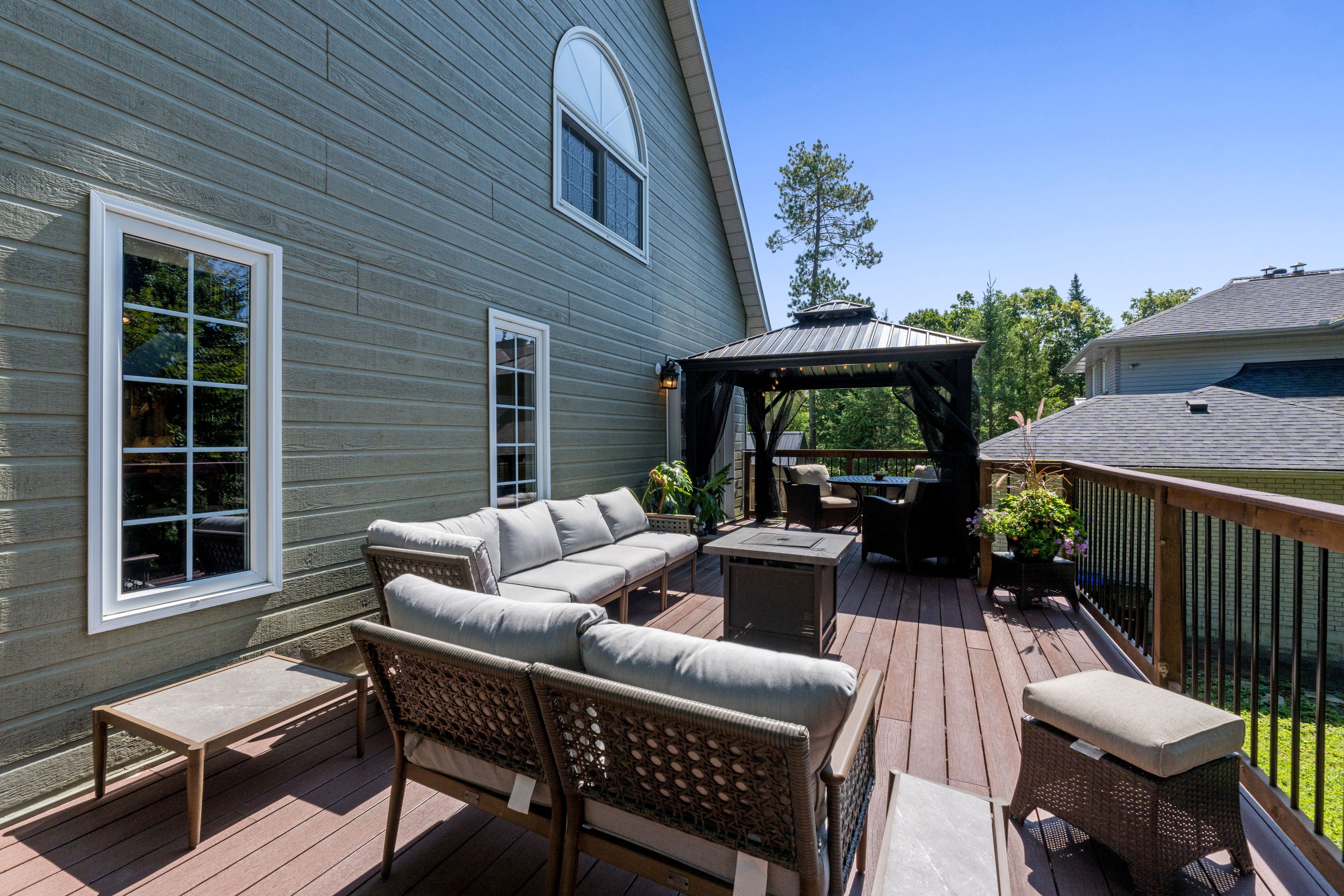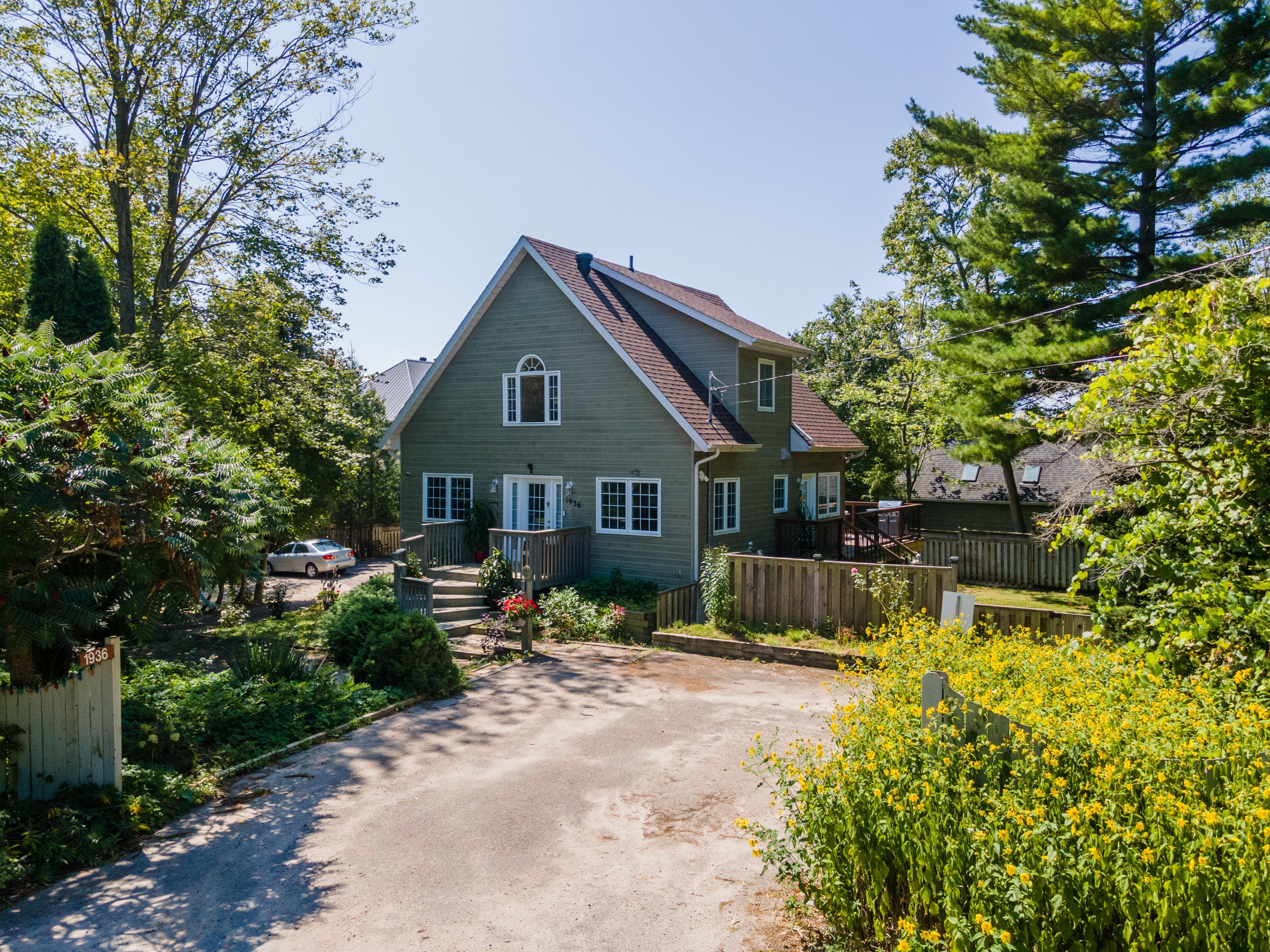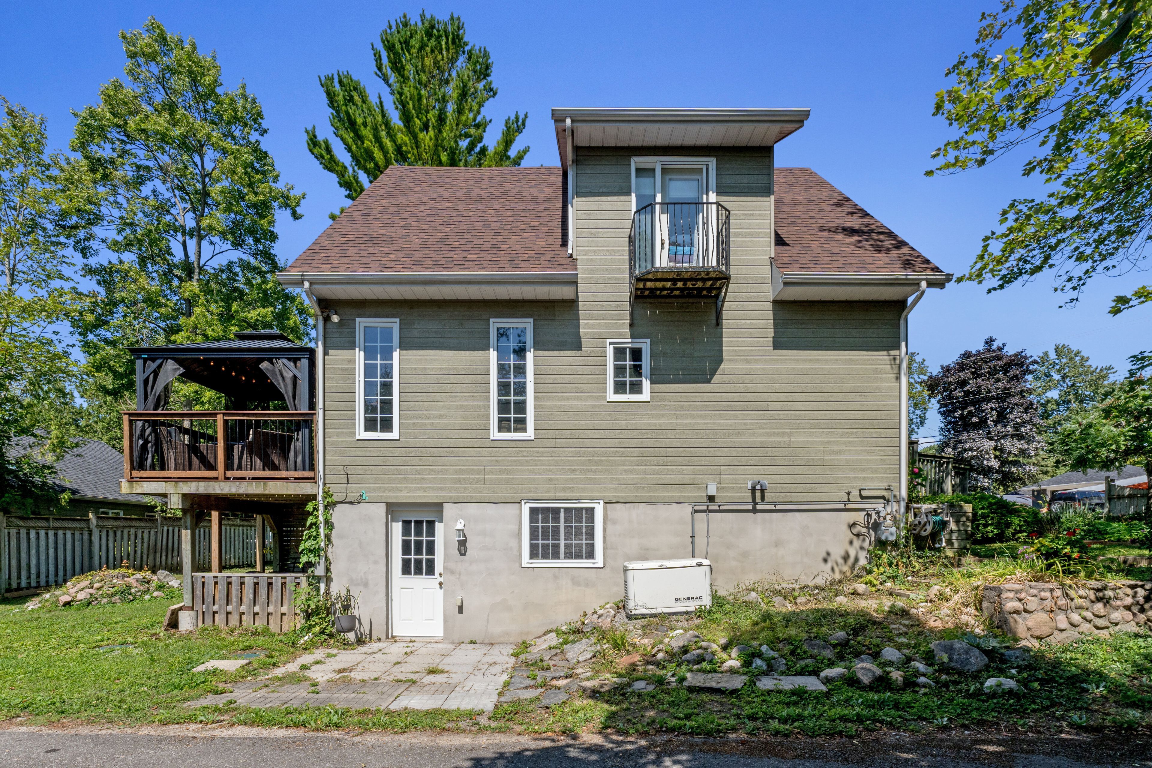 Discover the perfect blend of modern comfort and laid-back coastal living in this thoughtfully designed 3-bedroom home, showcasing tranquil lake views and standout curb appeal. Whether you're seeking a year-round residence or a weekend escape, this home is crafted for effortless living, entertaining, and fully embracing the beachside lifestyle. The open-concept main floor impresses with soaring cathedral ceilings, rich hardwood floors, and expansive windows that flood the space with natural light. A welcoming front sitting area creates an inviting first impression, while the beautifully appointed kitchen-anchored by a custom live-edge dining table-flows seamlessly into a private side yard, ideal for summer lounging or alfresco dining. French doors lead to a generous composite deck featuring a hard-top gazebo and built-in gas fireplace, offering a stylish setting for year-round gatherings. Upstairs, a bright loft-style primary retreat delivers spa-inspired comfort with its private ensuite and sweeping lake views. The lower level, complete with its own entrance and walk-out patio, provides versatile living space including an oversized recreation room, a third bedroom or home office, and a spacious laundry and storage area. Just steps from the sandy shores of woodland beach and edmore beach, this exceptional property also offers ample private parking, a generac whole-home generator, high-speed internet, and convenient garbage pickup-everything you need for easy, carefree coastal living.