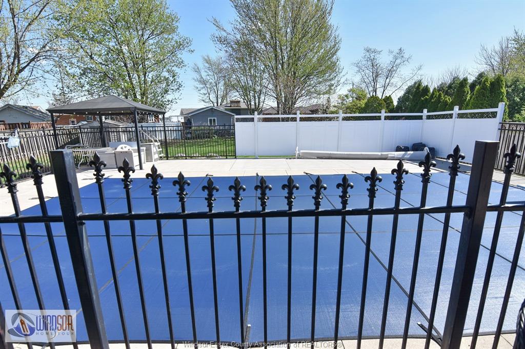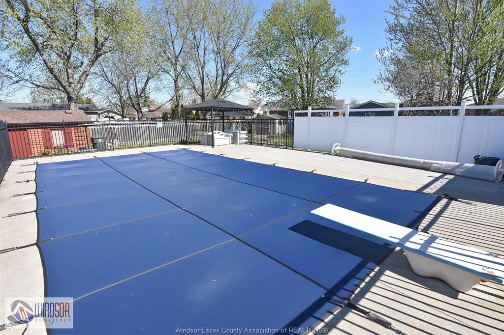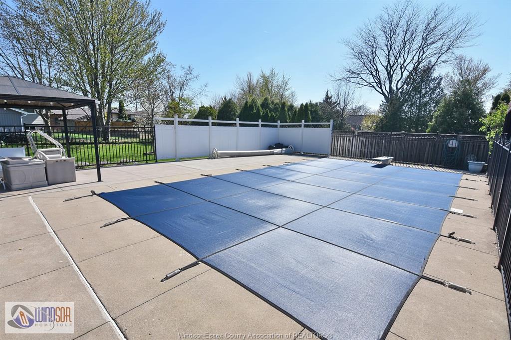 • Large fenced lot featuring an inground heated pool and stamped concrete patio.