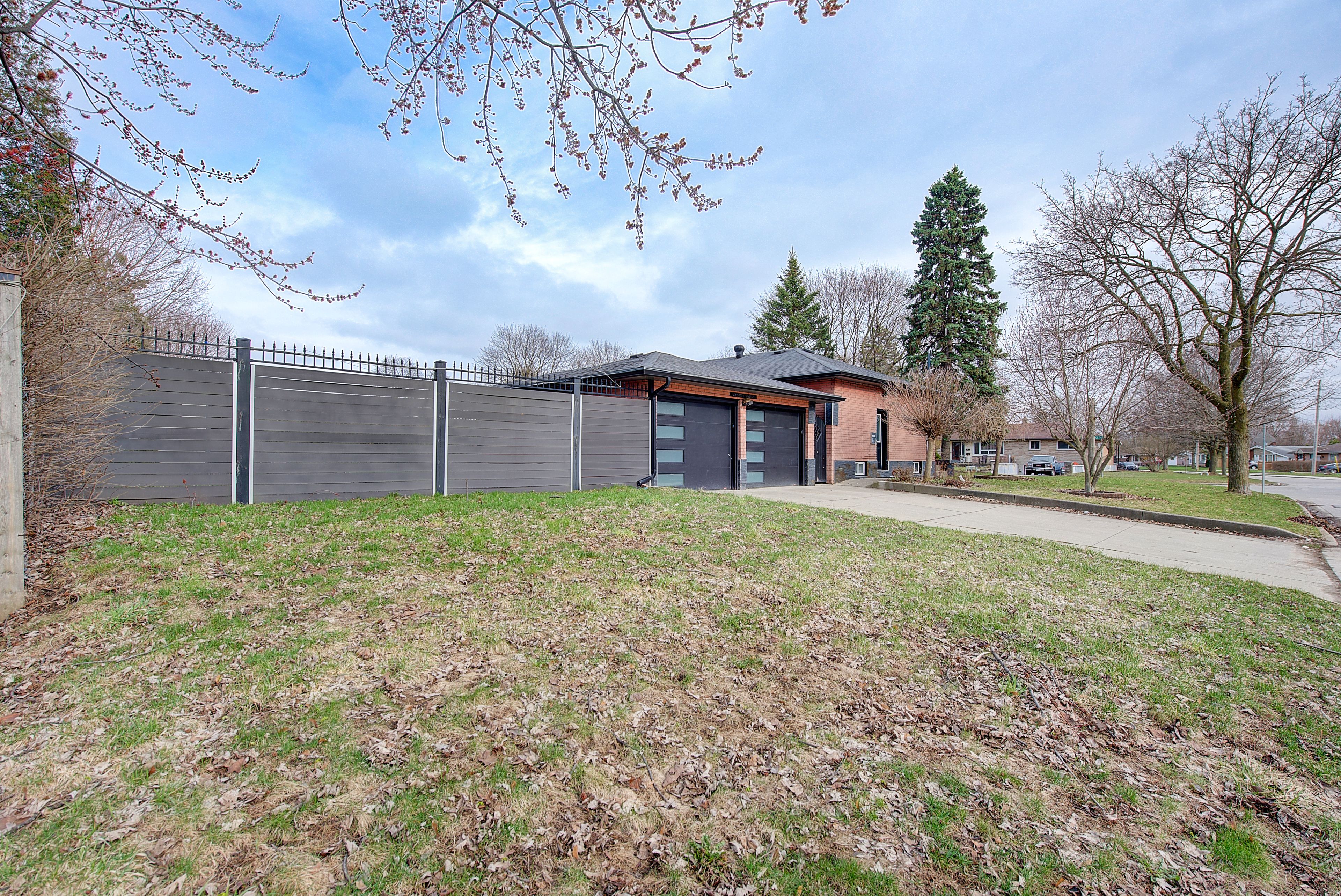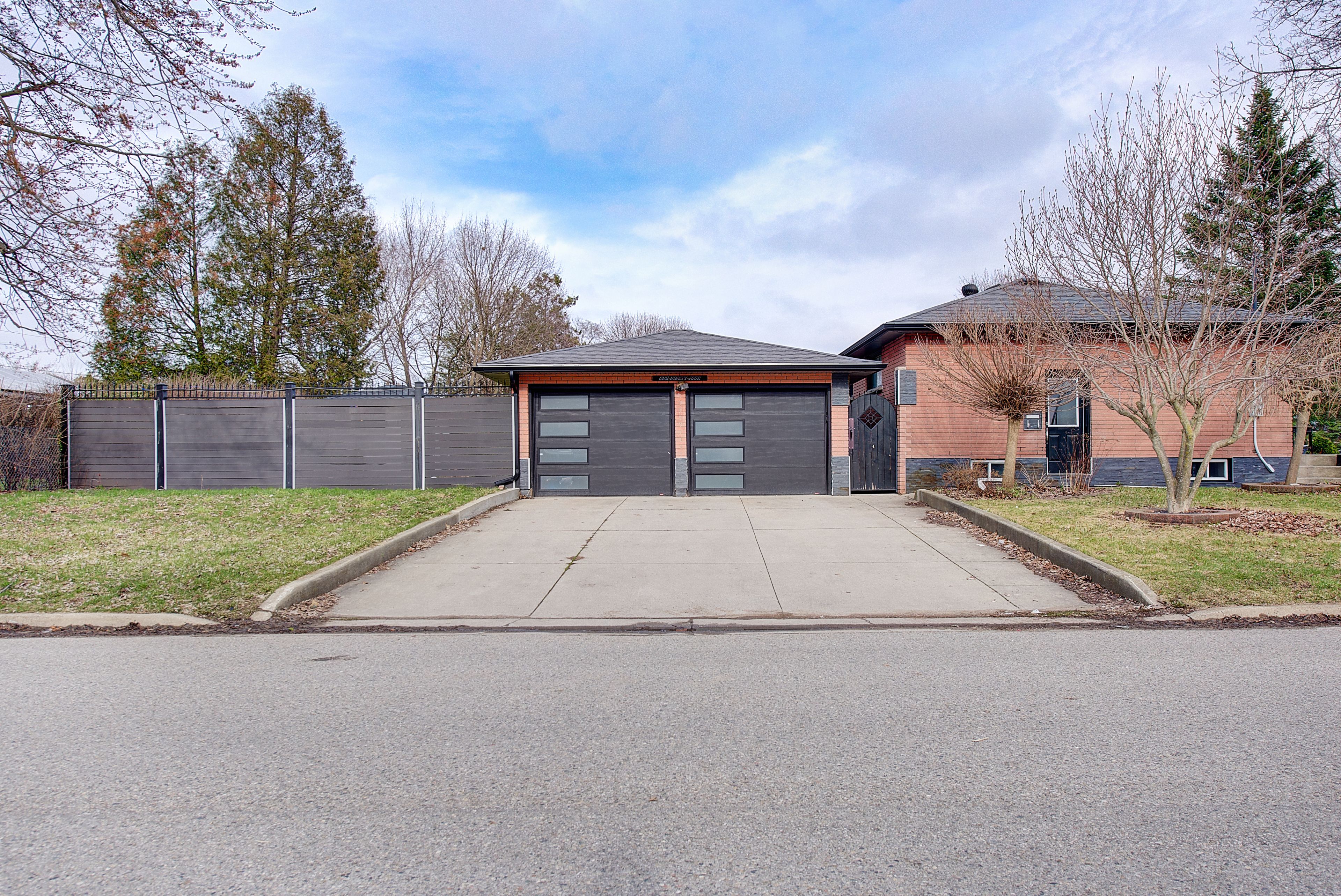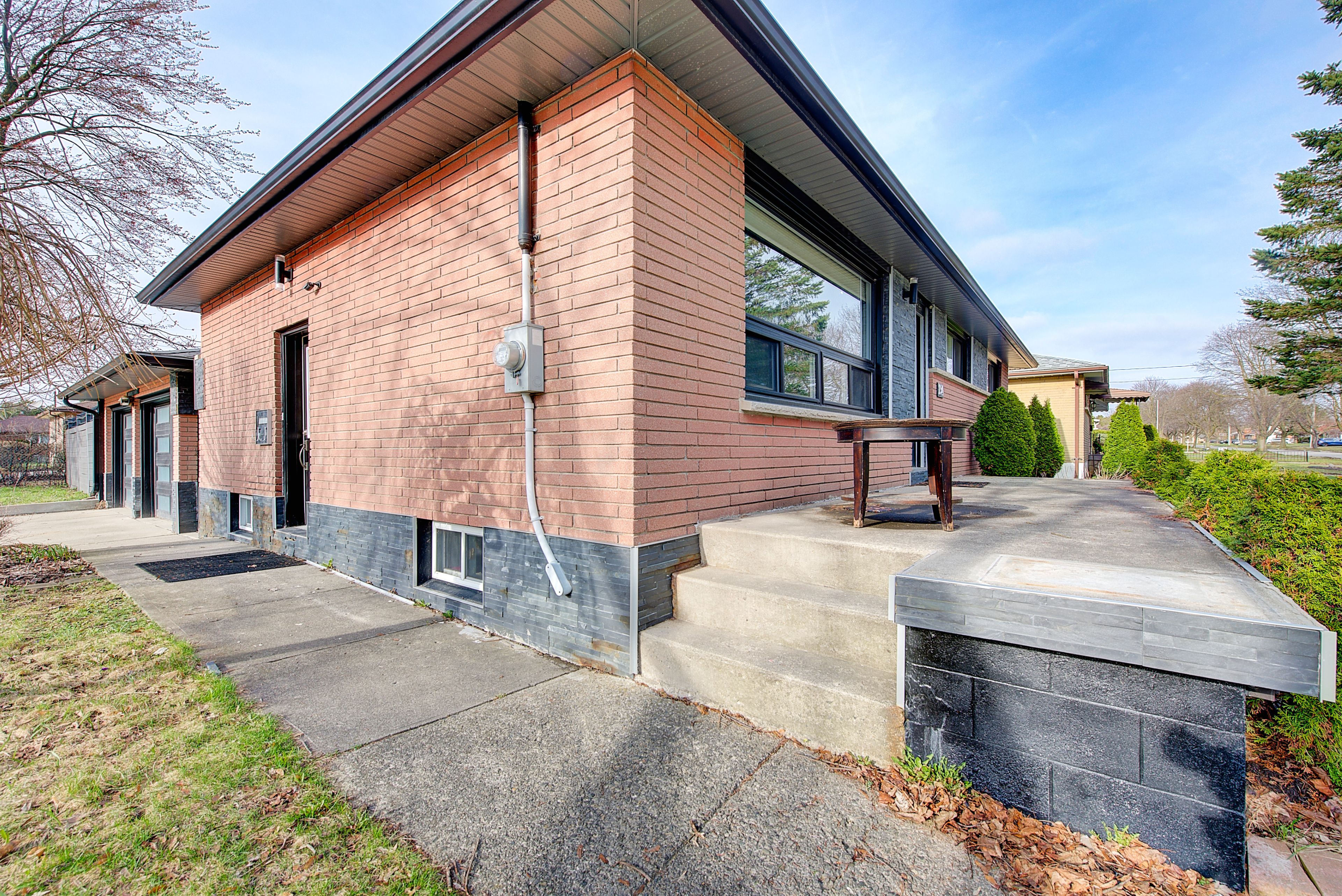 Welcome to this beautifully upgraded all-brick bungalow, perfectly situated on a spacious corner lot, offering an exceptional blend of comfort, functionality, and modern style. Designed for both everyday living and entertaining, this home features impressive exterior upgrades including insulated metal doors, gutter guards, and durable fiberglass shingles, ensuring long-lasting protection and peace of mind. The concrete driveway accommodates up to 4 vehicles, while the insulated, powered 2-car detached garage offers additional parking or an ideal workshop/mancave. Inside, the home showcases meticulous attention to detail with elegant porcelain and premium laminate flooring, complemented by cedar ceiling accents and energy-efficient led lighting throughout. The bright and inviting living room is enhanced by an oversized picture window, filling the space with natural light. The kitchen is thoughtfully designed with ample cabinetry, upgraded thick granite countertops, and a central island with gas range, along with a cozy dinette perfect for casual dining. The expansive primary suite has been reimagined by combining two bedrooms into one luxurious retreat, featuring dual closets, an electric fireplace, a jetted tub, and convenient ensuite access to the main bathroom. The fully finished lower level offers exceptional versatility with a separate entrance, making it ideal for an in-law suite or income potential. It includes plumbing and hydro for a future kitchen, a bedroom with egress window, a full bathroom, and a dedicated laundry area. Additional highlights include an owned on-demand water heater (no rental fees), abundant storage space, and a large cold room. Step outside to a private backyard oasis featuring a hardscape patio, powered shed, and low-maintenance composite fencing-perfect for relaxing or entertaining. A rare opportunity to own a thoughtfully upgraded home offering space, flexibility, and long-term value