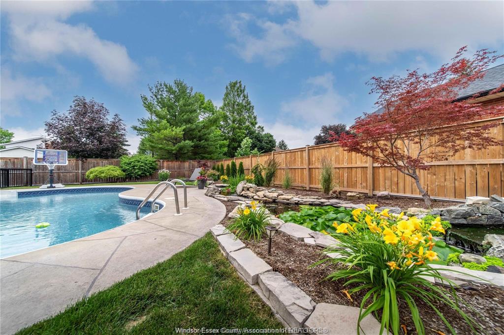 • Stunning backyard with heated pool, hot tub, koi pond, and fire pit.