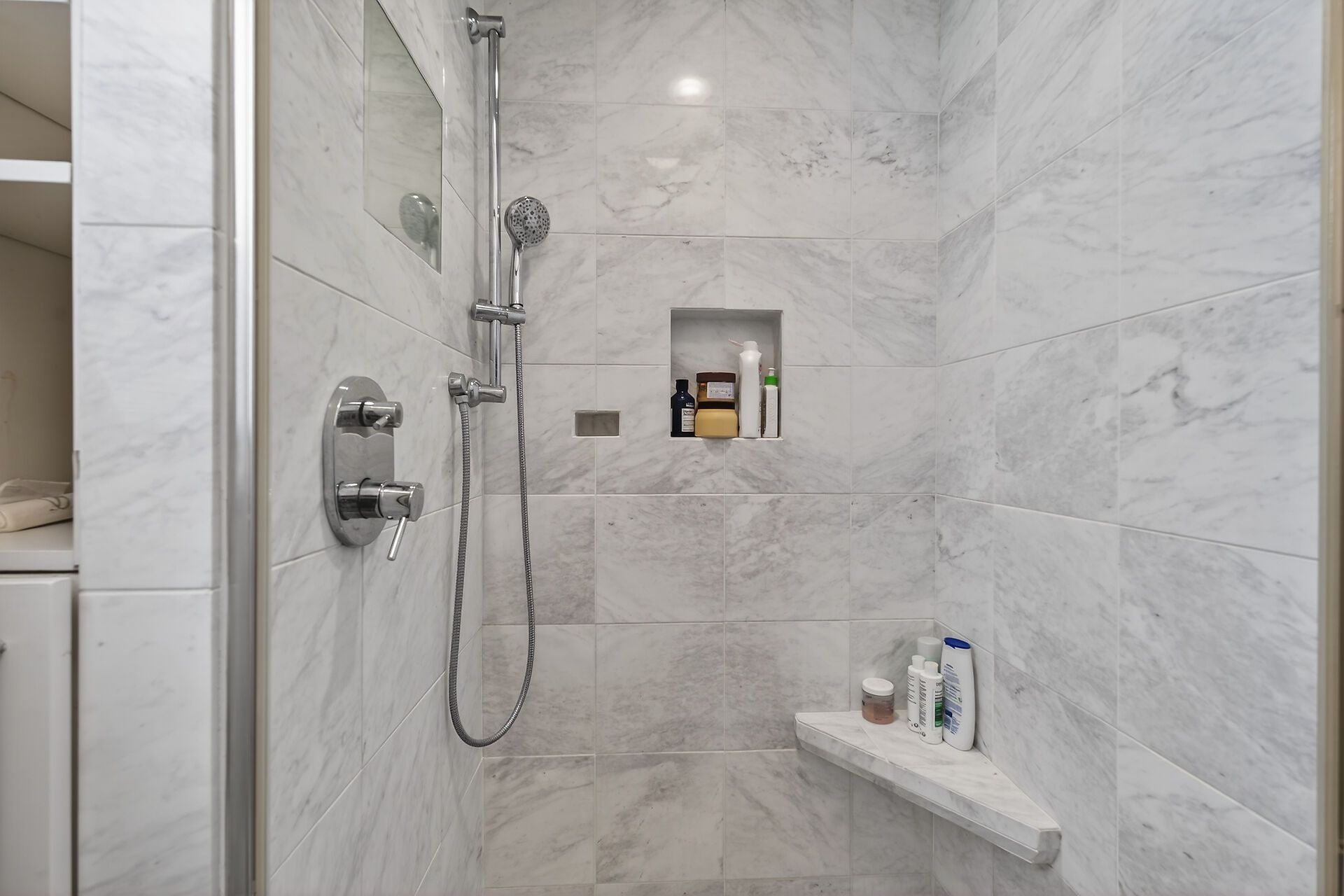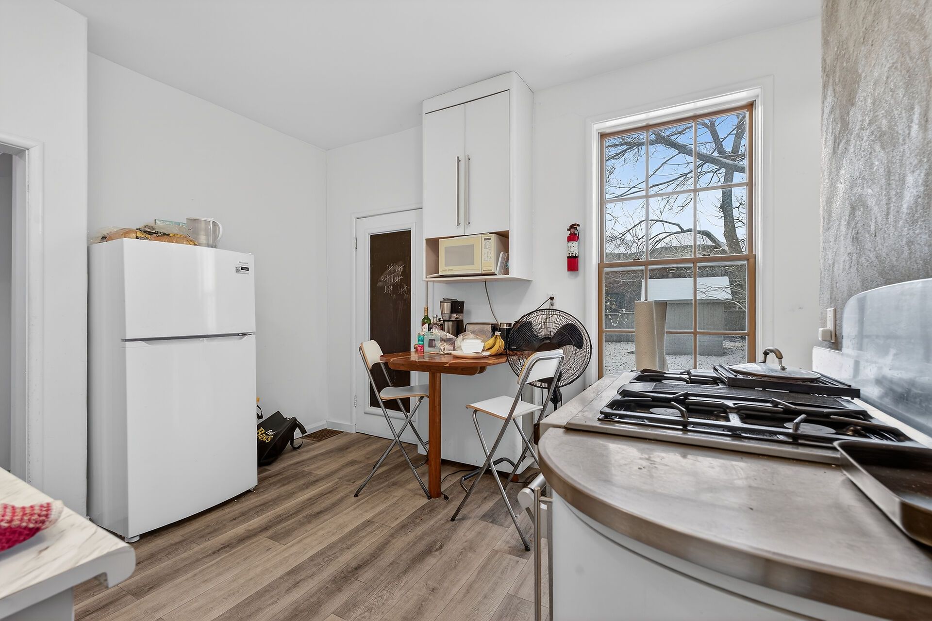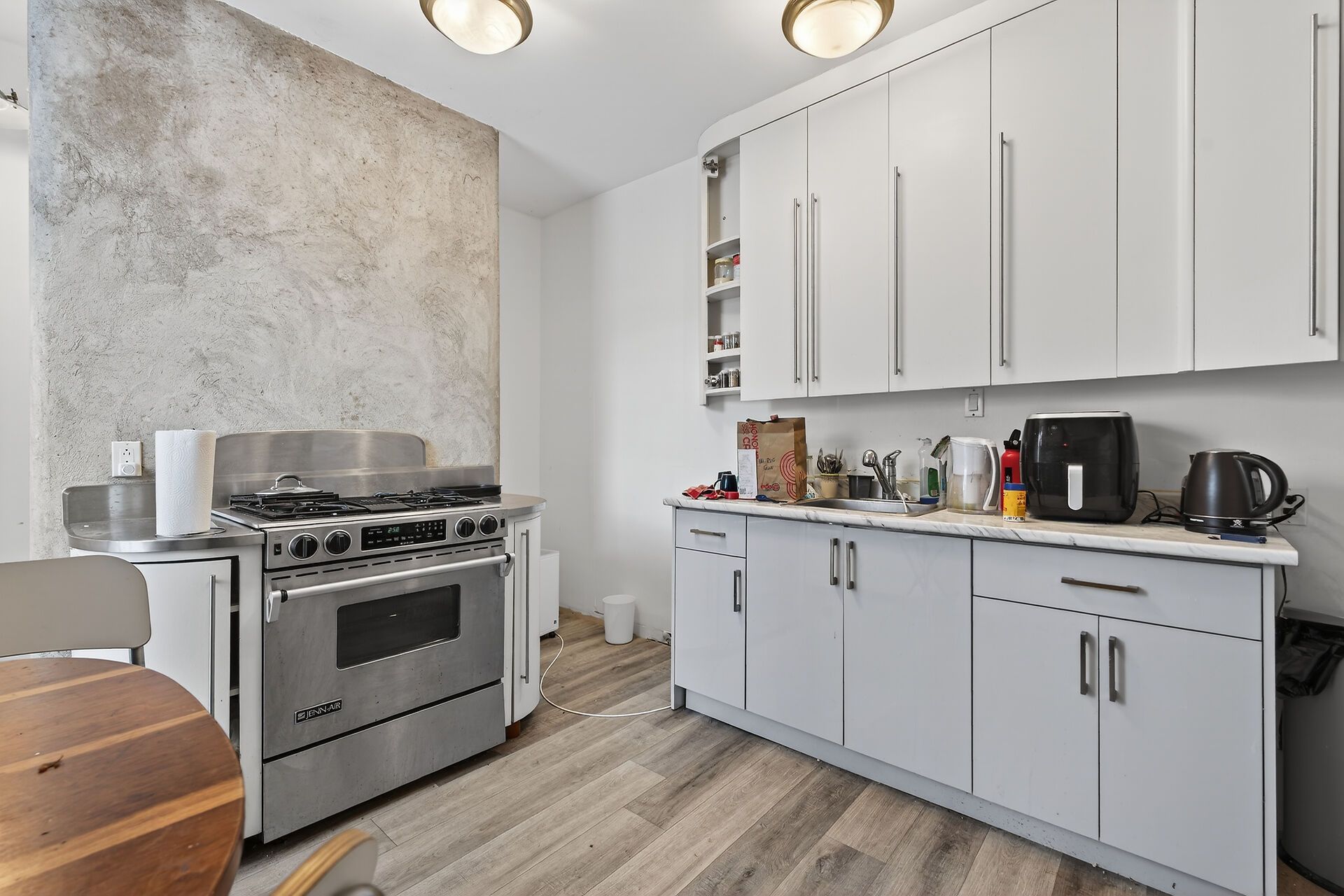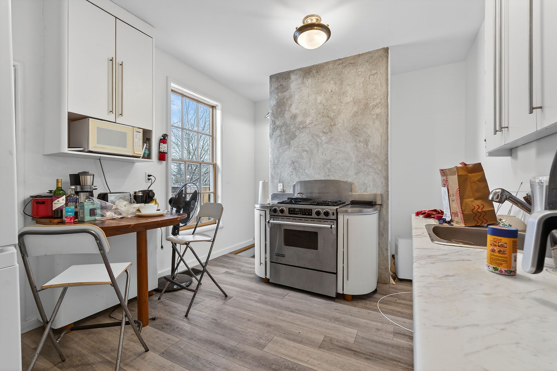 • Updated kitchen with plenty of cabinetry and a stainless-steel gas stove.