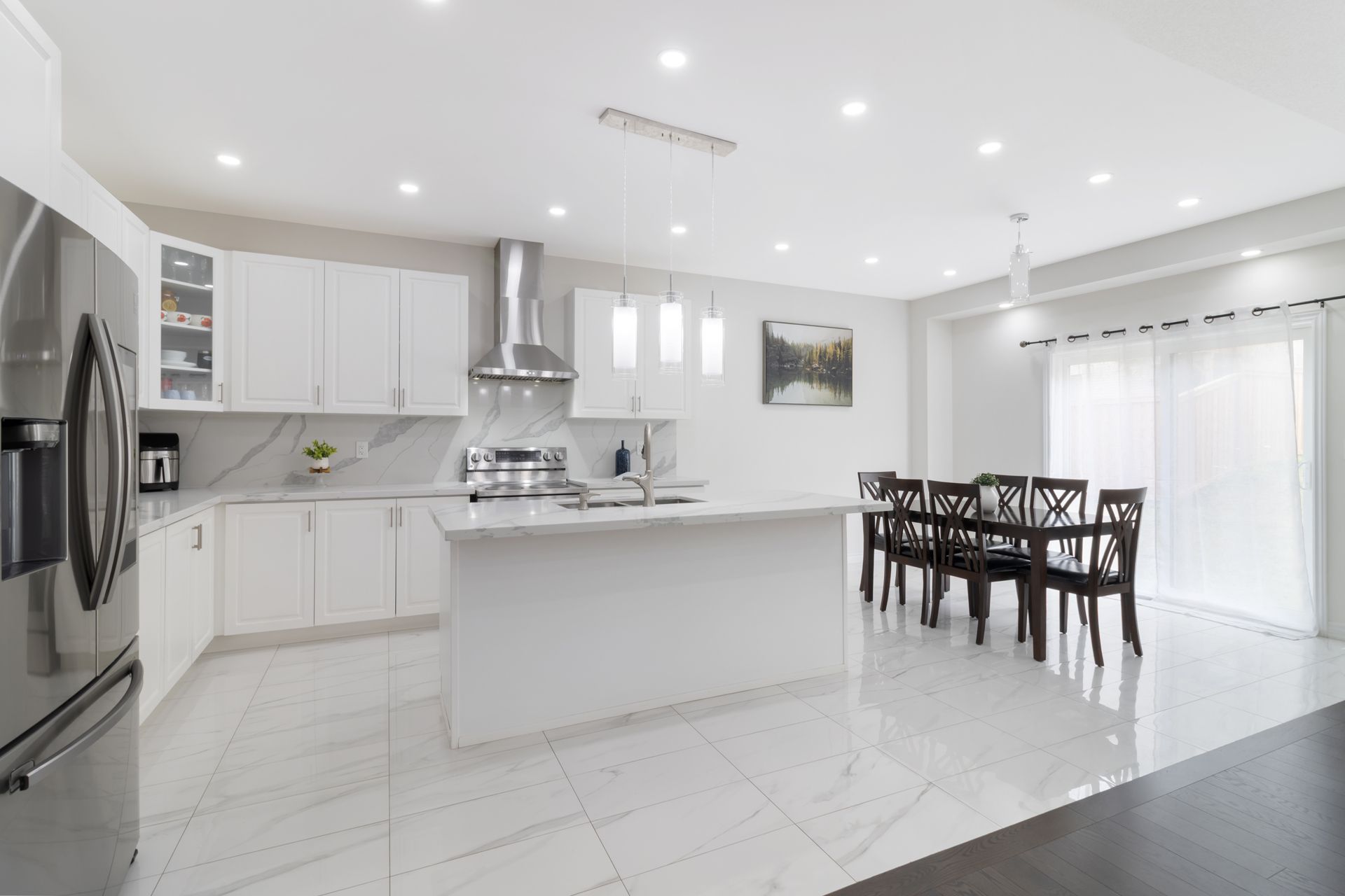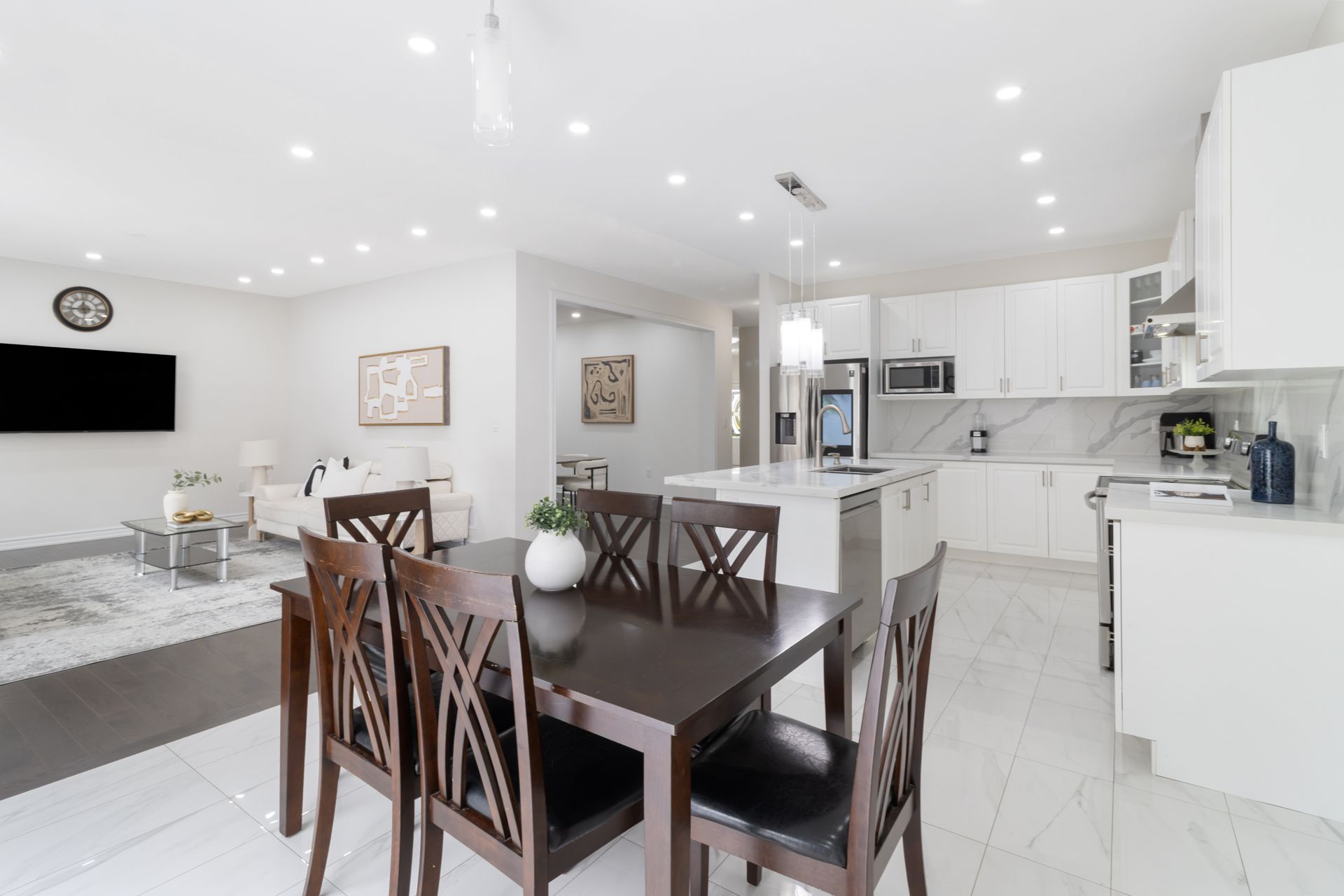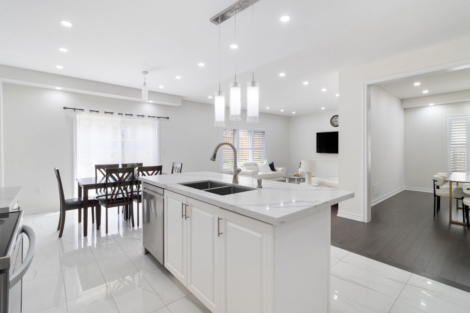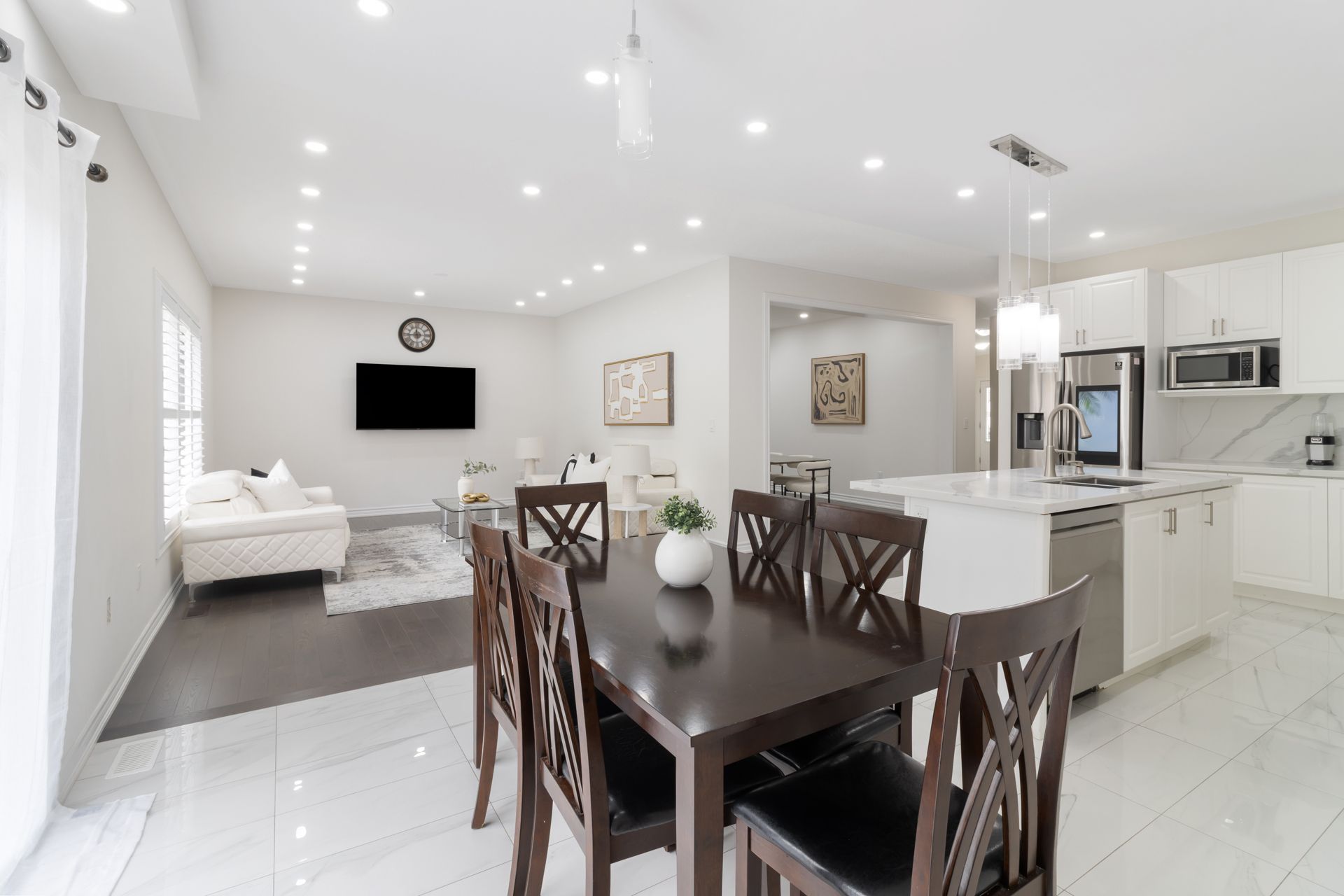 • Bright main floor with open layout, pot lights, and chef-inspired kitchen.