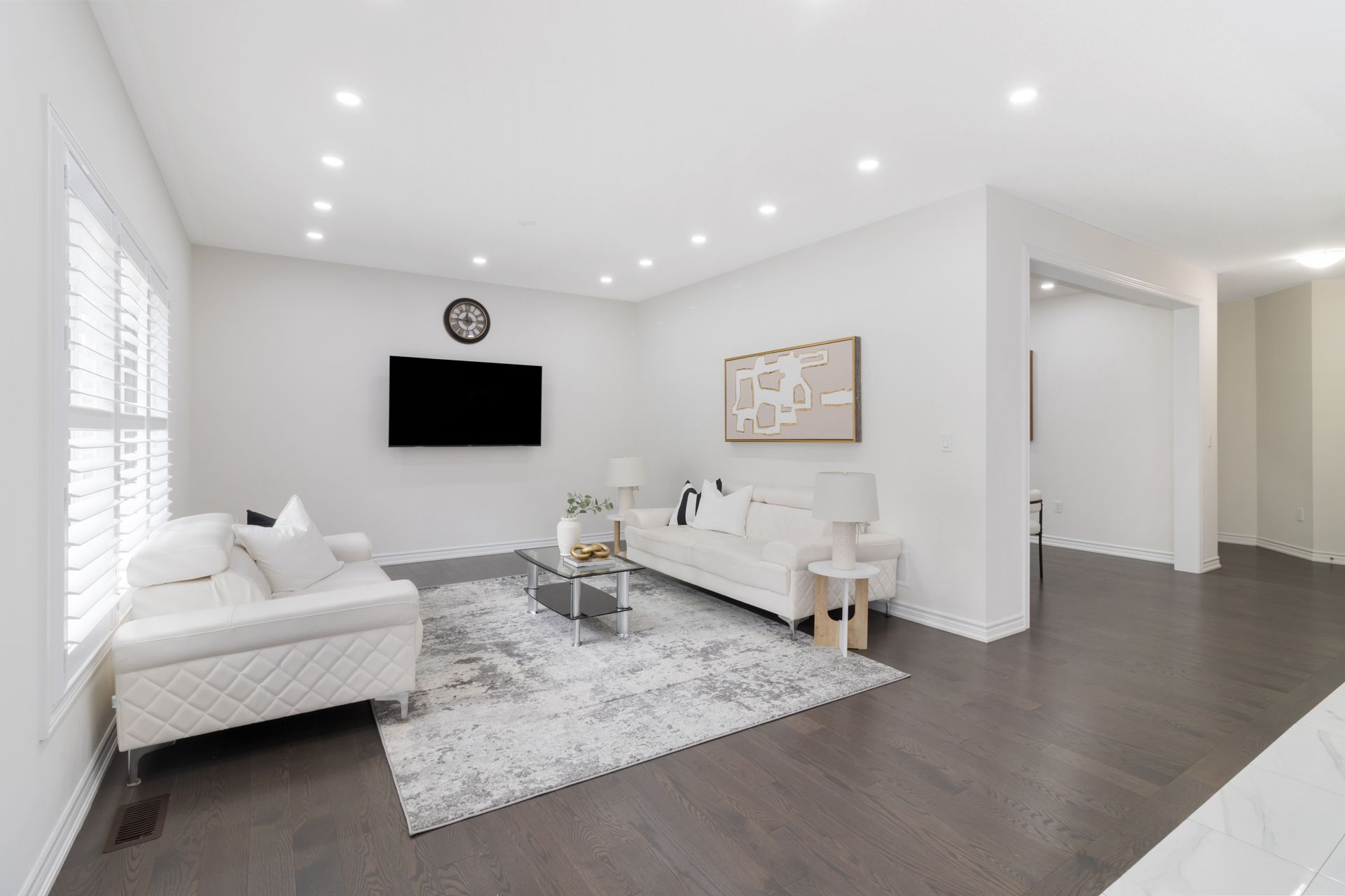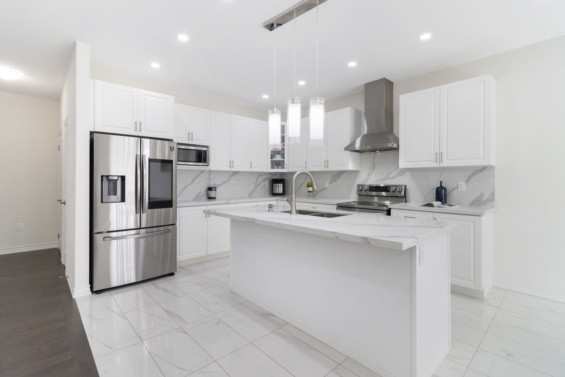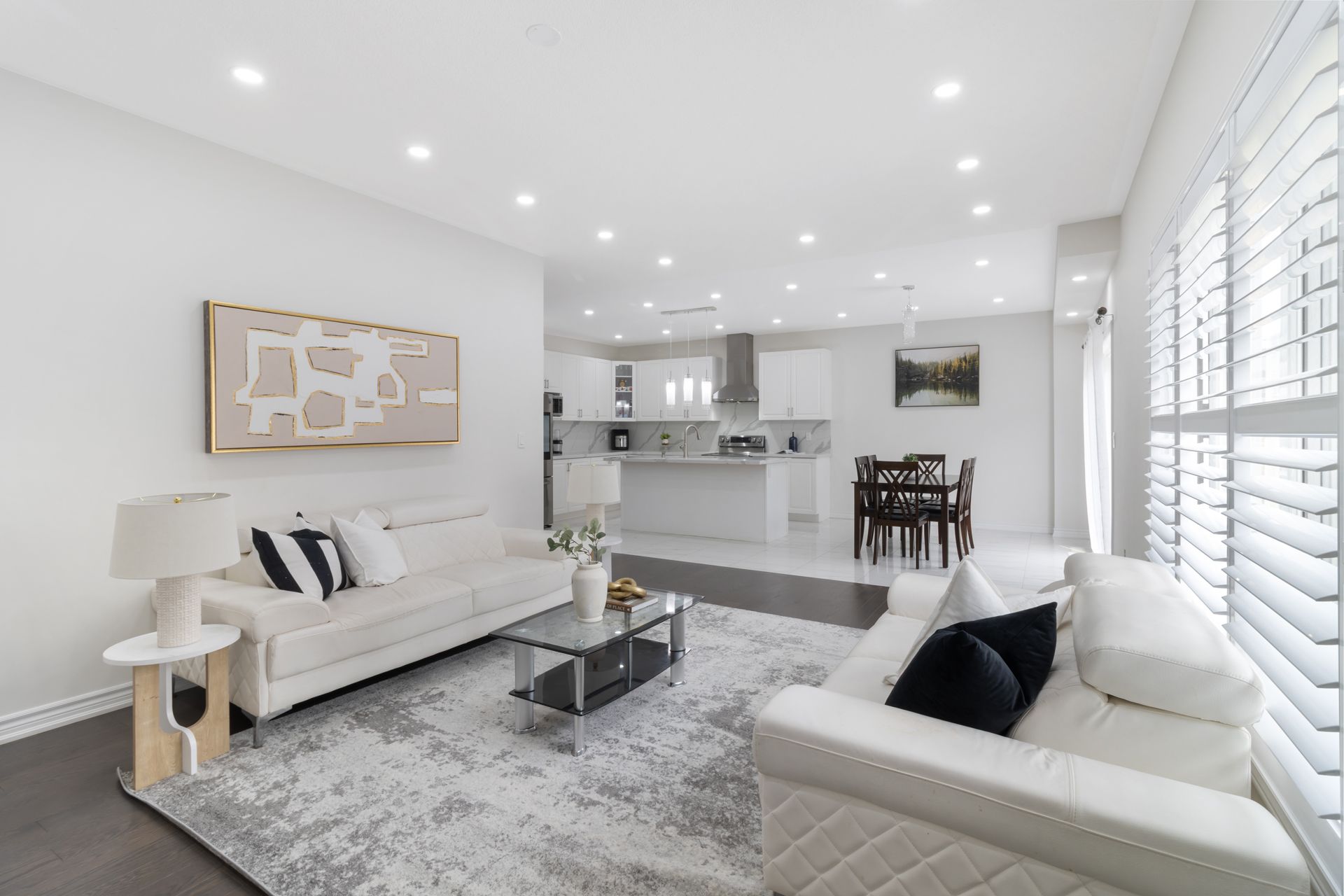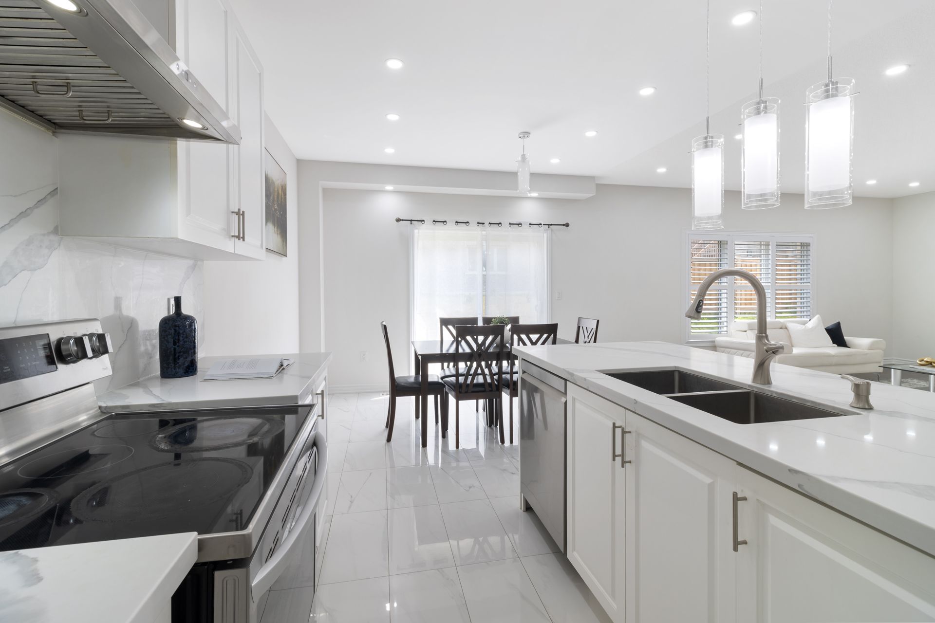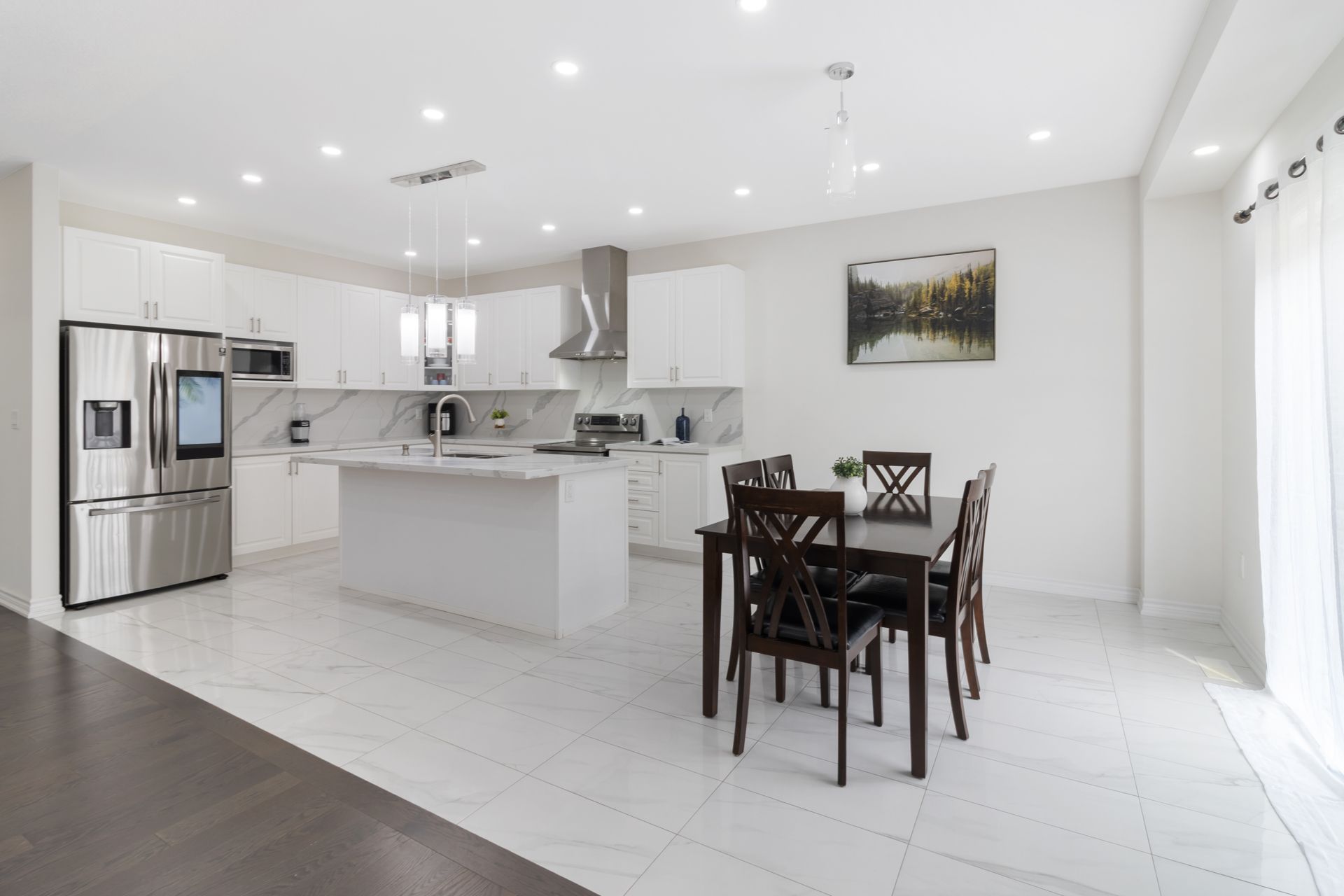 • Bright main floor with open layout, pot lights, and chef-inspired kitchen.