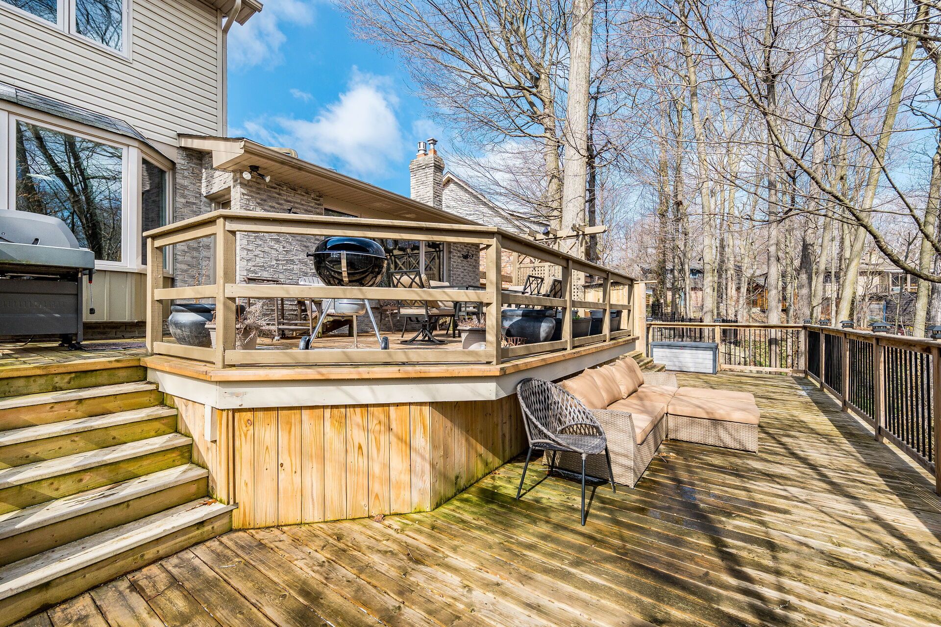 • Backyard oasis with multi-level deck, patio, and hot tub for relaxation.