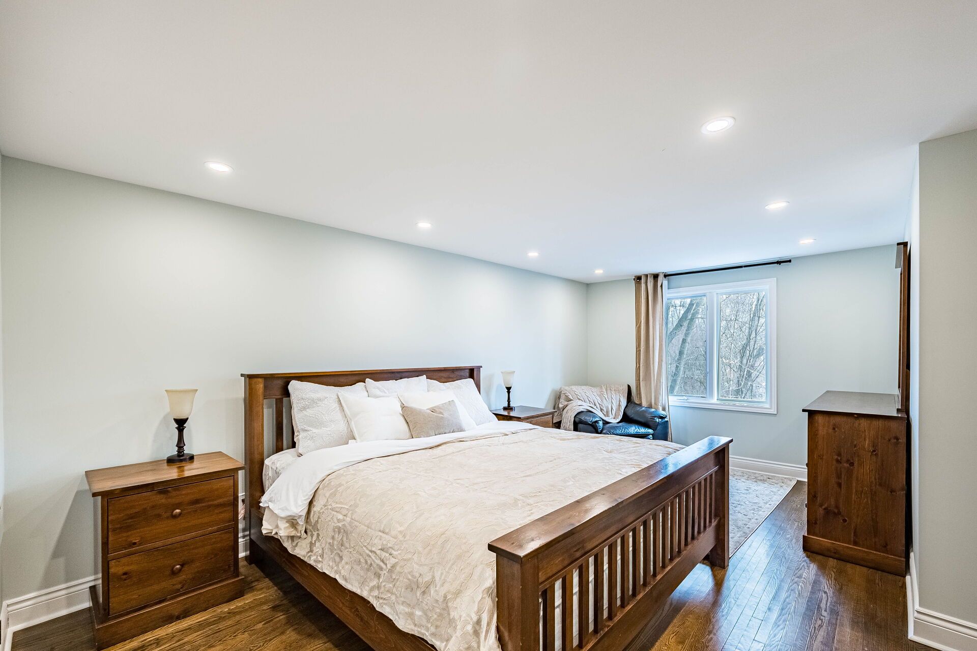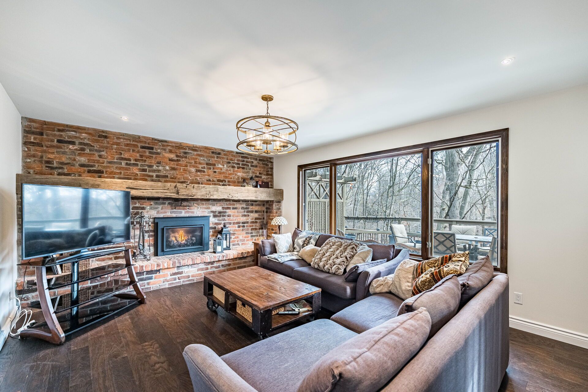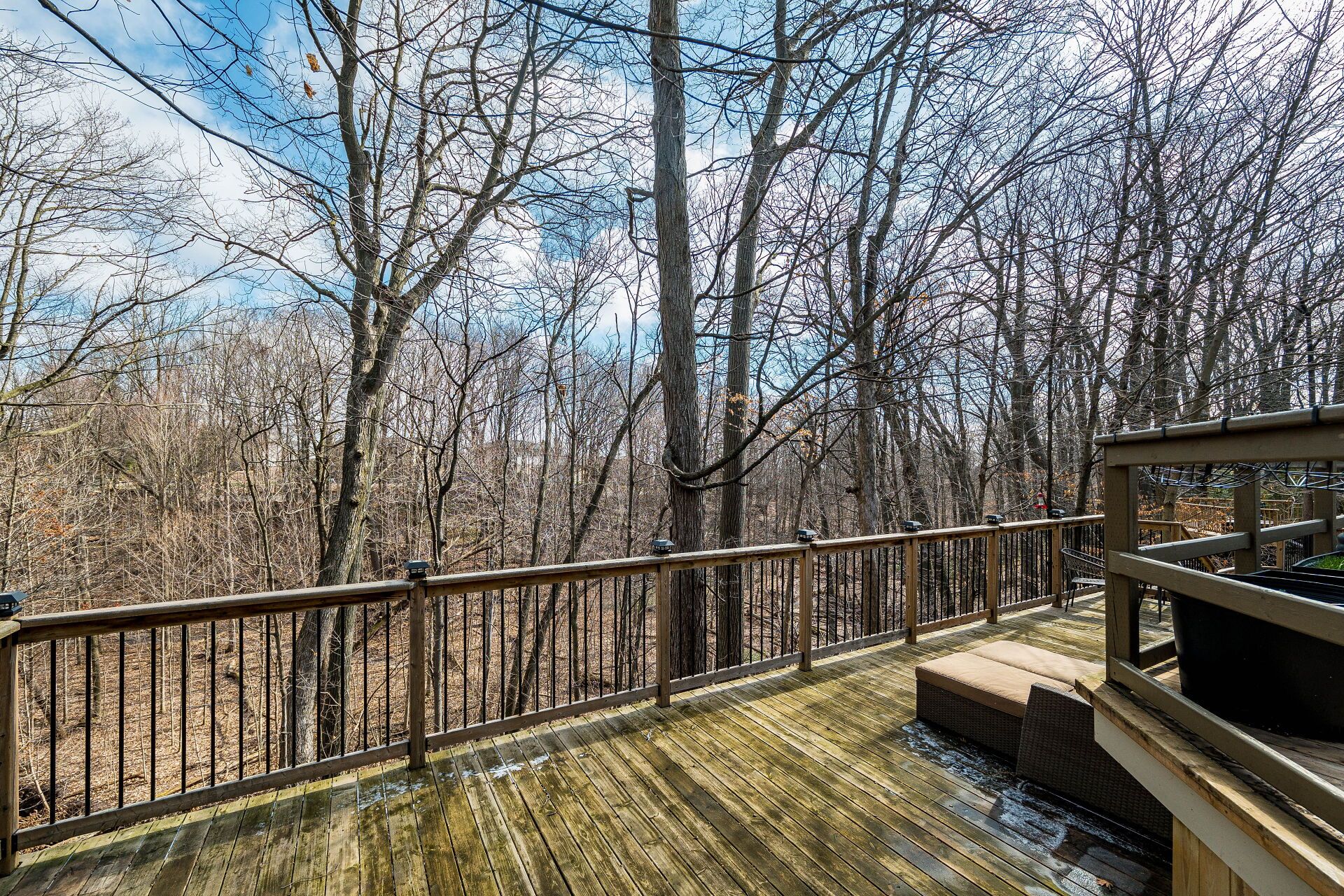 • Three large bedrooms with hardwood floors and serene ravine views.