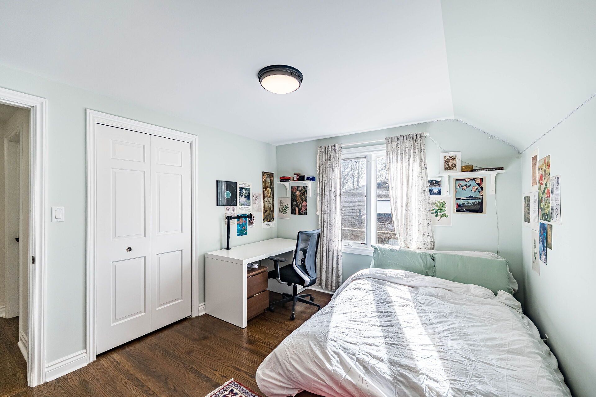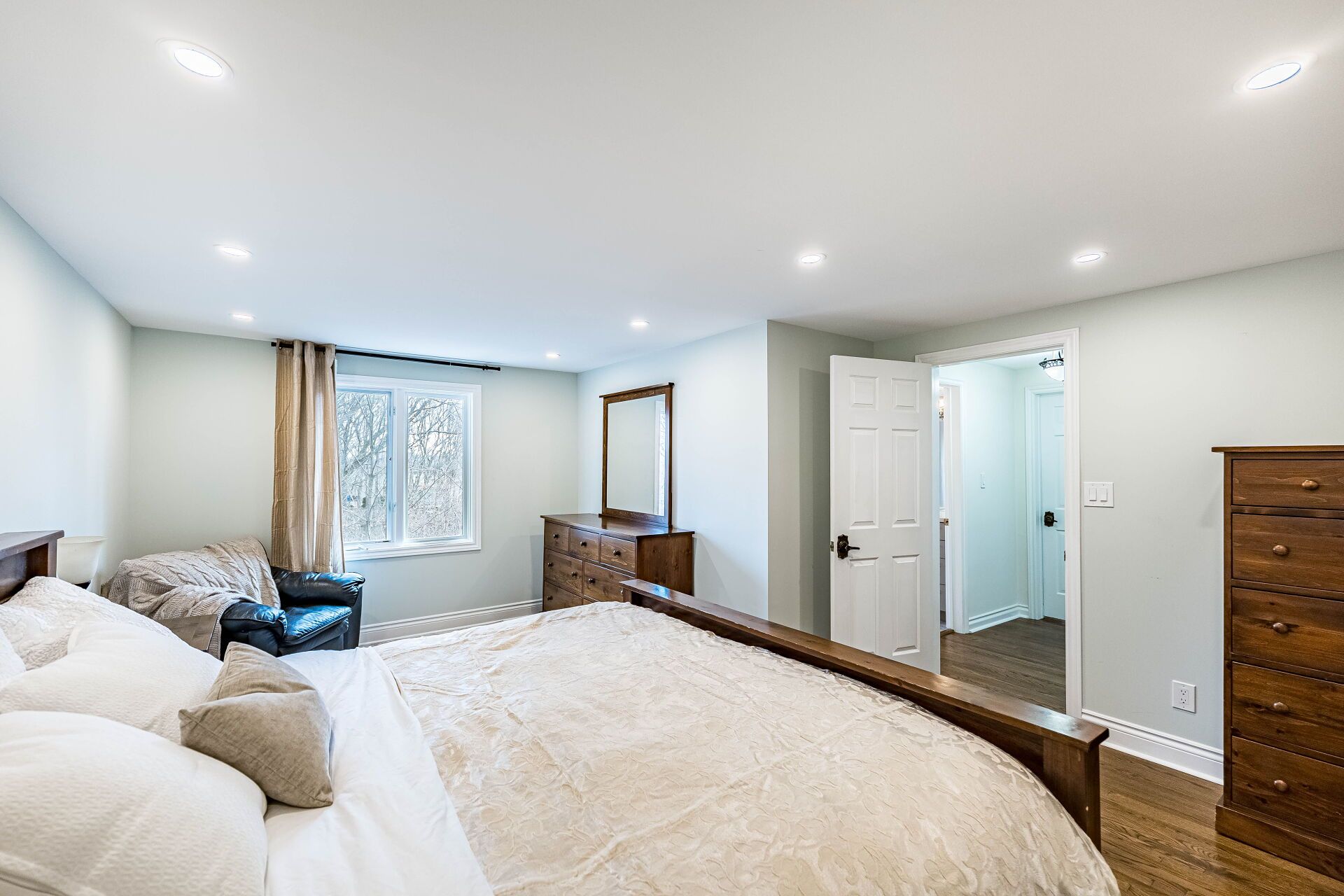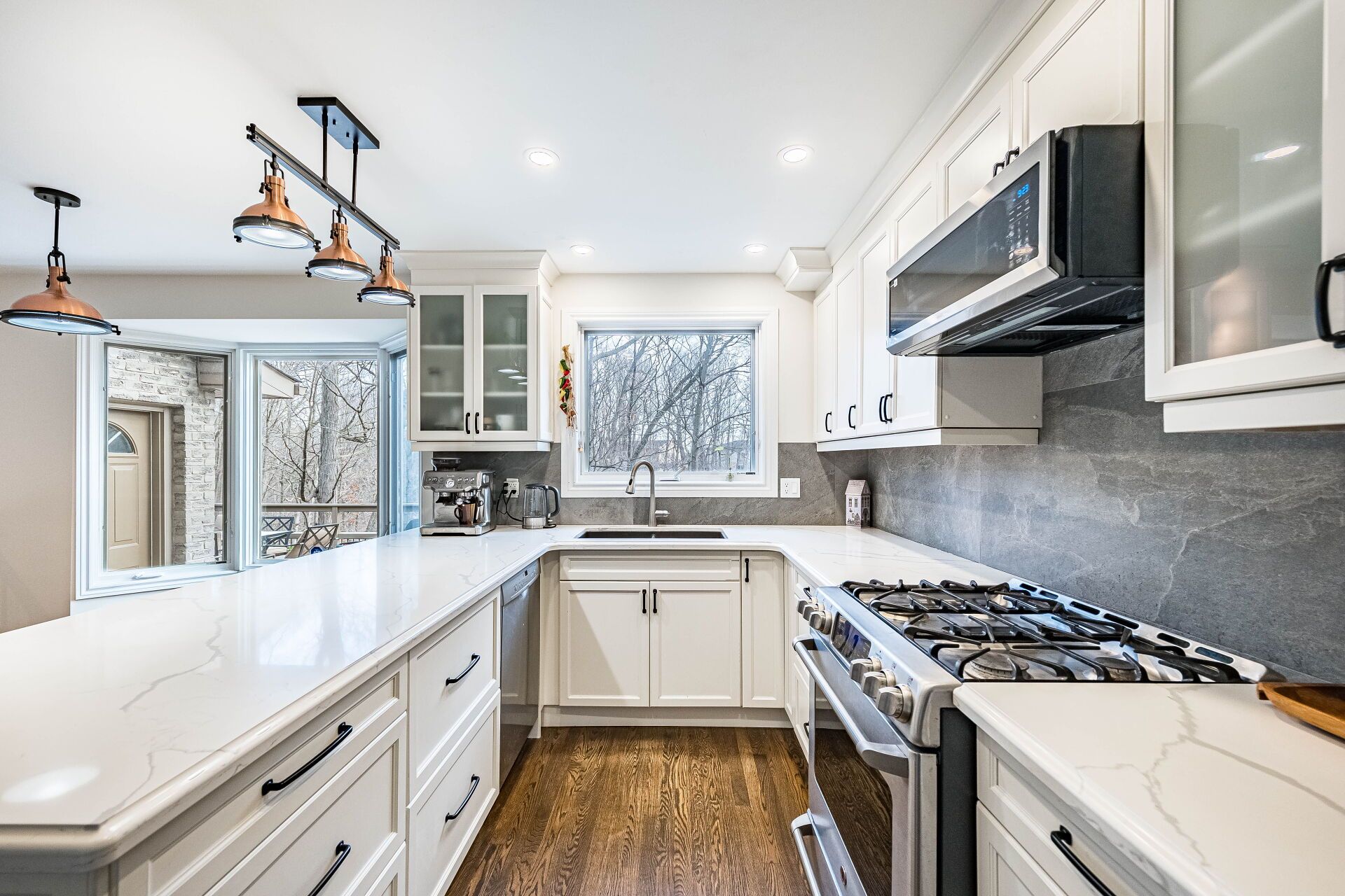 • Three large bedrooms with hardwood floors and serene ravine views.