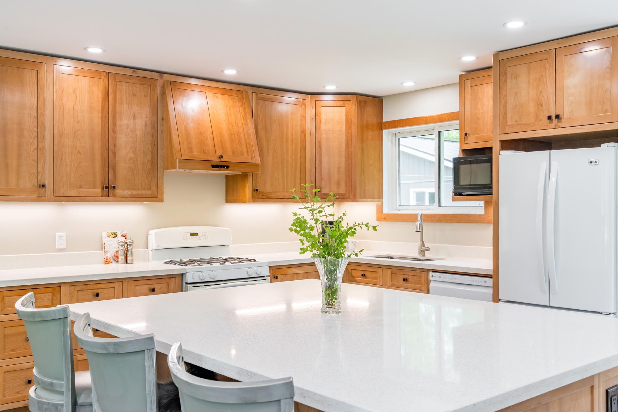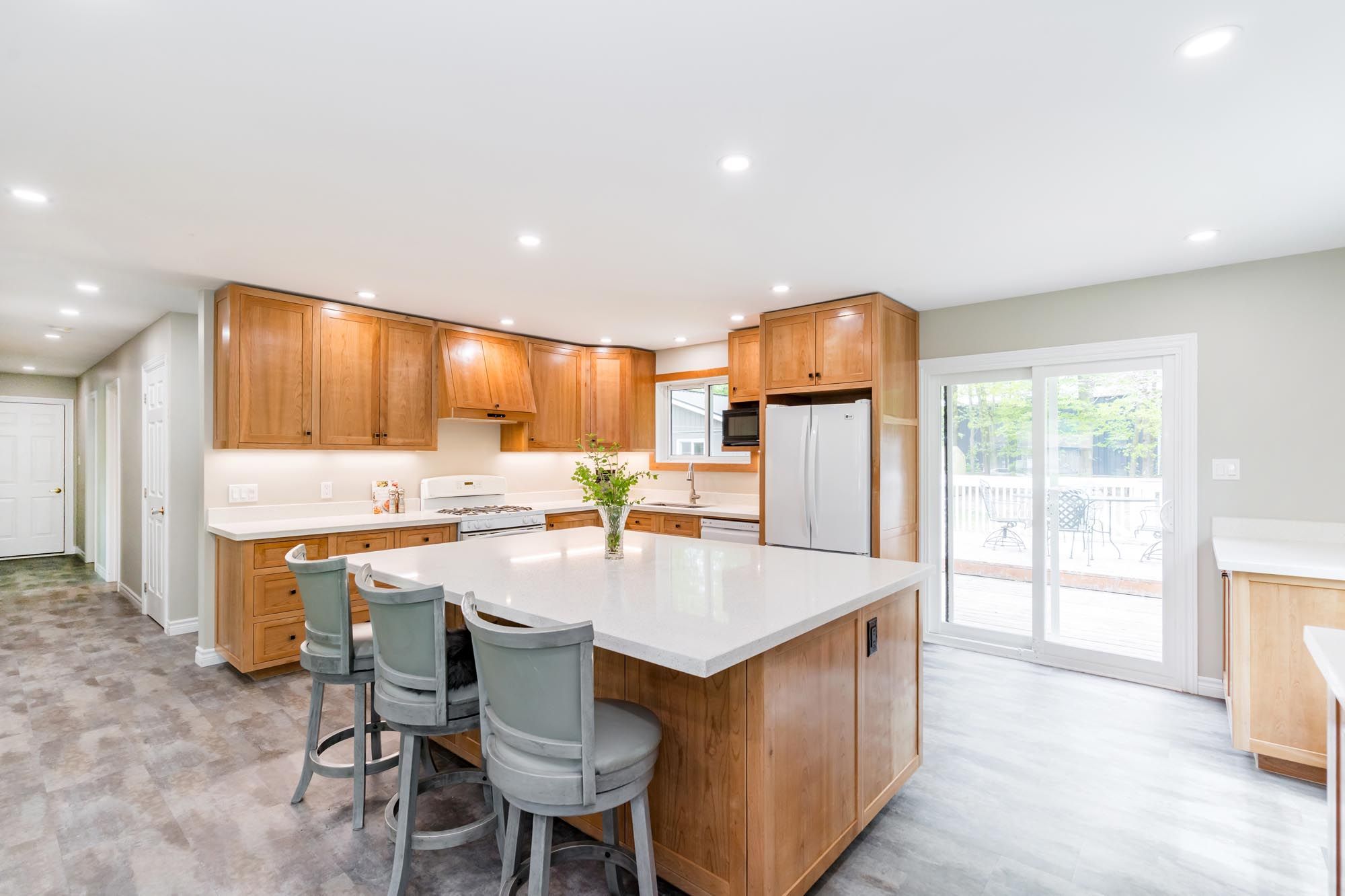 • Custom cherry wood kitchen with large island, great for entertaining and family gatherings.