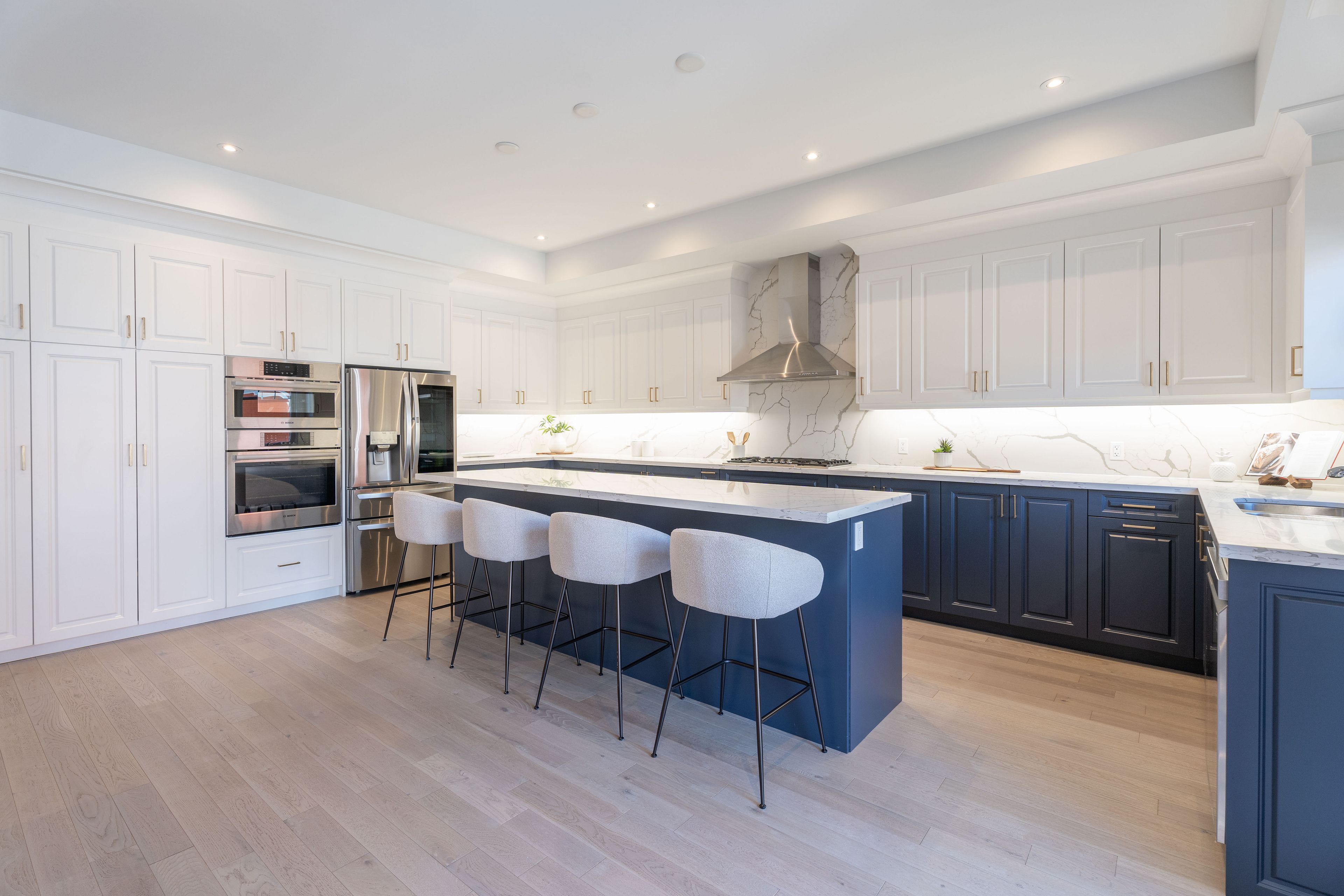 • State-of-the-art kitchen with oversized island and built-in stainless steel appliances.
