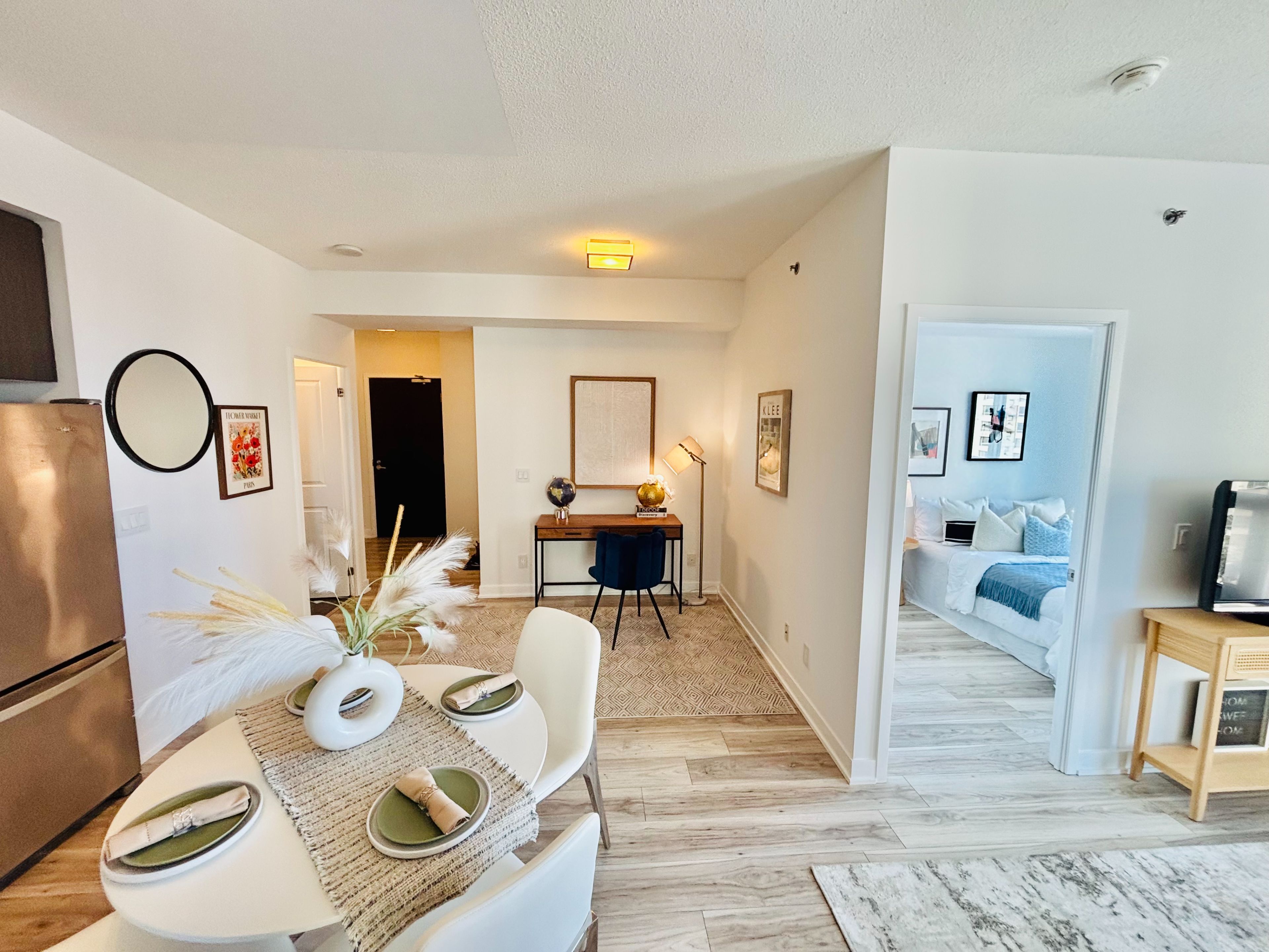 • Modern kitchen features stainless steel appliances and granite countertops.