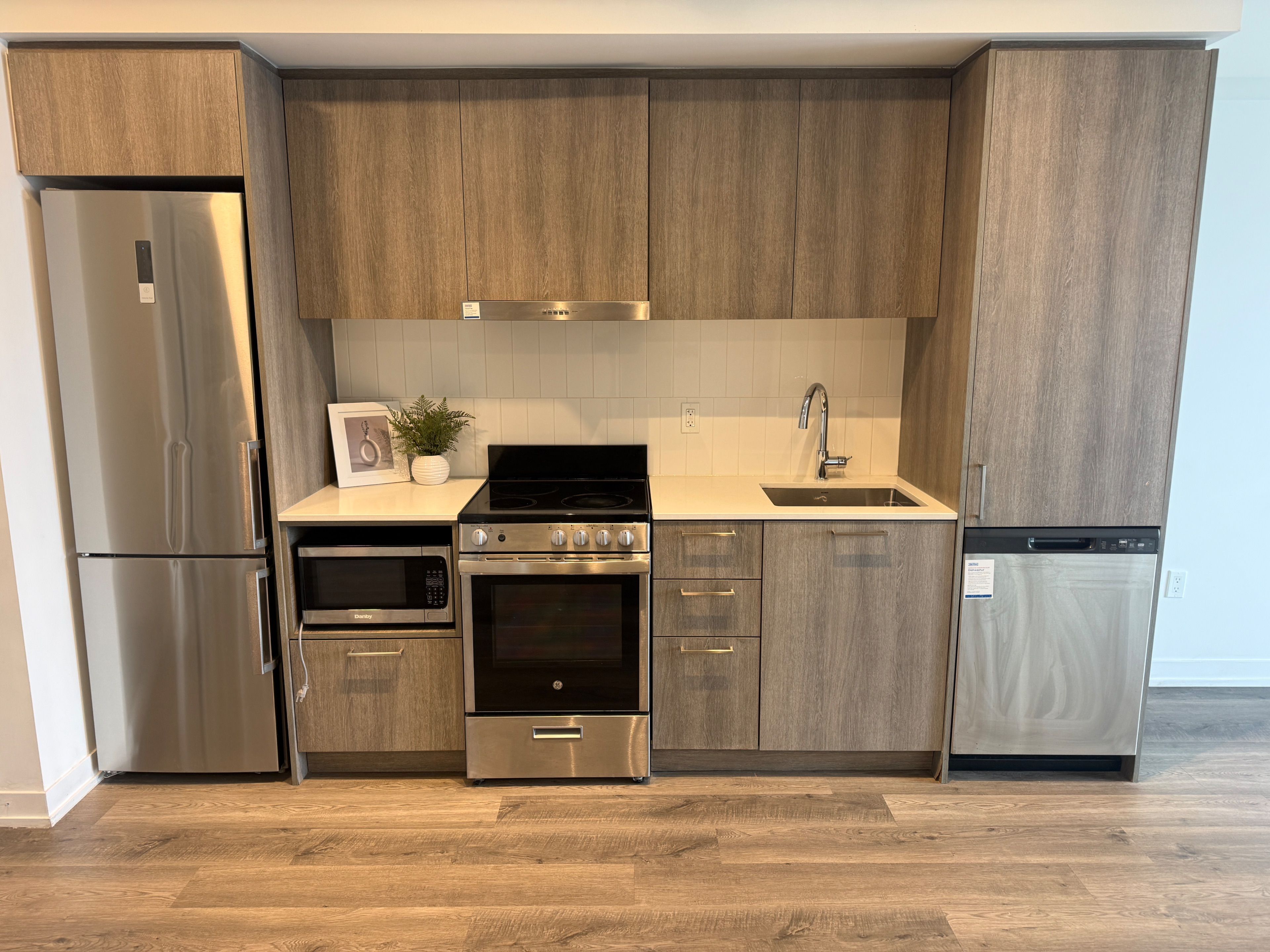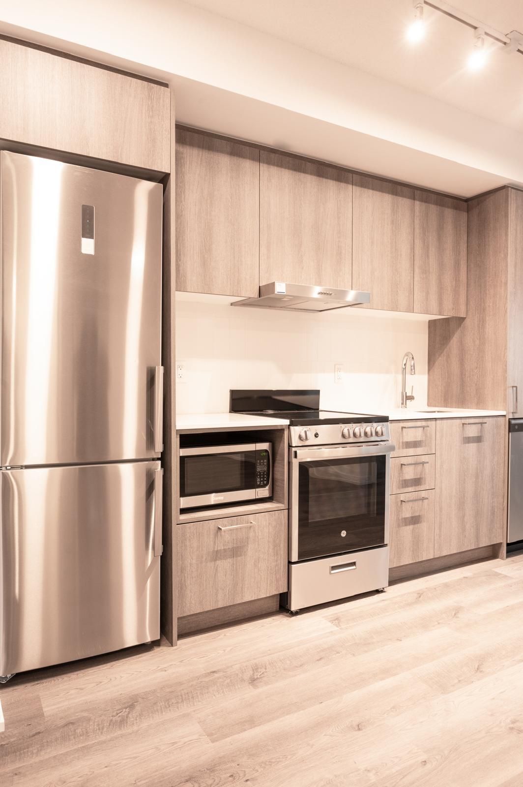 • Contemporary kitchen equipped with stainless steel appliances and quartz countertops.