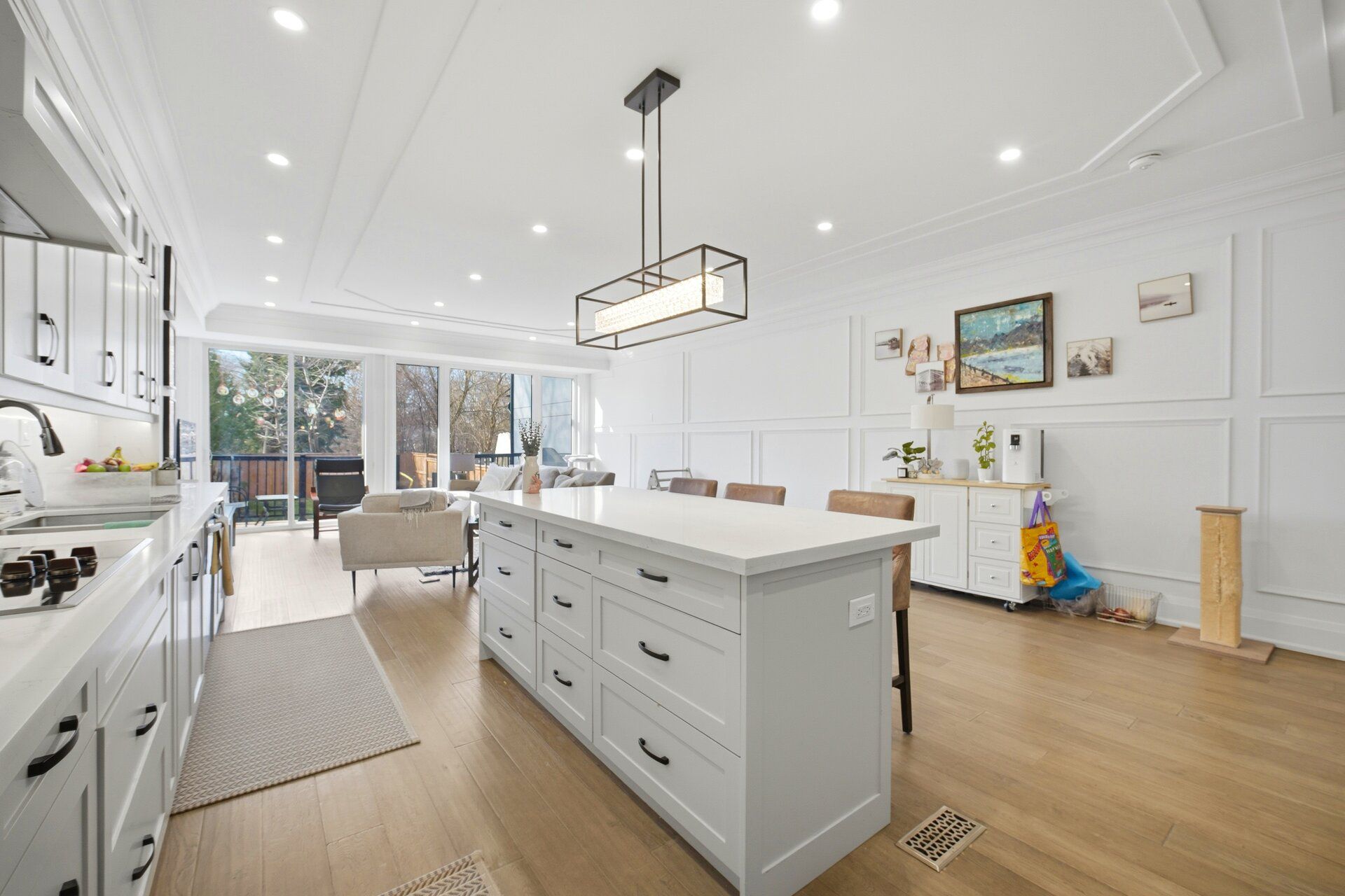 • Open-concept design with 9 ft ceilings and natural light from skylights.