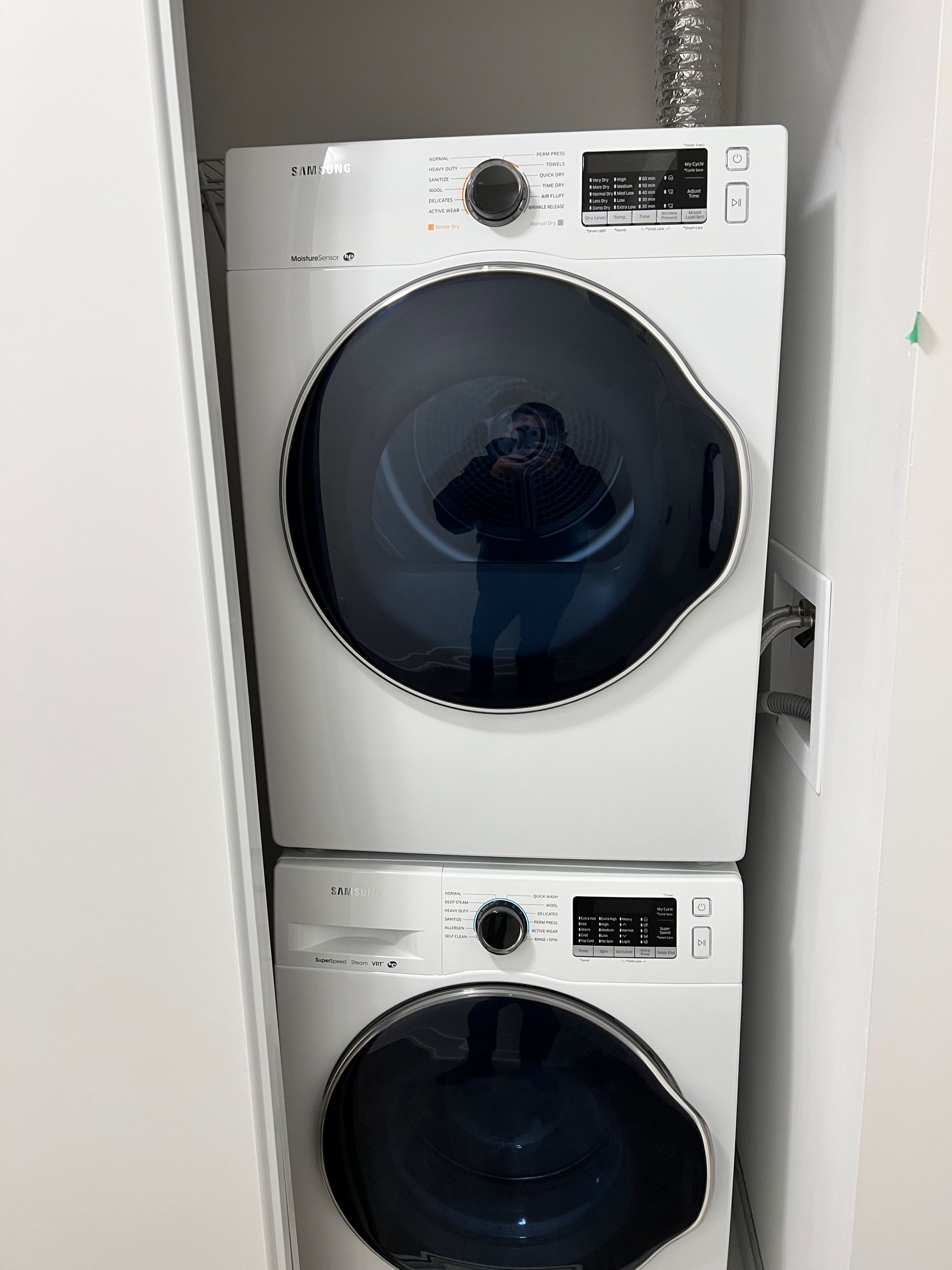 • Modern condo featuring sleek laminate flooring and spacious mirrored closet.