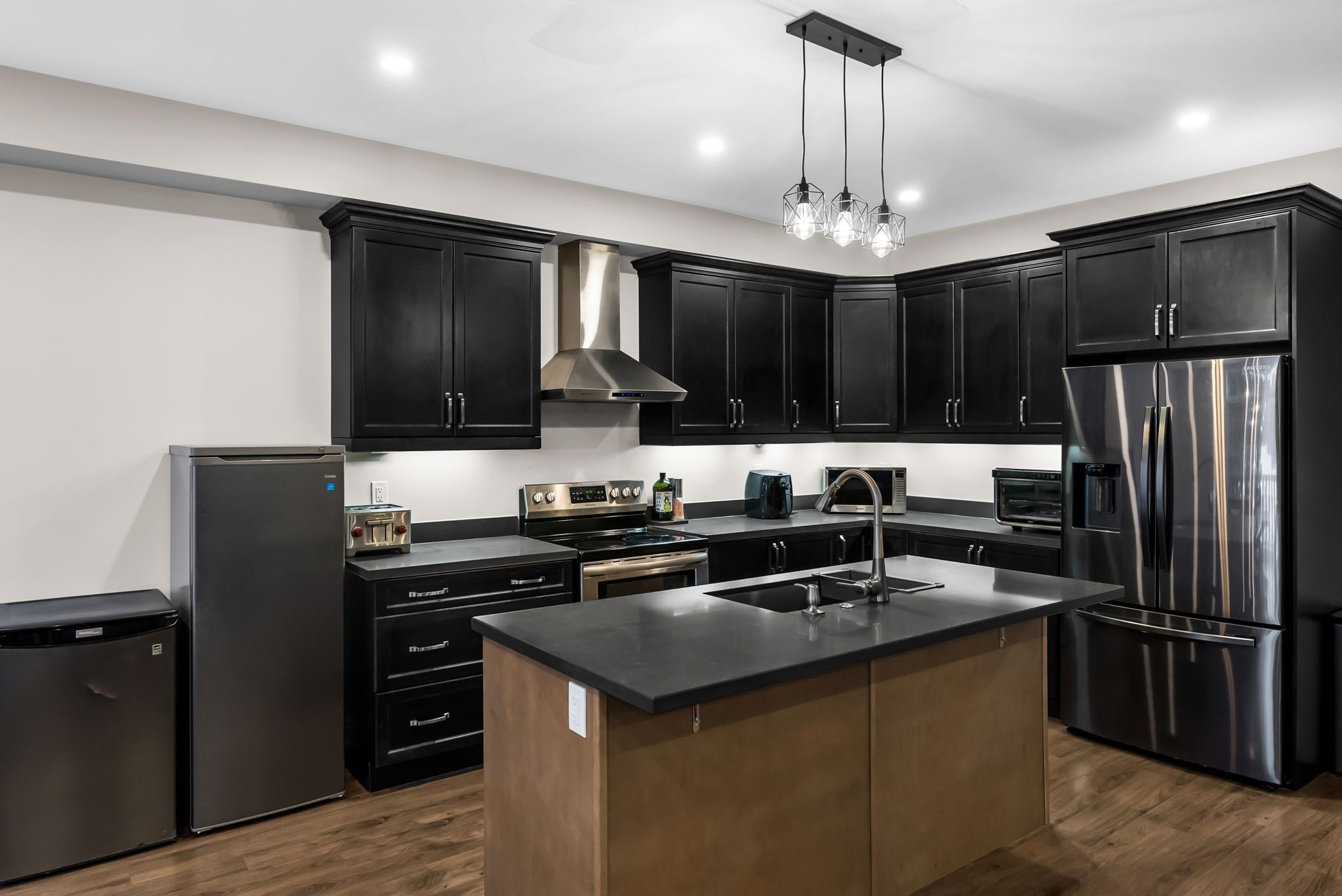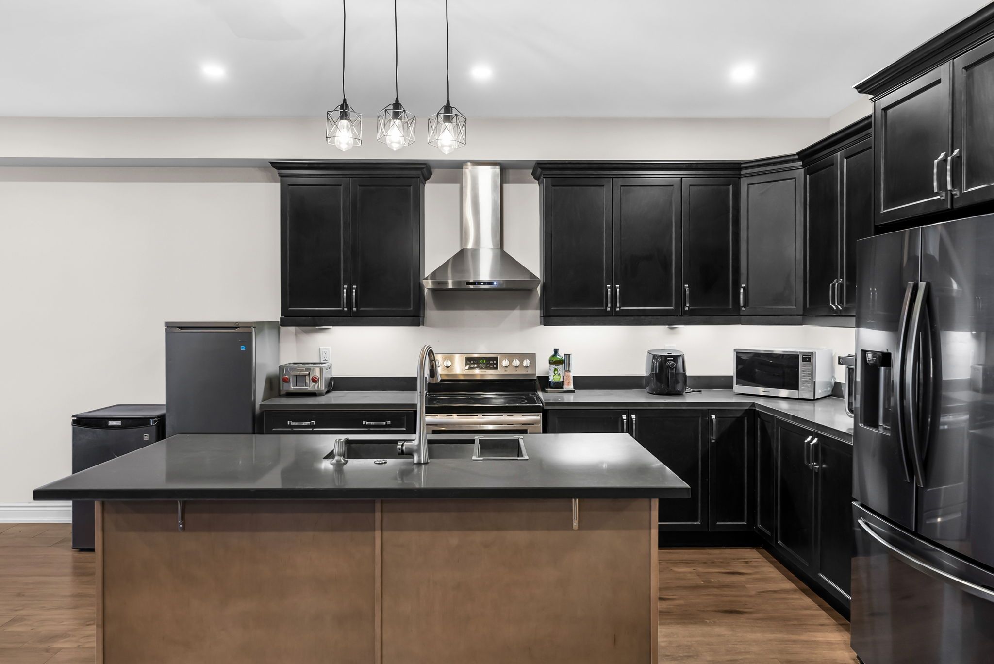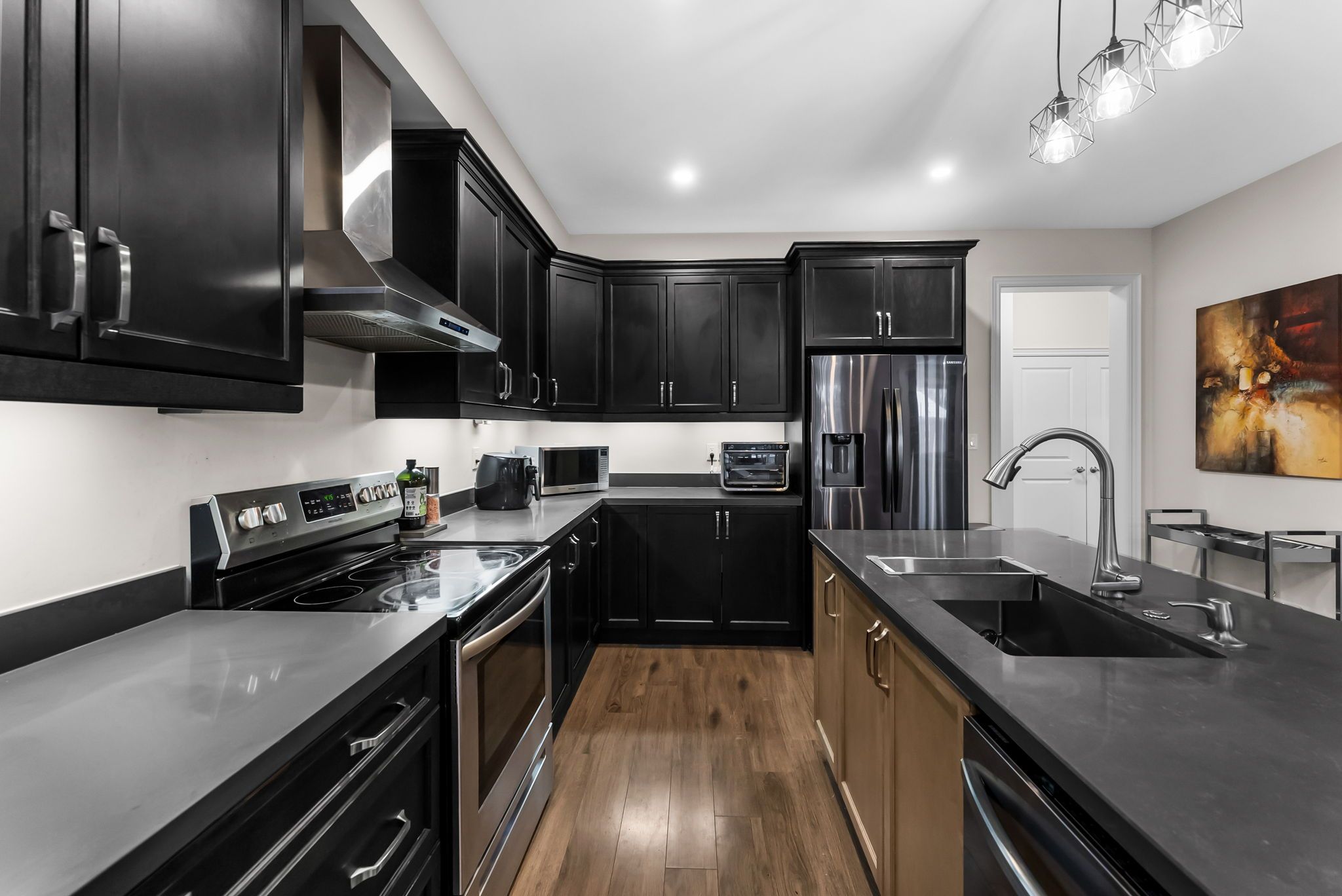 • Modern kitchen with quartz countertops and stainless steel appliances.