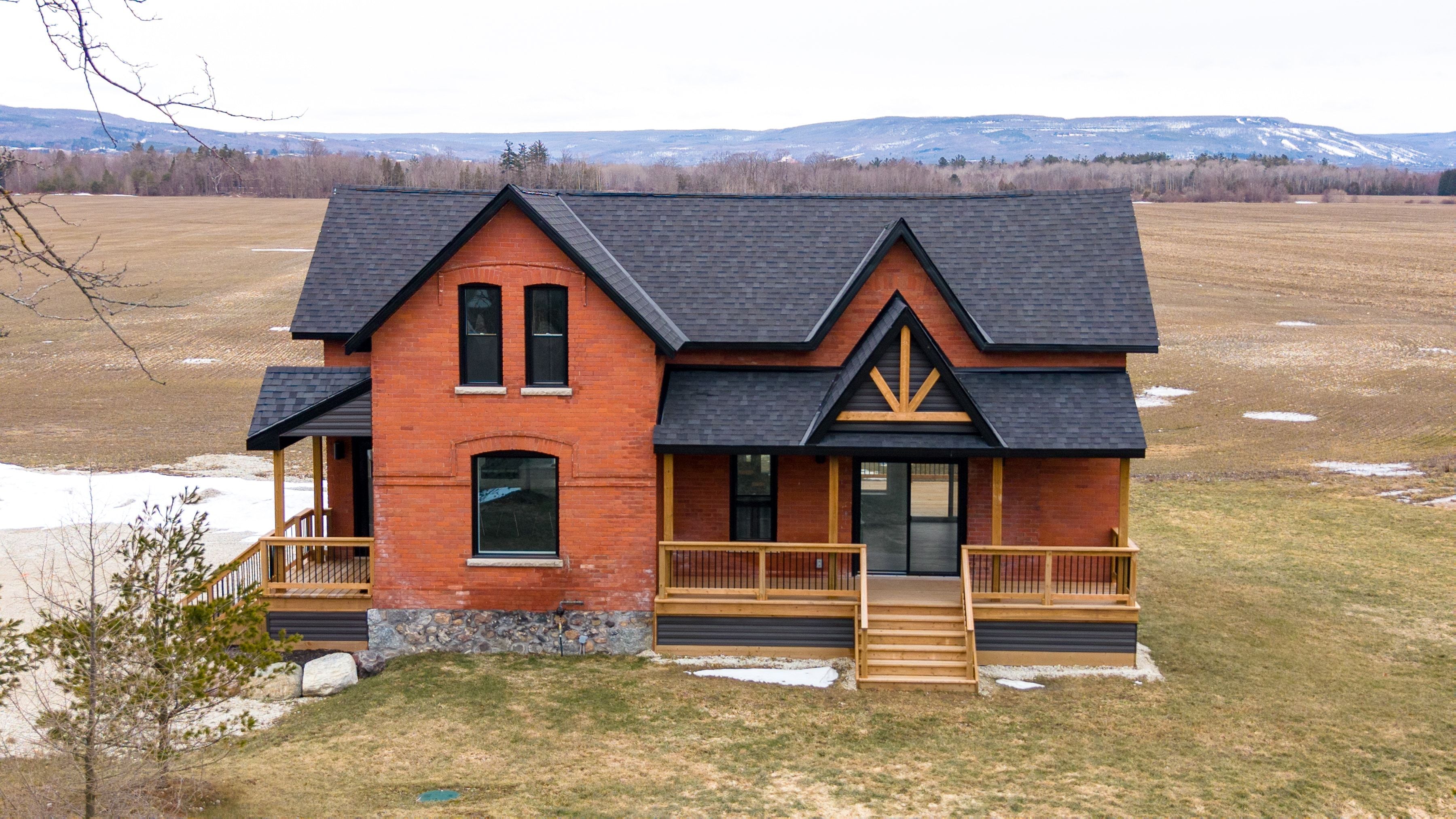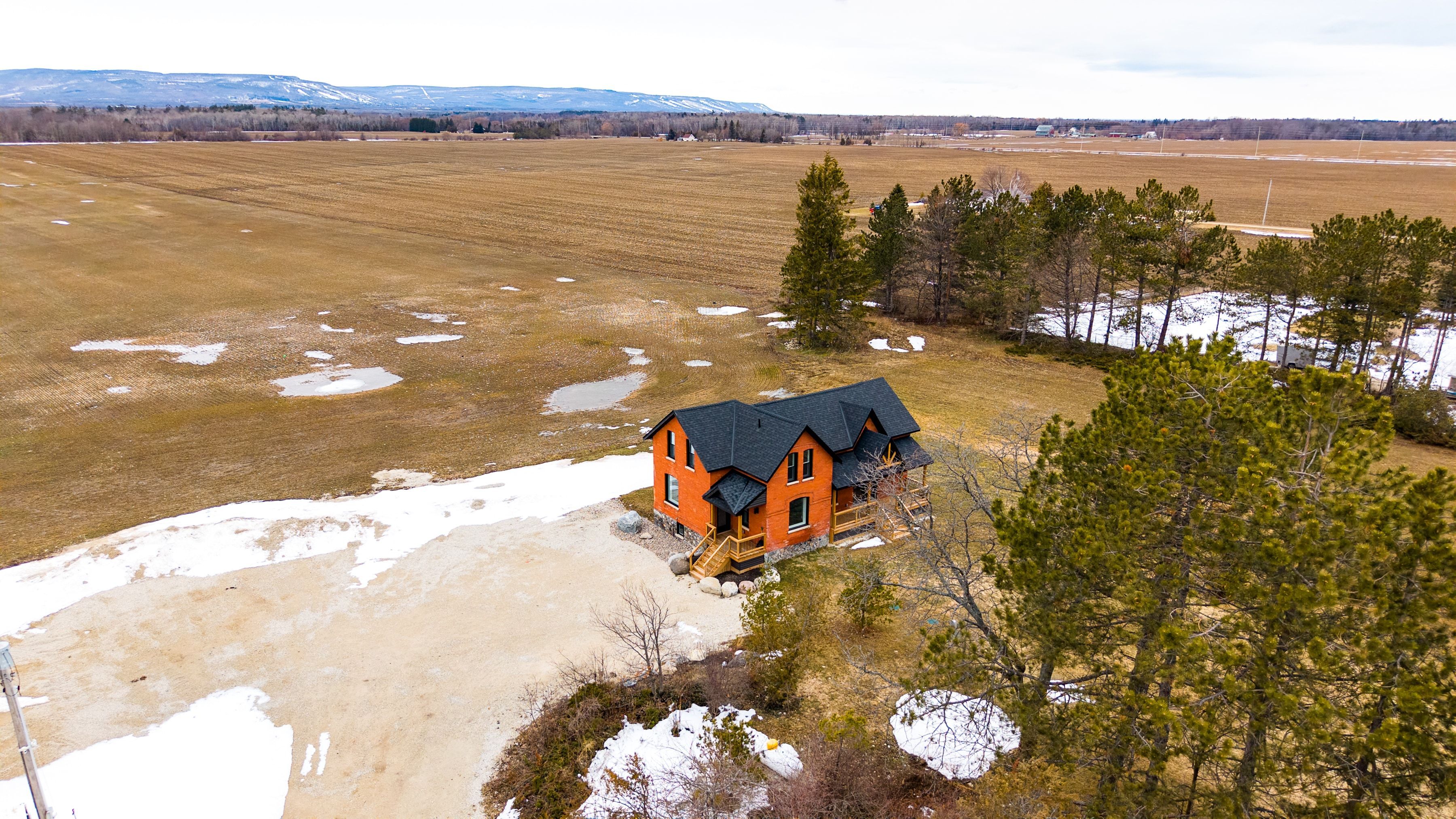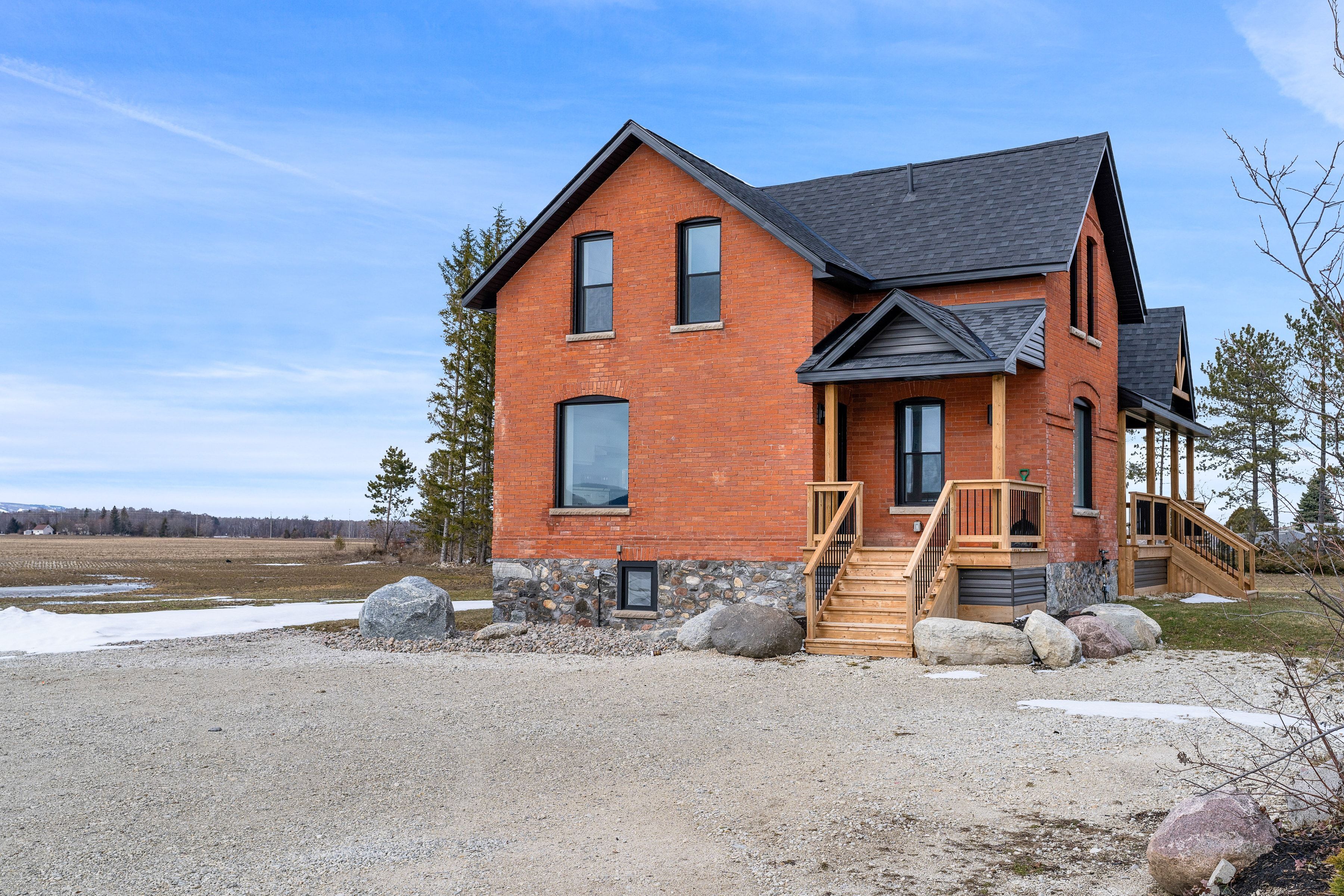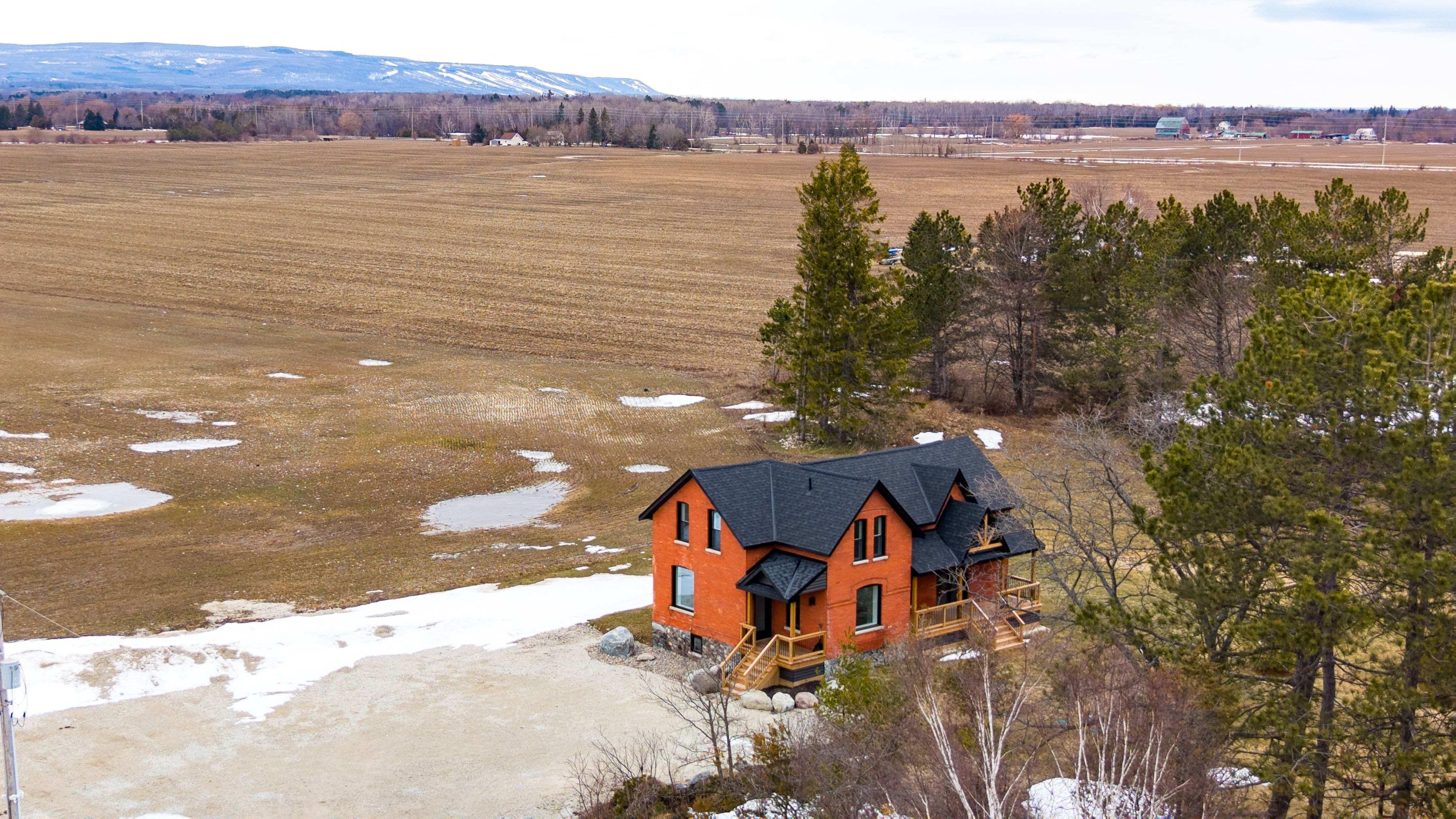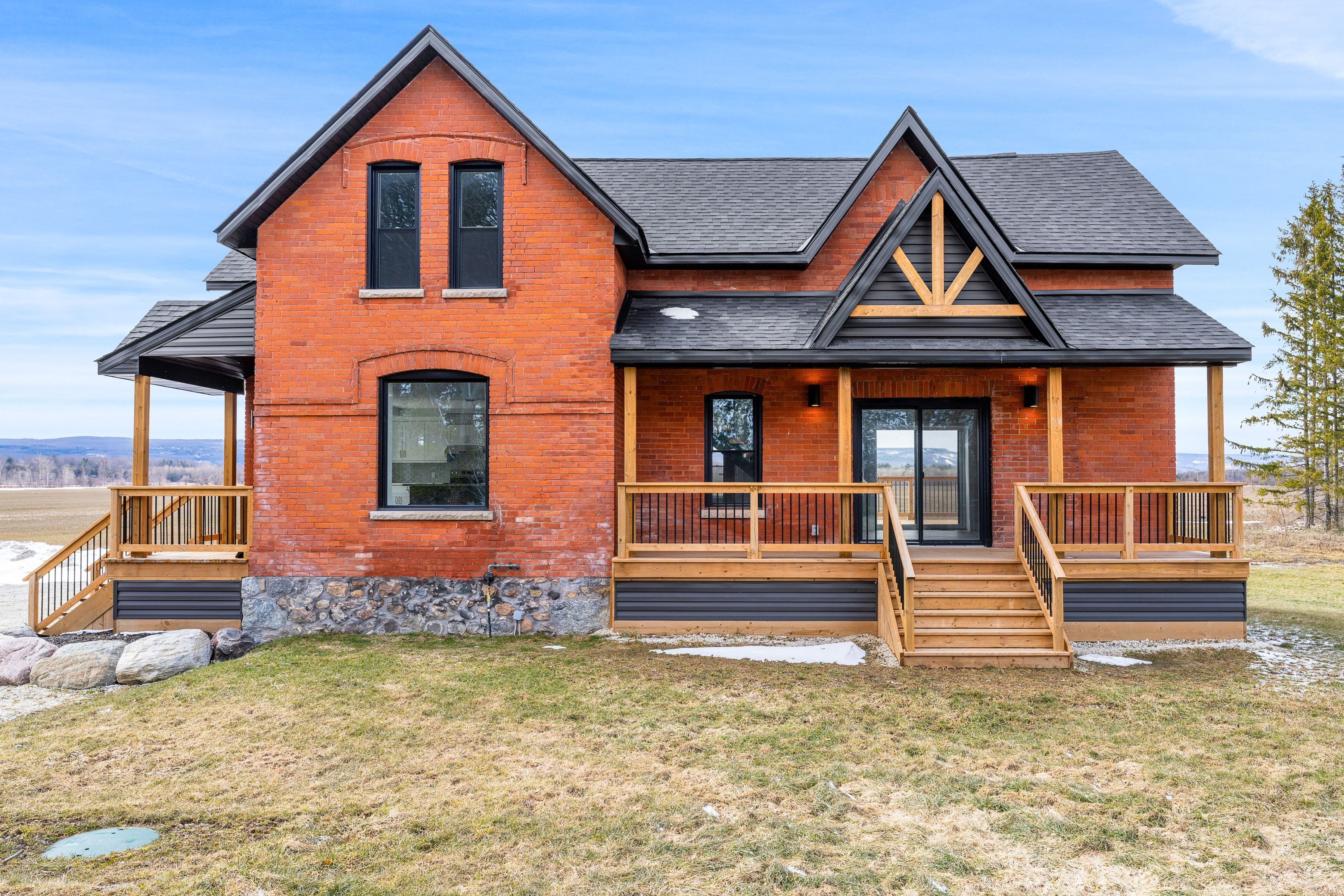 Solid brick farmhouse circa 1900, fully renovated inside and out, offering over 2,800 sq ft of finished living space on a private 2-acre parcel in clearview township. Blending timeless character with modern design, this property is surrounded by mature trees and open countryside, capturing stunning 180-degree views of the niagara escarpment, with sunsets and the evening lights of blue mountain resort in the distance. The thoughtfully redesigned interior features an open-concept main level with soaring cathedral ceilings, a propane linear fireplace, and expansive windows that flood the space with natural light. The kitchen is equipped with a large centre island, quartz countertops, and stainless steel appliances, ideal for everyday living and entertaining. A striking mono staircase with glass railing adds architectural appeal, while multiple walkouts lead to three new decks, creating seamless indoor-outdoor living. A 3-piece bathroom completes the main floor. Upstairs offers two spacious bedrooms and a jack and jill 4-piece bathroom with double sinks, a soaker tub and standalone shower. The fully finished lower level provides a bright family room, additional bedroom, and office, bringing the total to 2+1 bedrooms. Extensive upgrades (2023-2025) include new windows, doors, roof, insulation, well, septic, and mechanical systems. In-floor heating in bathrooms, water treatment system, air exchanger, and on-demand hot water ensure year-round comfort. Ideally located minutes to blue mountain, collingwood, wasaga beach, and creemore for skiing, beaches, trails, dining, and shopping.