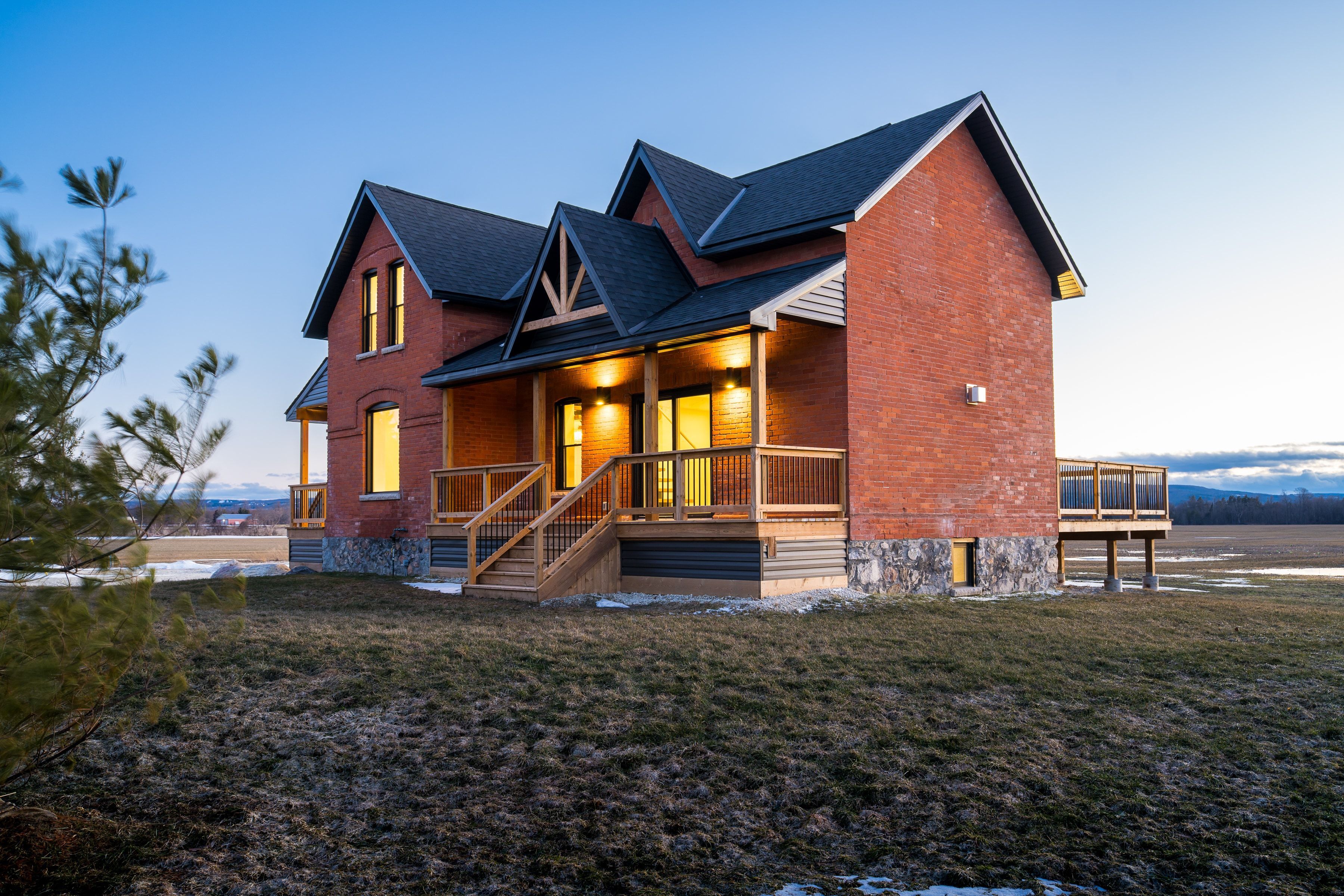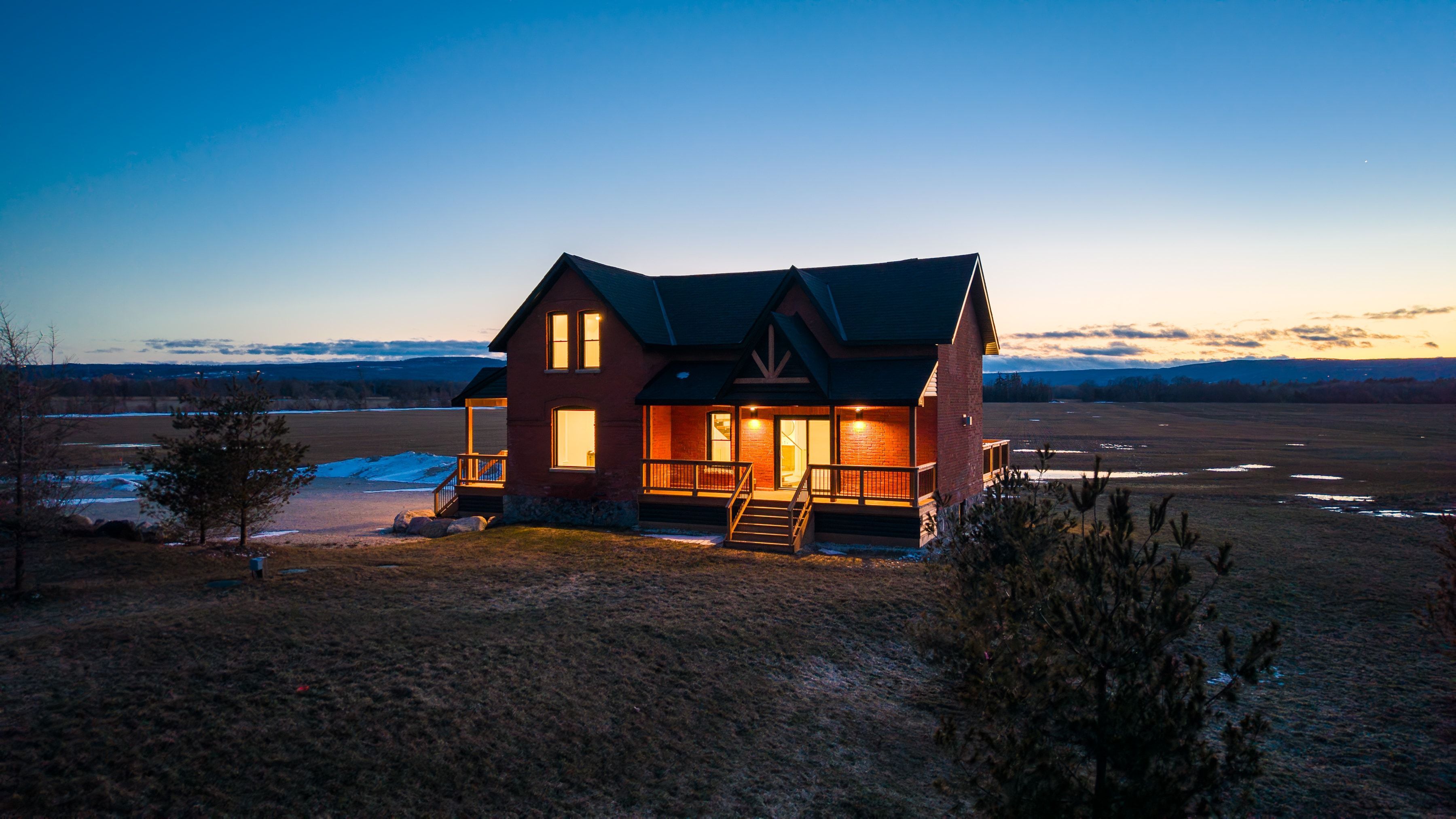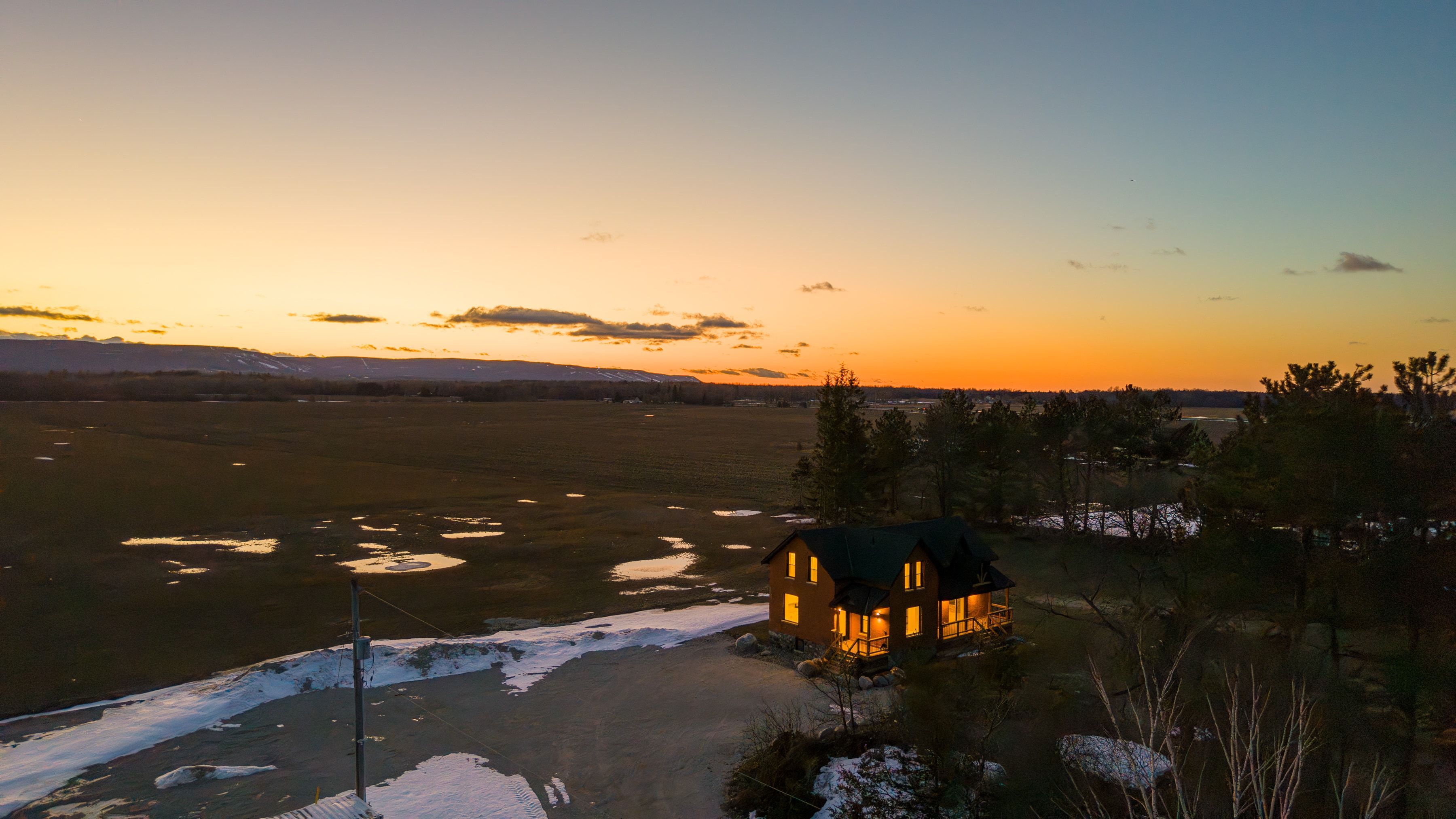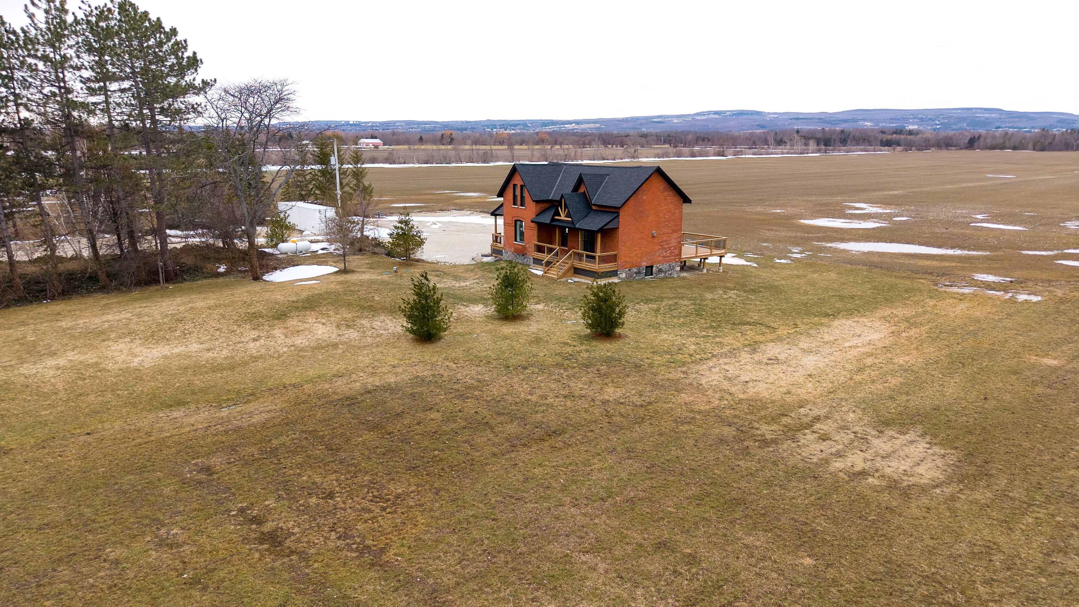 Solid brick farmhouse circa 1900, fully renovated inside and out, offering over 2,800 sq ft of finished living space on a private 2-acre parcel in clearview township. Blending timeless character with modern design, this property is surrounded by mature trees and open countryside, capturing stunning 180-degree views of the niagara escarpment, with sunsets and the evening lights of blue mountain resort in the distance. The thoughtfully redesigned interior features an open-concept main level with soaring cathedral ceilings, a propane linear fireplace, and expansive windows that flood the space with natural light. The kitchen is equipped with a large centre island, quartz countertops, and stainless steel appliances, ideal for everyday living and entertaining. A striking mono staircase with glass railing adds architectural appeal, while multiple walkouts lead to three new decks, creating seamless indoor-outdoor living. A 3-piece bathroom completes the main floor. Upstairs offers two spacious bedrooms and a jack and jill 4-piece bathroom with double sinks, a soaker tub and standalone shower. The fully finished lower level provides a bright family room, additional bedroom, and office, bringing the total to 2+1 bedrooms. Extensive upgrades (2023-2025) include new windows, doors, roof, insulation, well, septic, and mechanical systems. In-floor heating in bathrooms, water treatment system, air exchanger, and on-demand hot water ensure year-round comfort. Ideally located minutes to blue mountain, collingwood, wasaga beach, and creemore for skiing, beaches, trails, dining, and shopping.