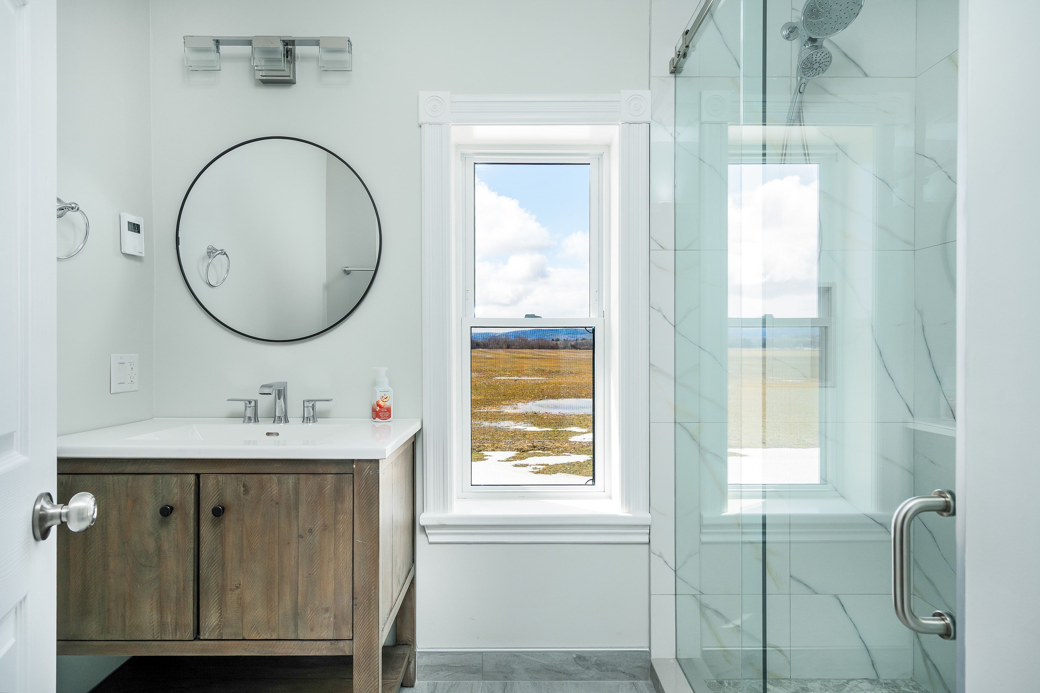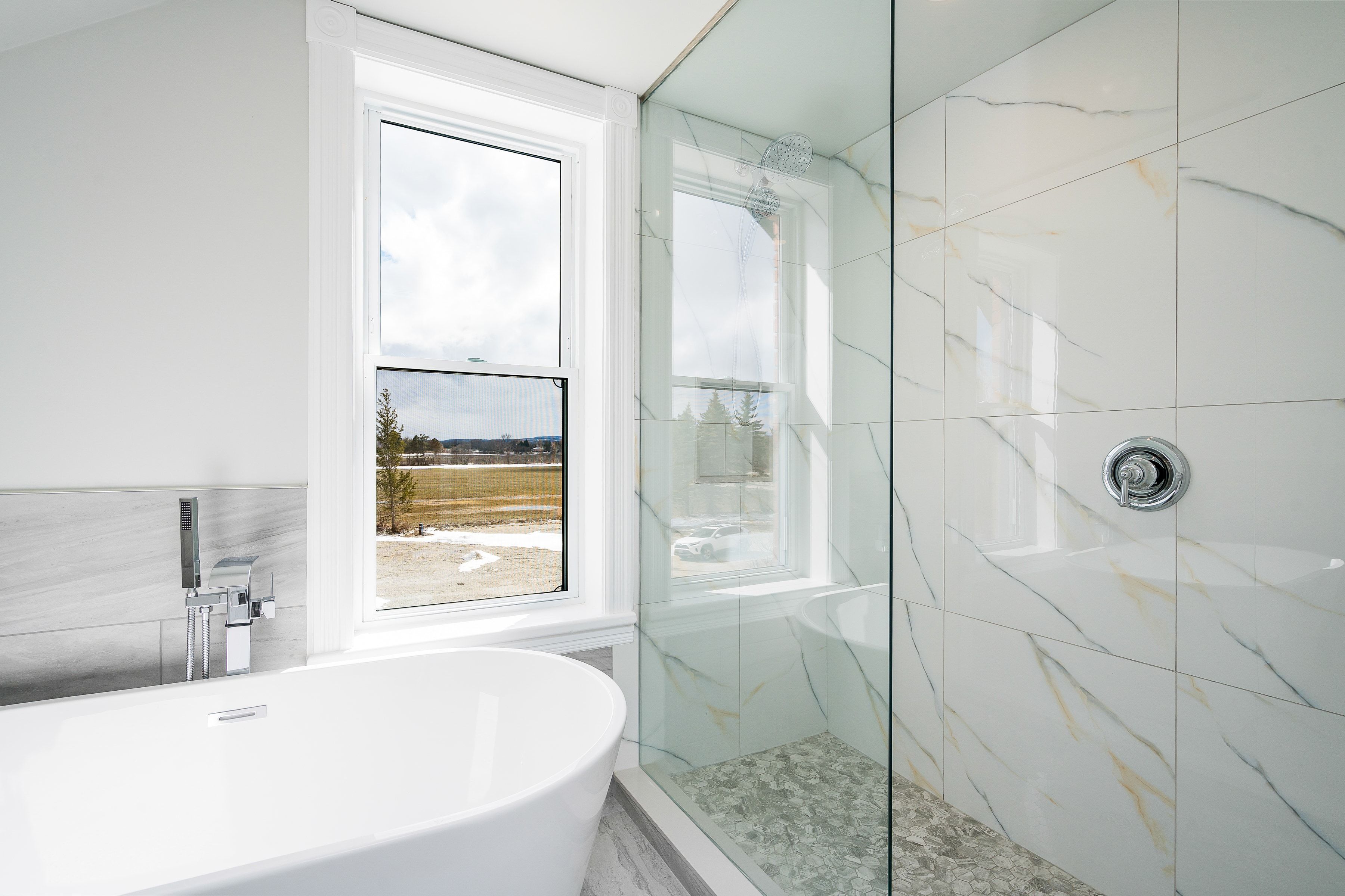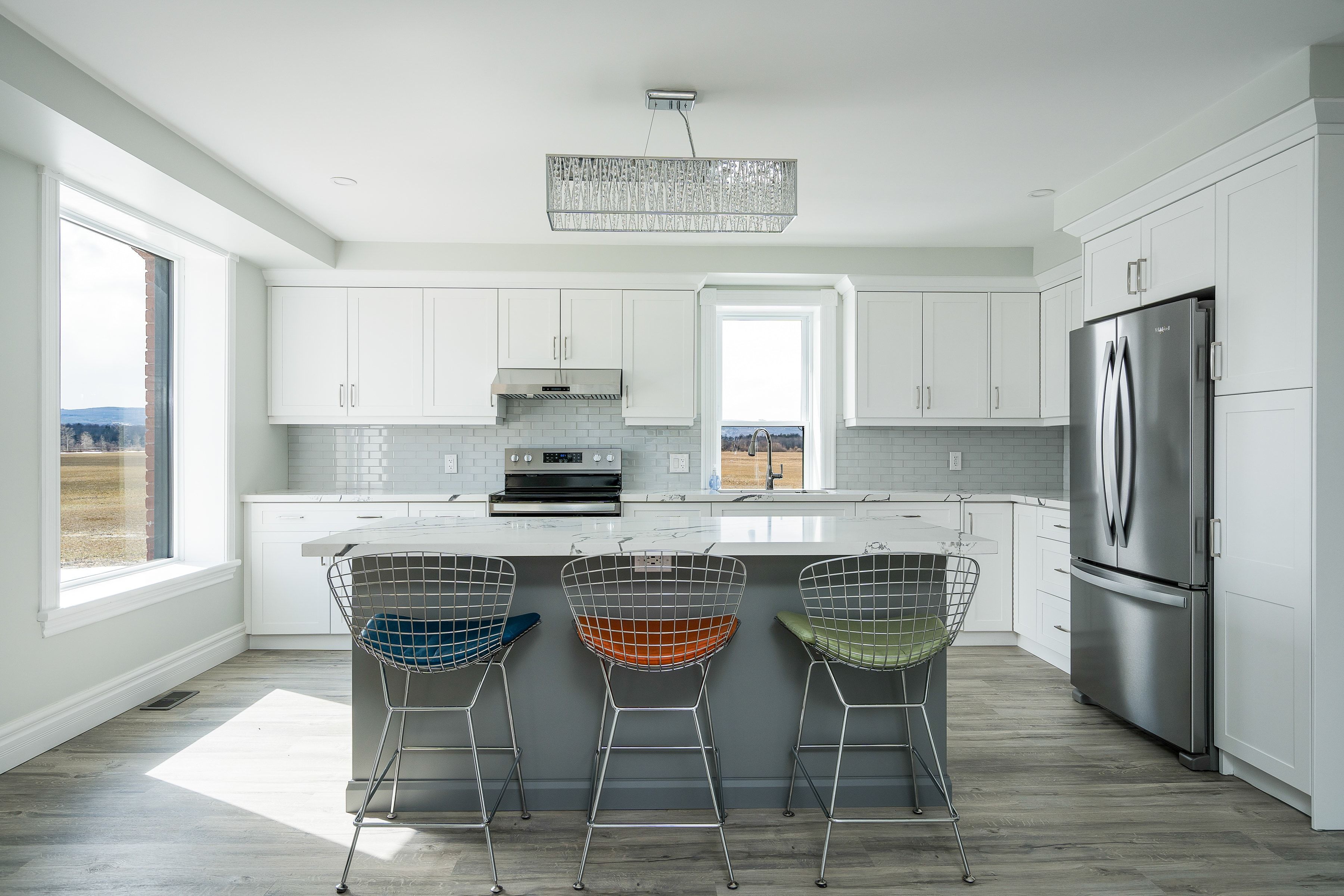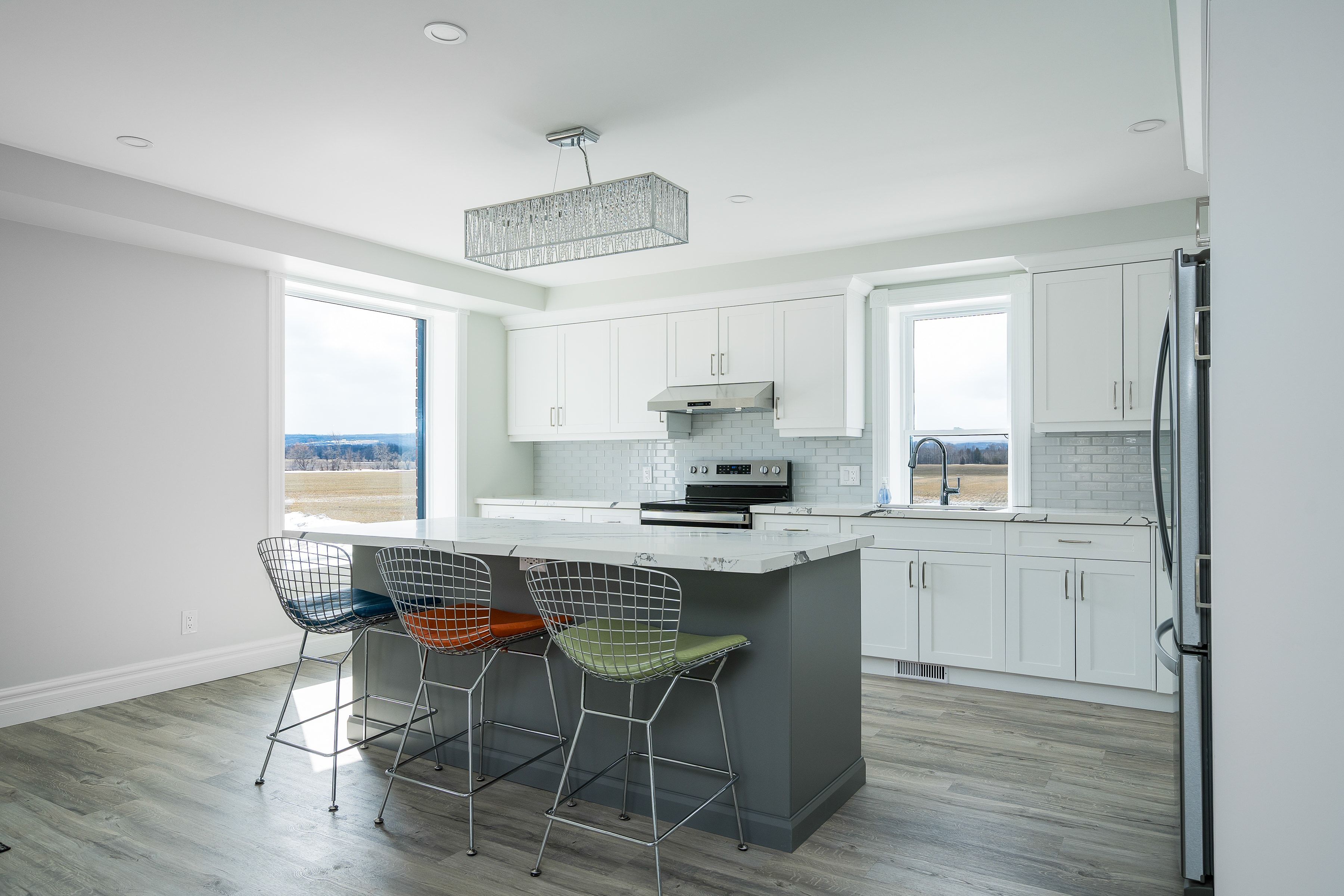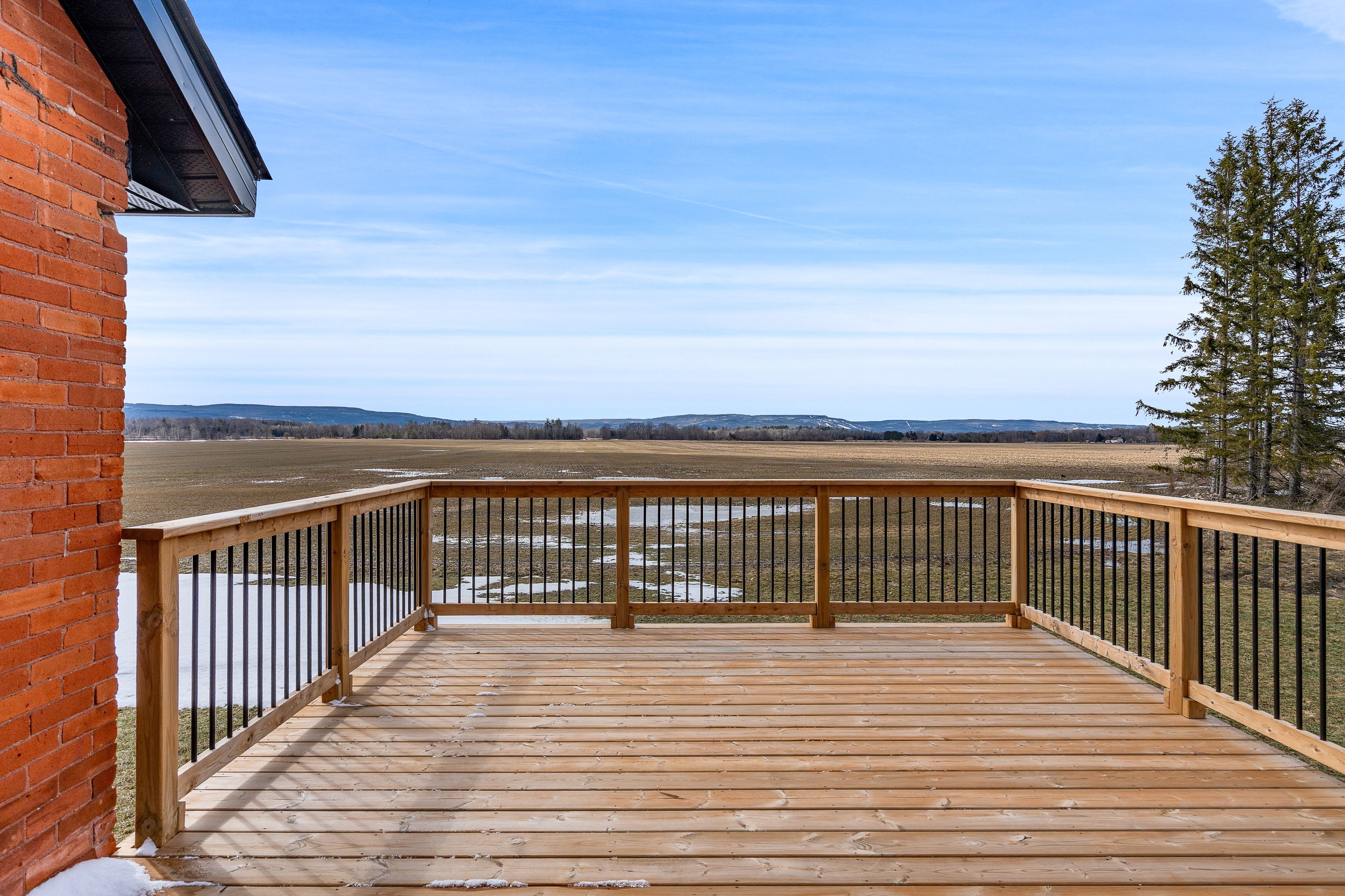 Solid brick farmhouse circa 1900, fully renovated inside and out, offering over 2,800 sq ft of finished living space on a private 2-acre parcel in clearview township. Blending timeless character with modern design, this property is surrounded by mature trees and open countryside, capturing stunning 180-degree views of the niagara escarpment, with sunsets and the evening lights of blue mountain resort in the distance. The thoughtfully redesigned interior features an open-concept main level with soaring cathedral ceilings, a propane linear fireplace, and expansive windows that flood the space with natural light. The kitchen is equipped with a large centre island, quartz countertops, and stainless steel appliances, ideal for everyday living and entertaining. A striking mono staircase with glass railing adds architectural appeal, while multiple walkouts lead to three new decks, creating seamless indoor-outdoor living. A 3-piece bathroom completes the main floor. Upstairs offers two spacious bedrooms and a jack and jill 4-piece bathroom with double sinks, a soaker tub and standalone shower. The fully finished lower level provides a bright family room, additional bedroom, and office, bringing the total to 2+1 bedrooms. Extensive upgrades (2023-2025) include new windows, doors, roof, insulation, well, septic, and mechanical systems. In-floor heating in bathrooms, water treatment system, air exchanger, and on-demand hot water ensure year-round comfort. Ideally located minutes to blue mountain, collingwood, wasaga beach, and creemore for skiing, beaches, trails, dining, and shopping.