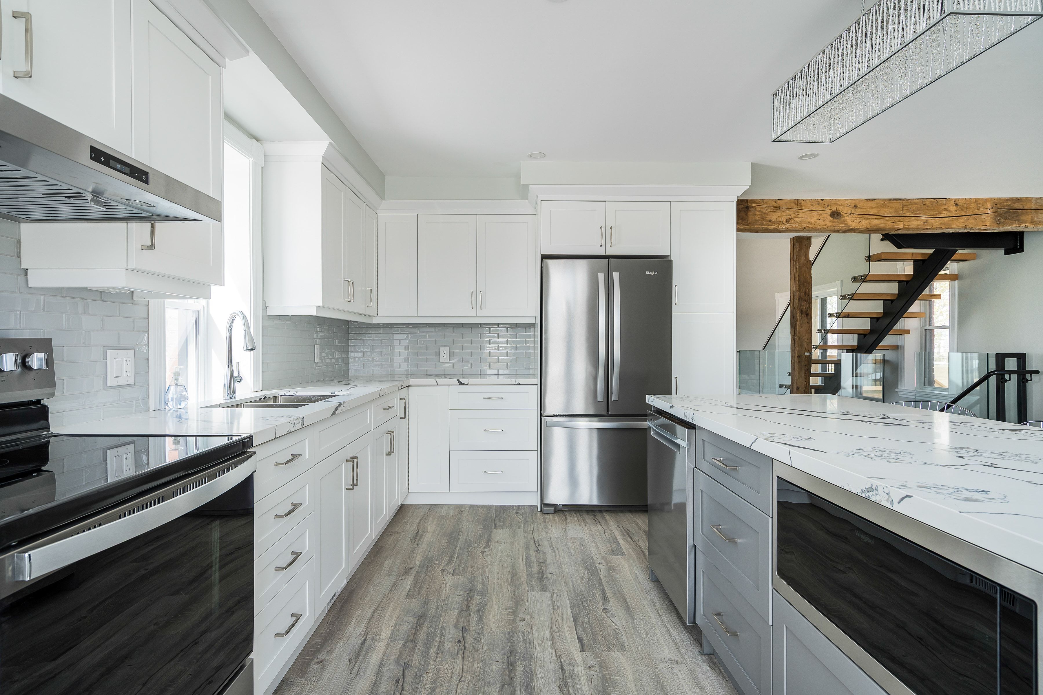 • Modern kitchen with quartz countertops and stainless steel appliances.