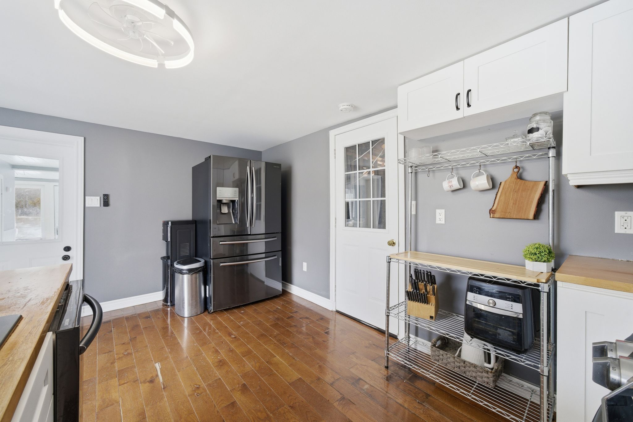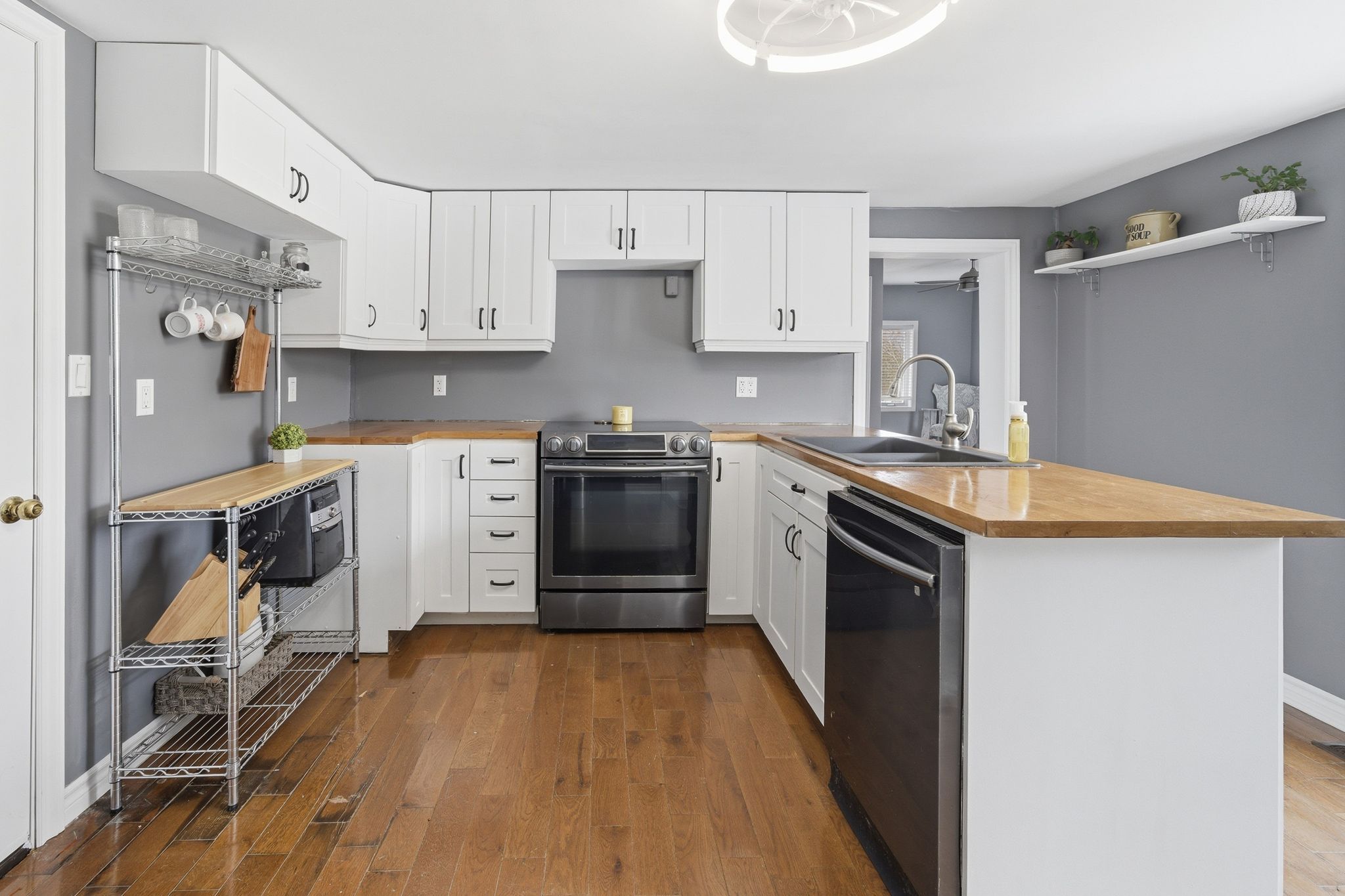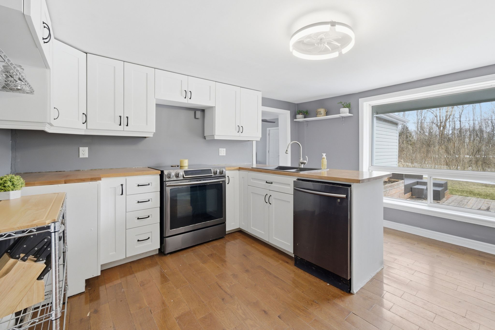• Updated kitchen featuring white cabinetry and butcher block countertops.