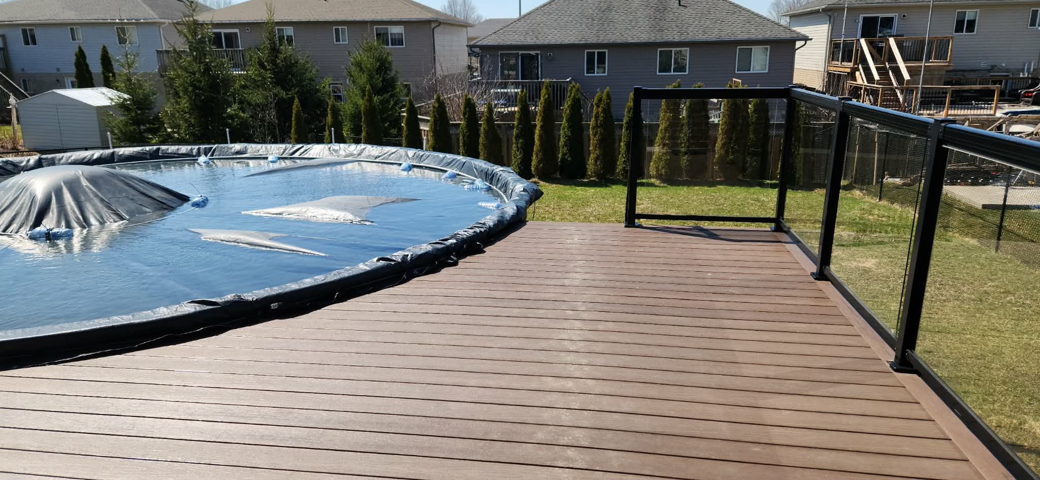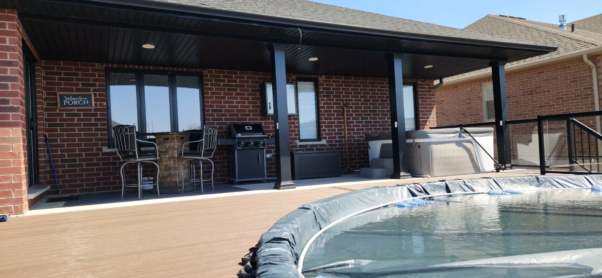• Covered rear porch and deck overlooking a landscaped backyard with a pool.