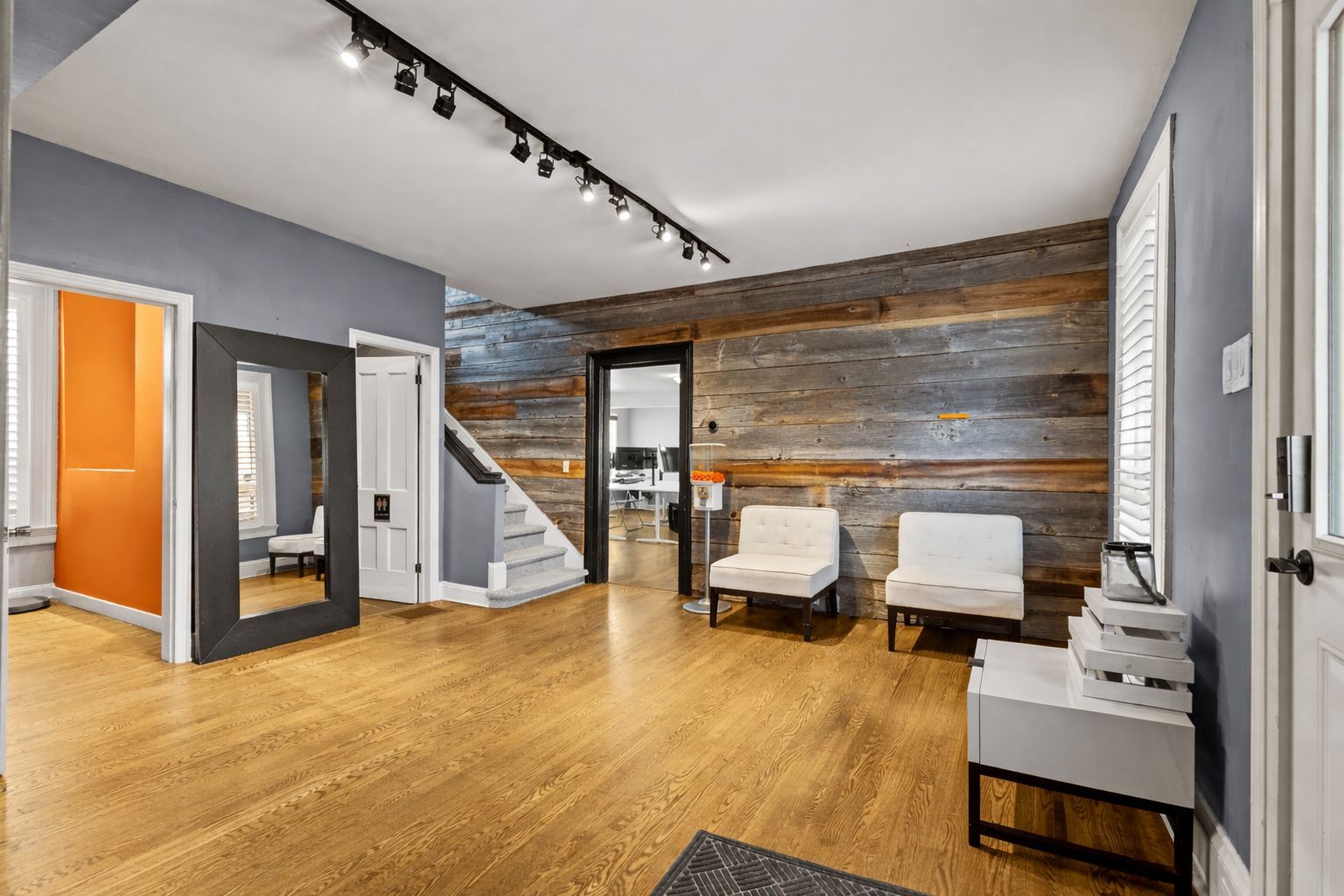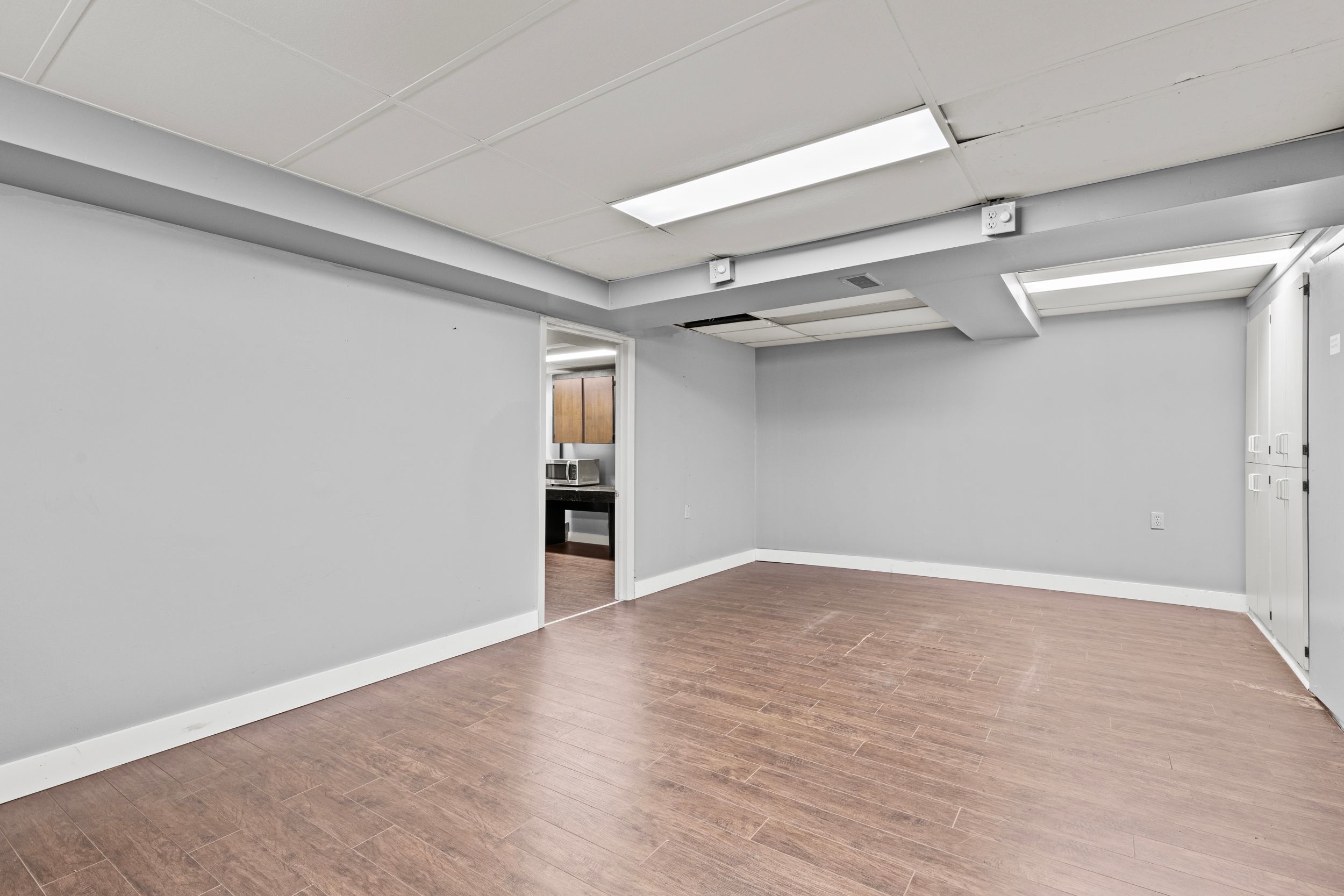 • Spacious layout includes private offices and a co-working area.