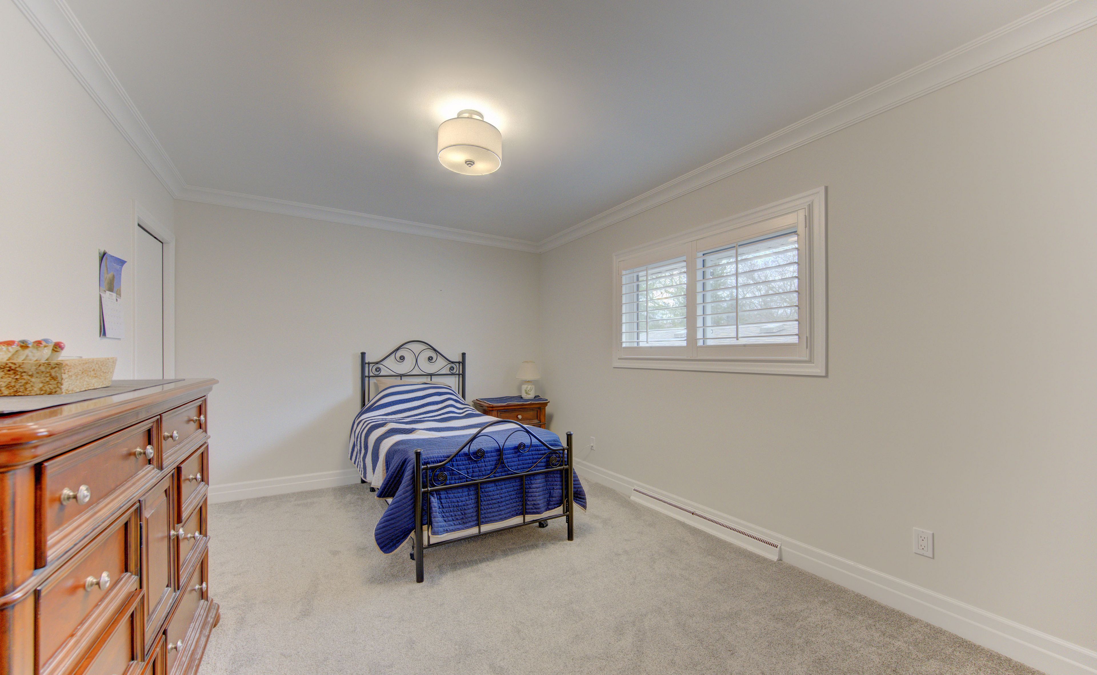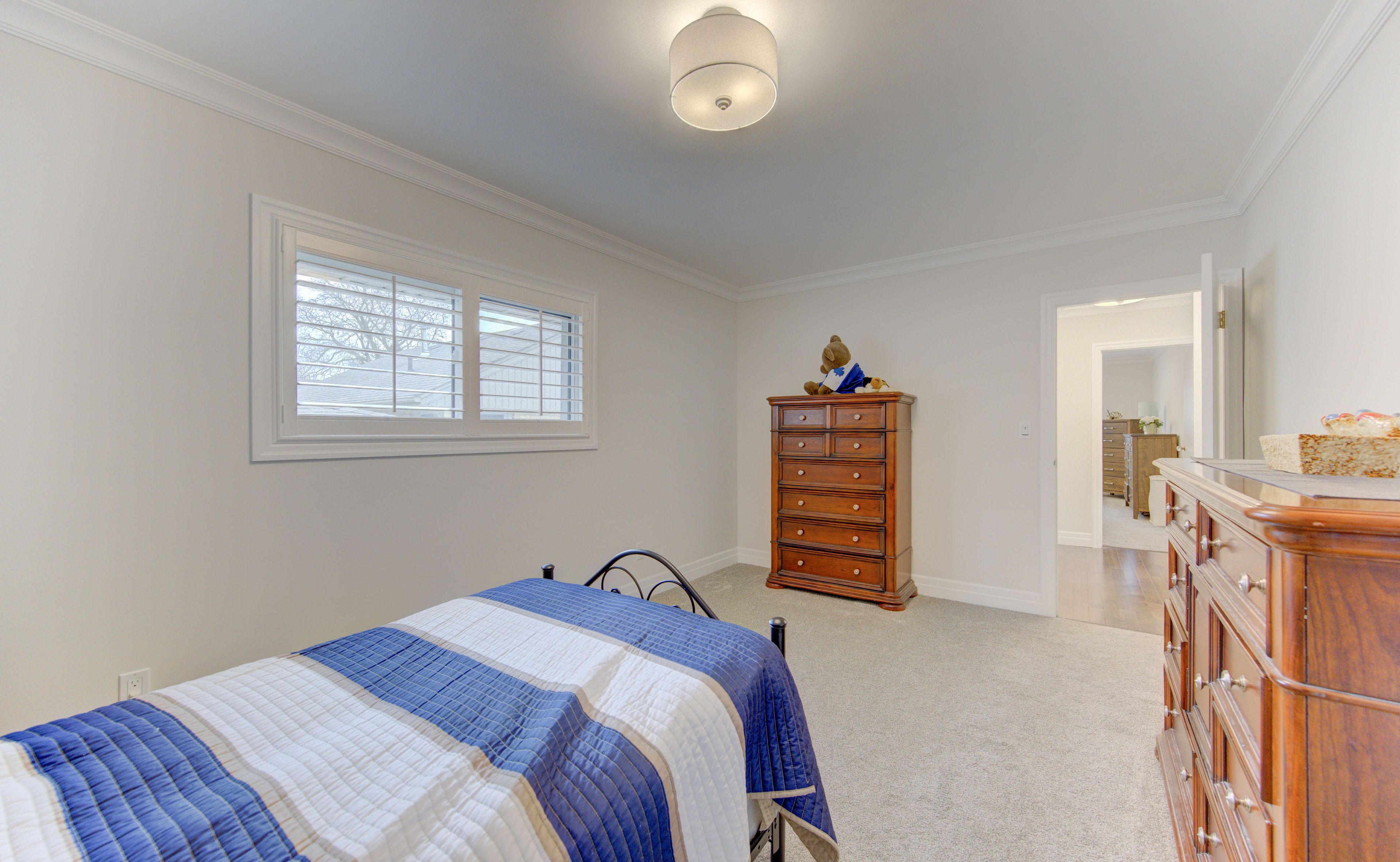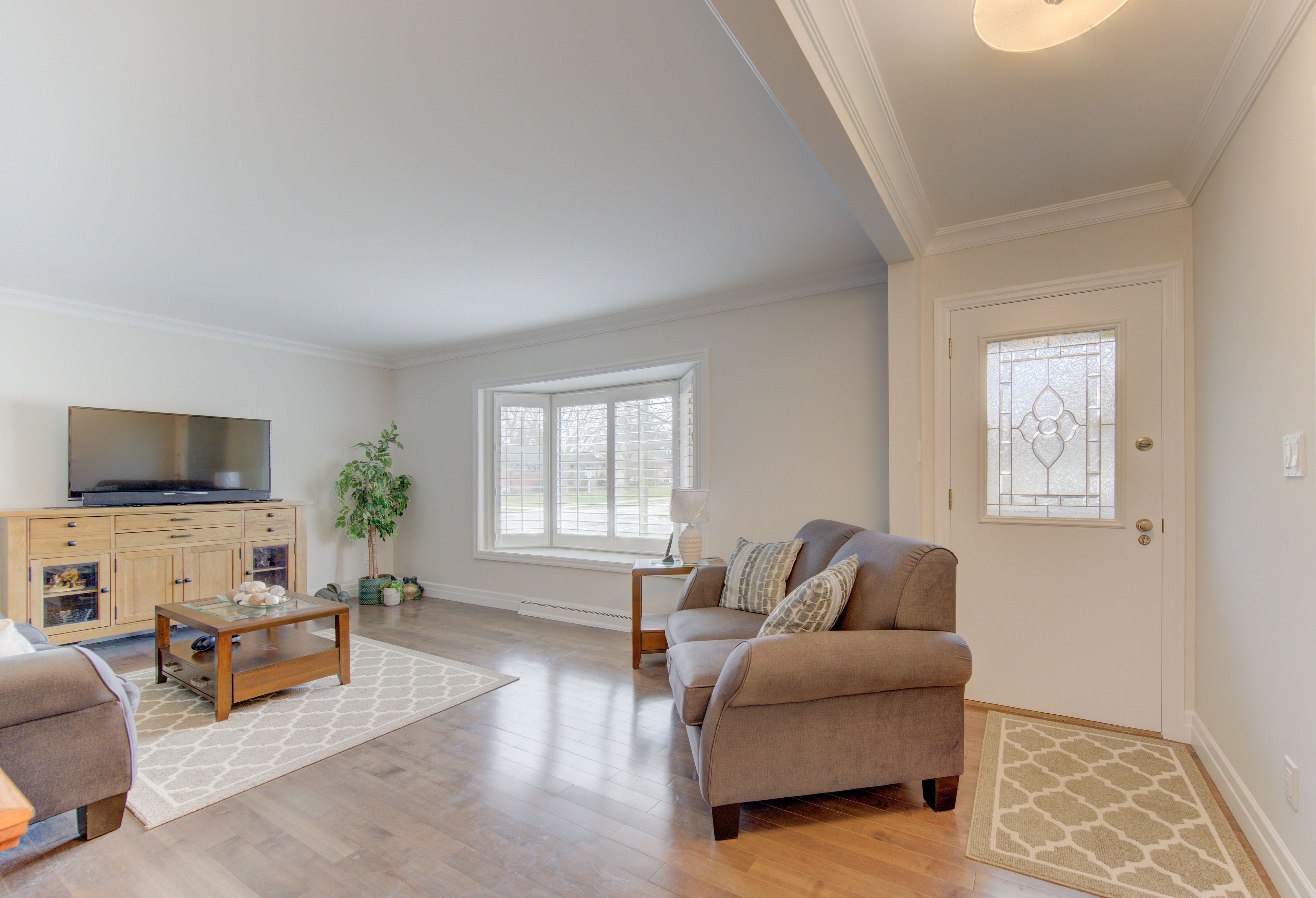 • Bright living room with a large bay window and classic California shutters.