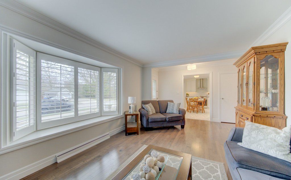 • Bright living room with large bay window and California shutters.