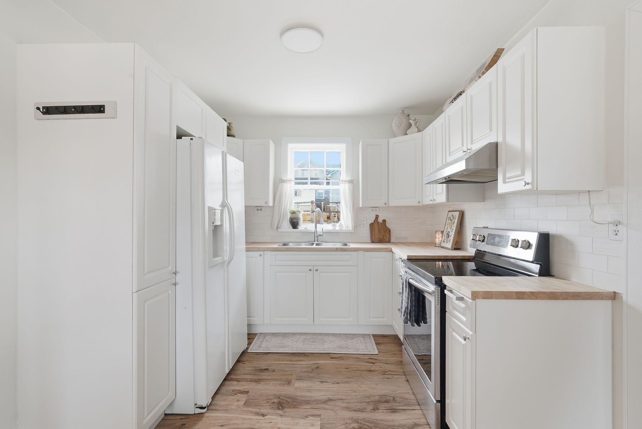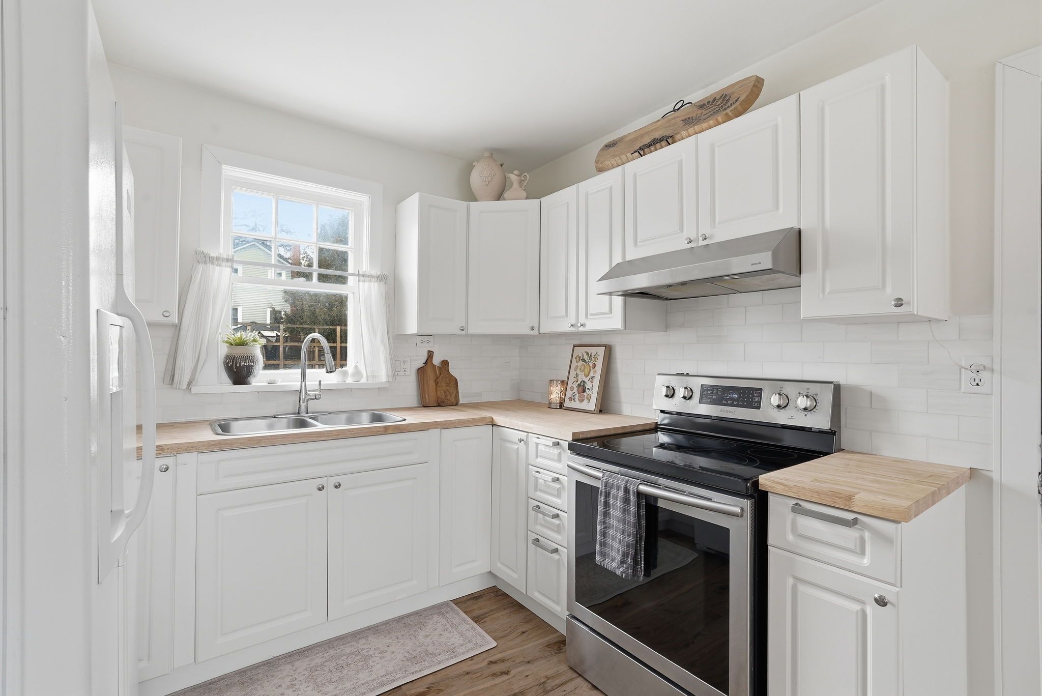 • Bright kitchen with new butcher block countertops and subway tile backsplash.