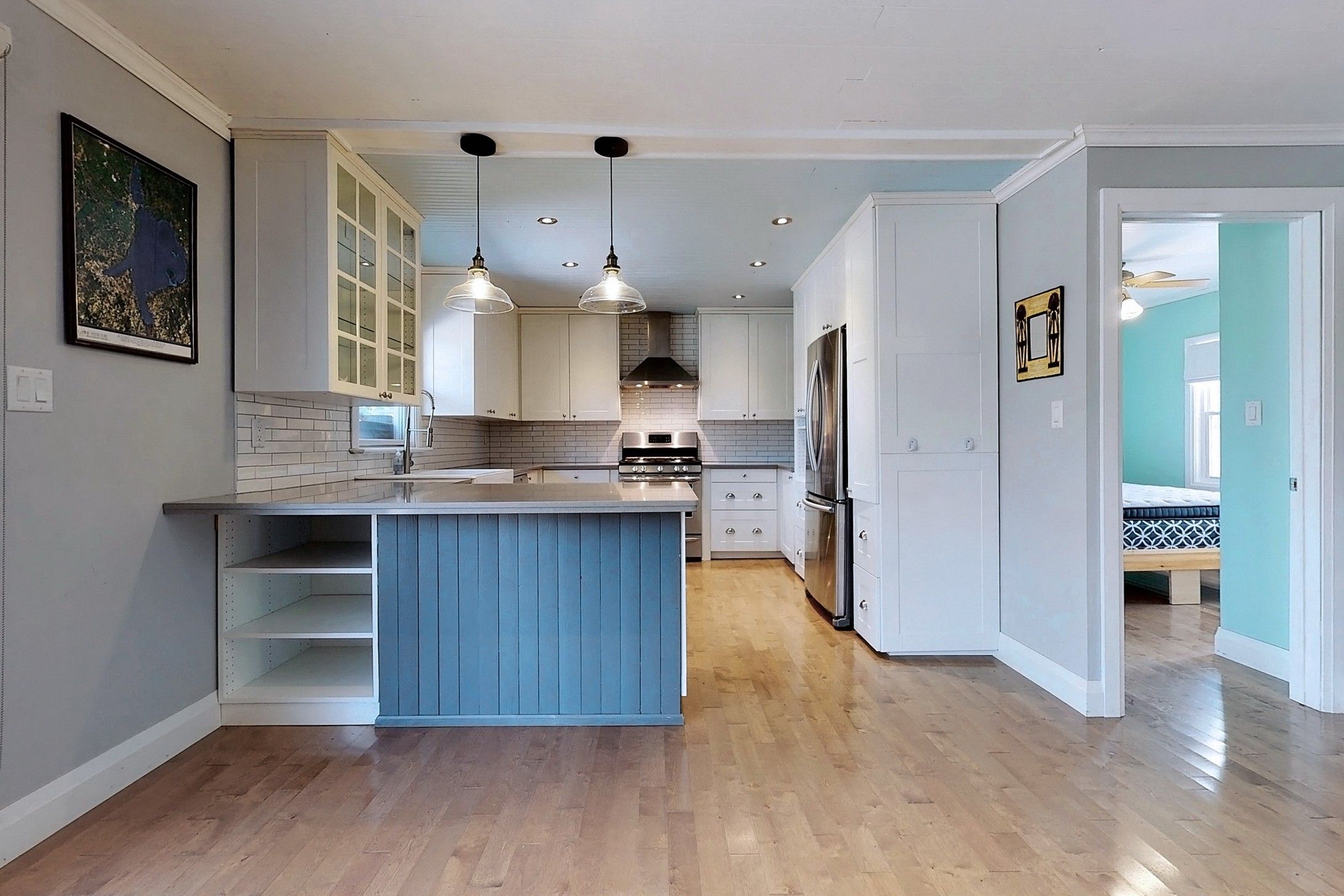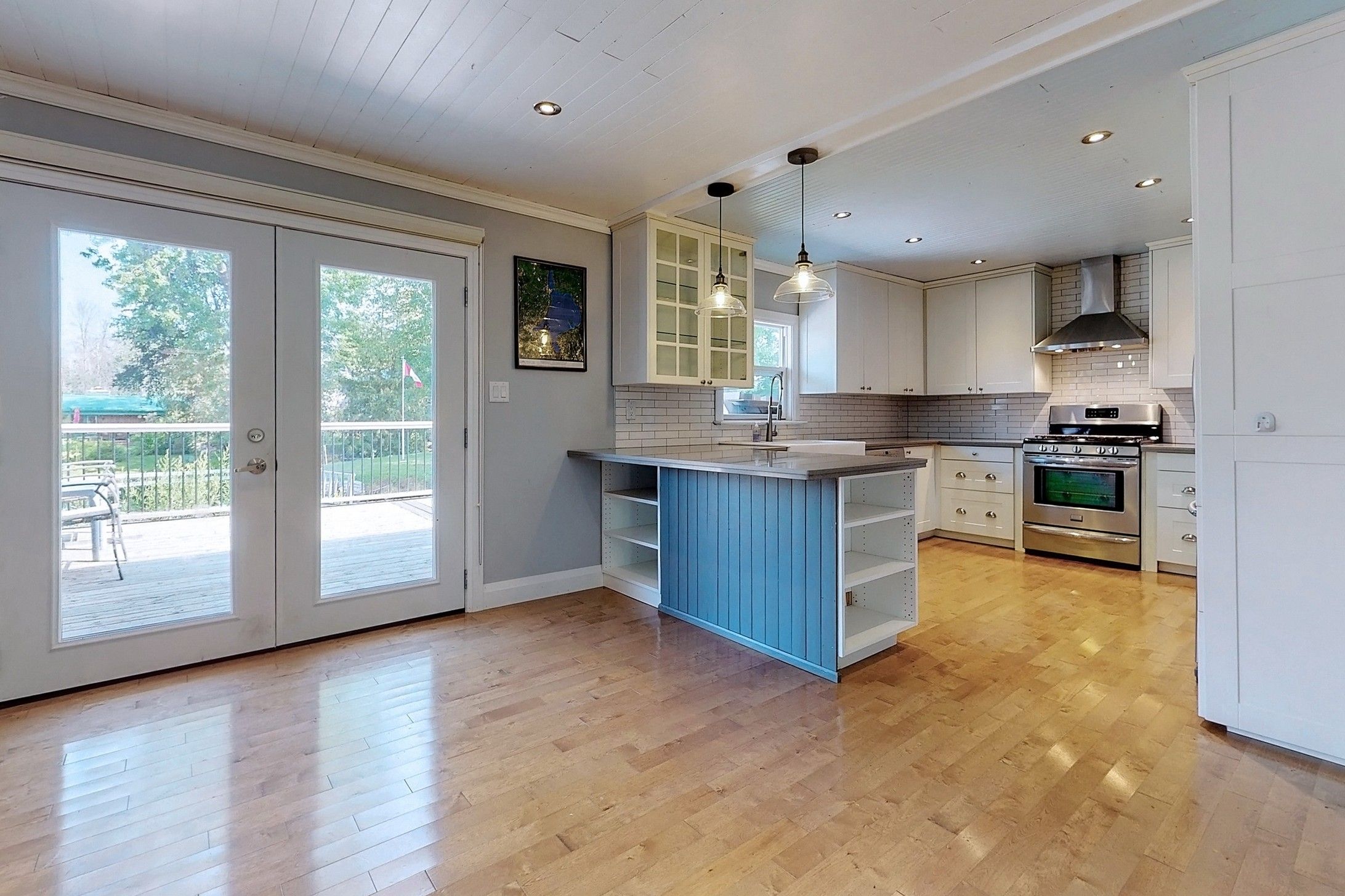 Almost 100' rear shoreline directly access to cook's bay! All hardwood & heated porcelain thruout, crown moulding & pot lights in whole house, fi-to-ceiling moulded cabinet w/stone counter & s/s appls, designed 2-way fireplace, backyard fenced with lots of privacy, enjoy your summer in own cottage with huge deck walk path to private dock. Newer furnace, newer roof, siding, insulation & bsmt thermal & waterproof membrane