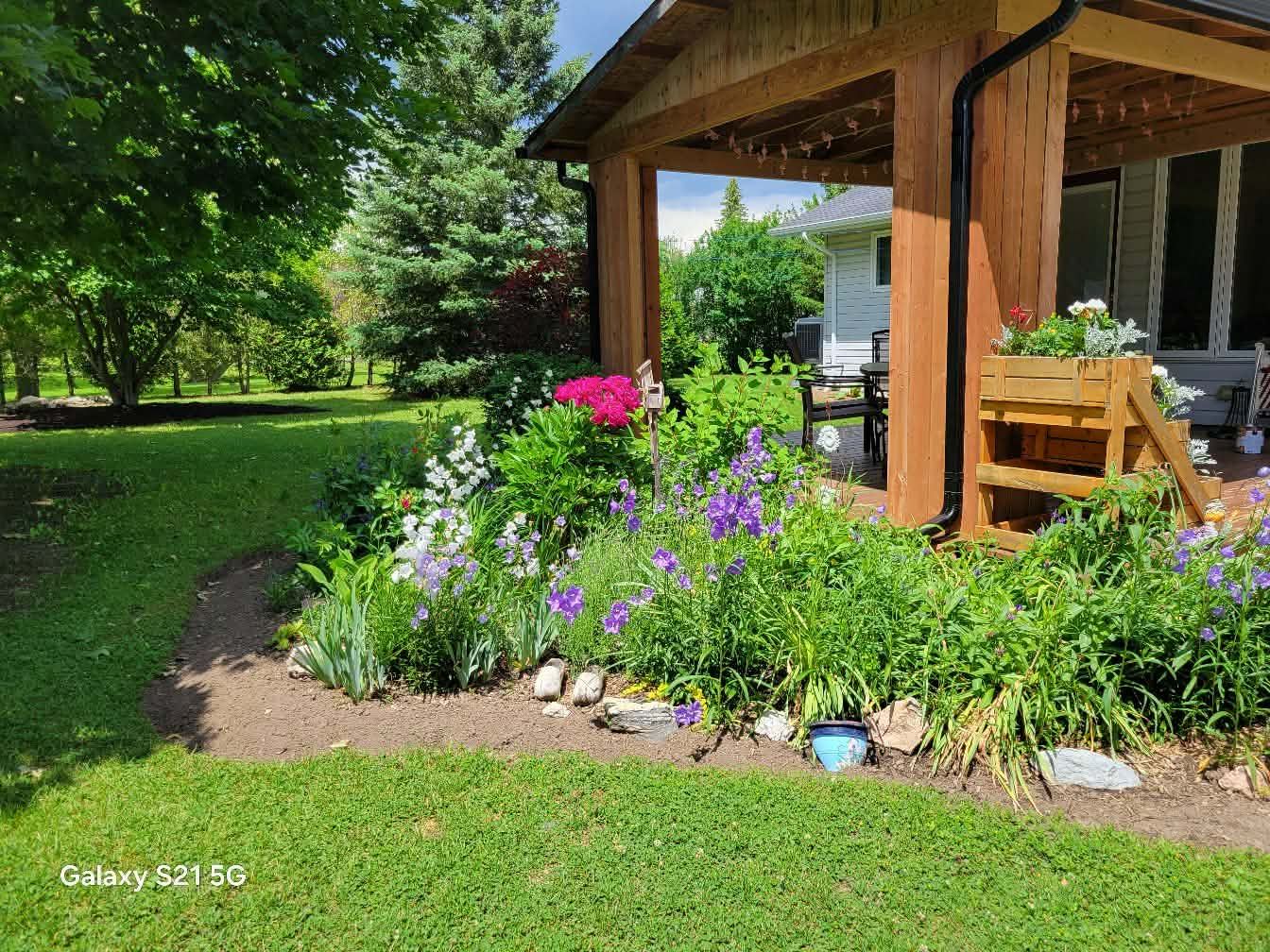 • Beautifully landscaped backyard with fire pit and wooden gazebo.