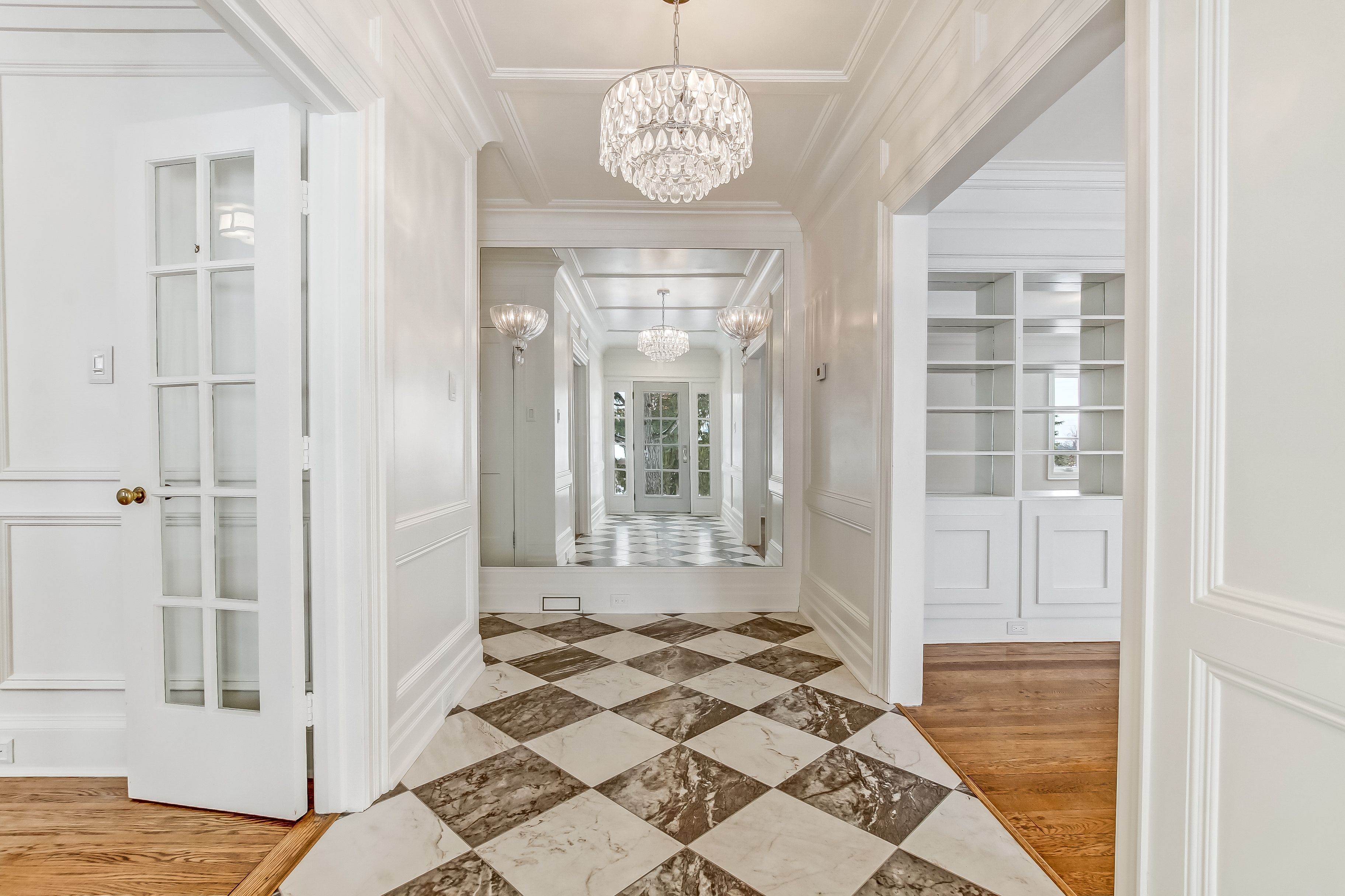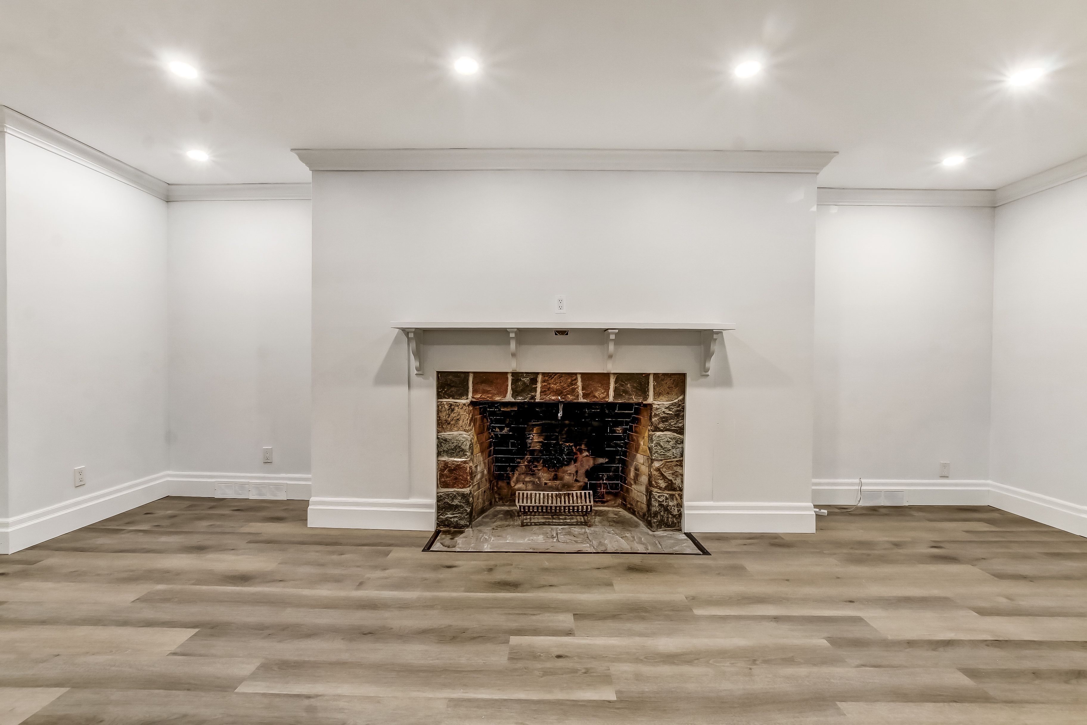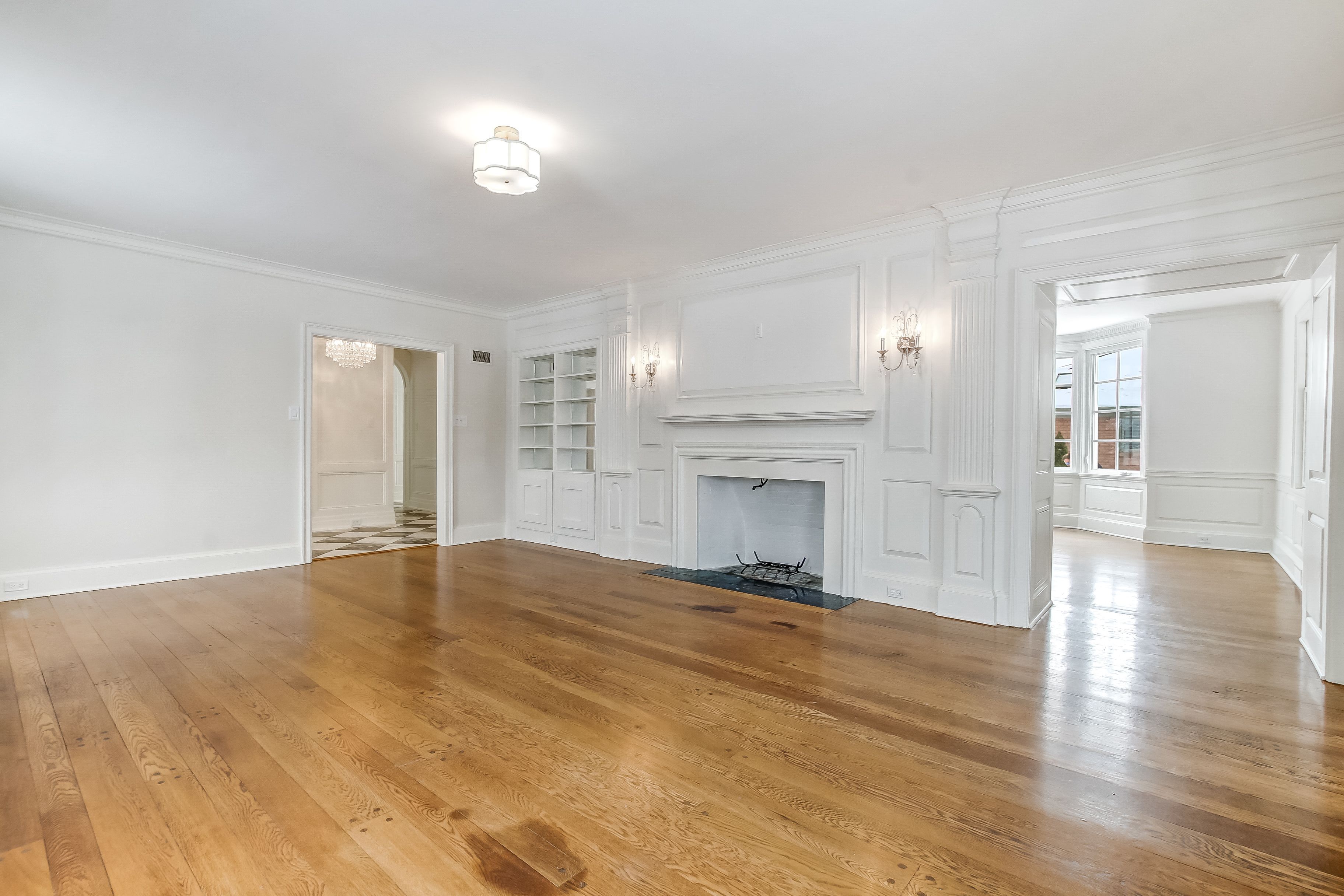 • Spacious living area with a fireplace and built-in bookshelves for cozy gatherings.