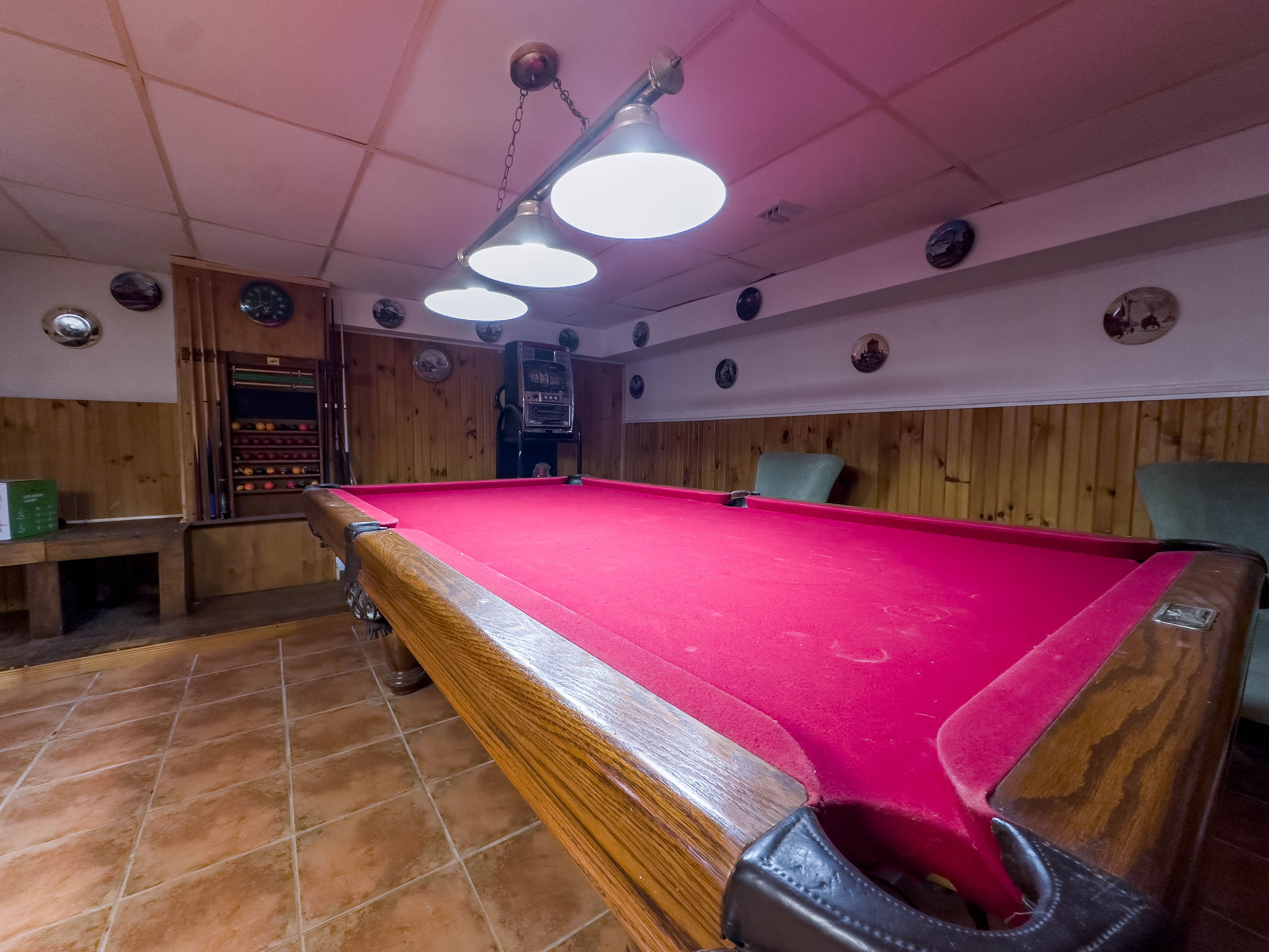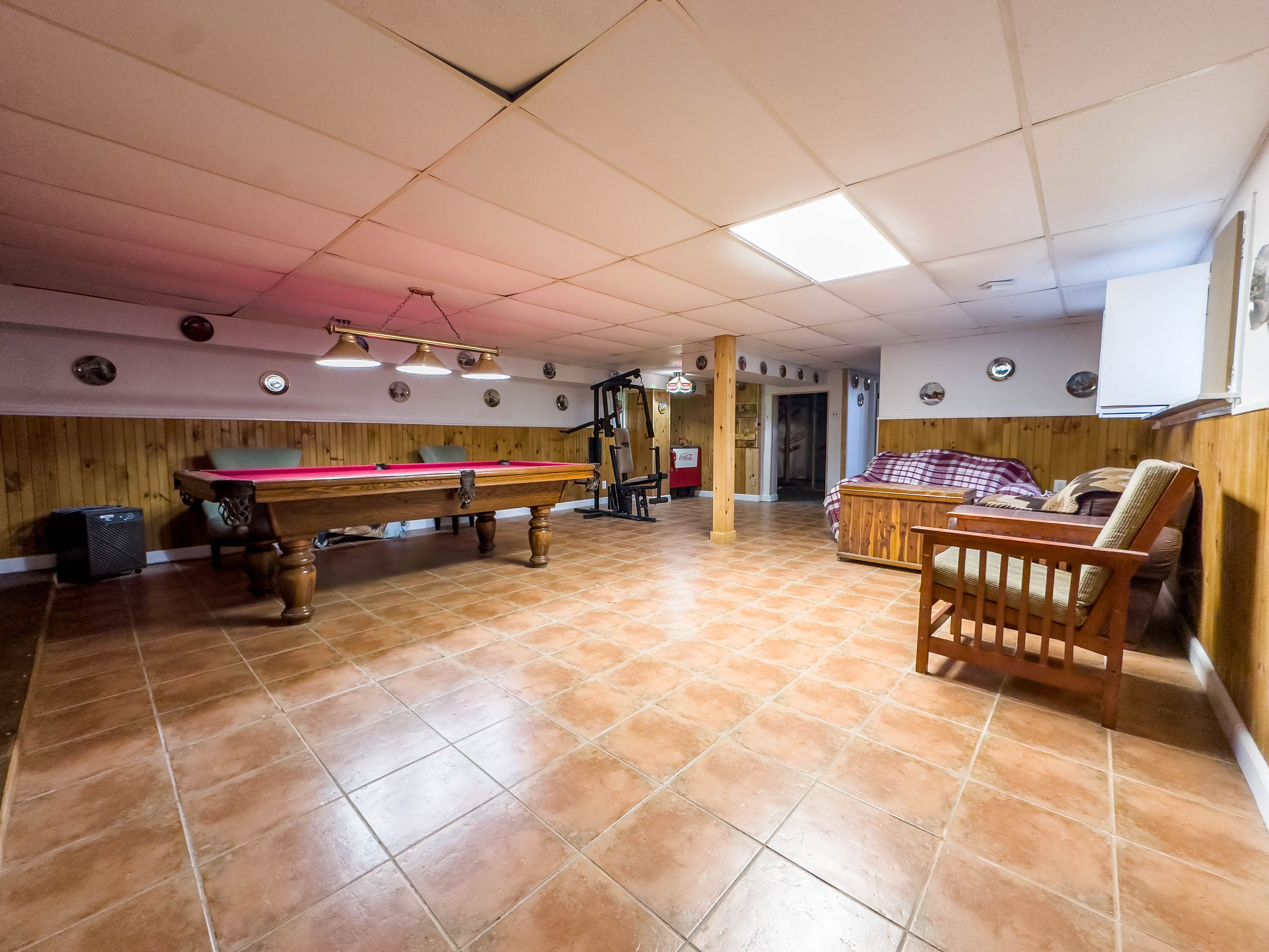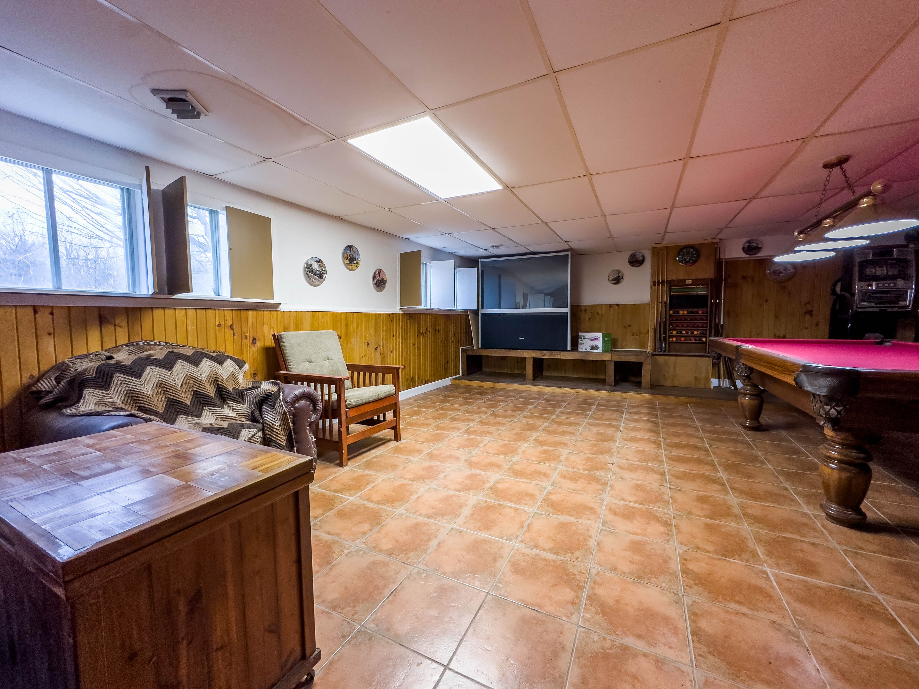 • Lower level features a rec room and pool table for entertainment.