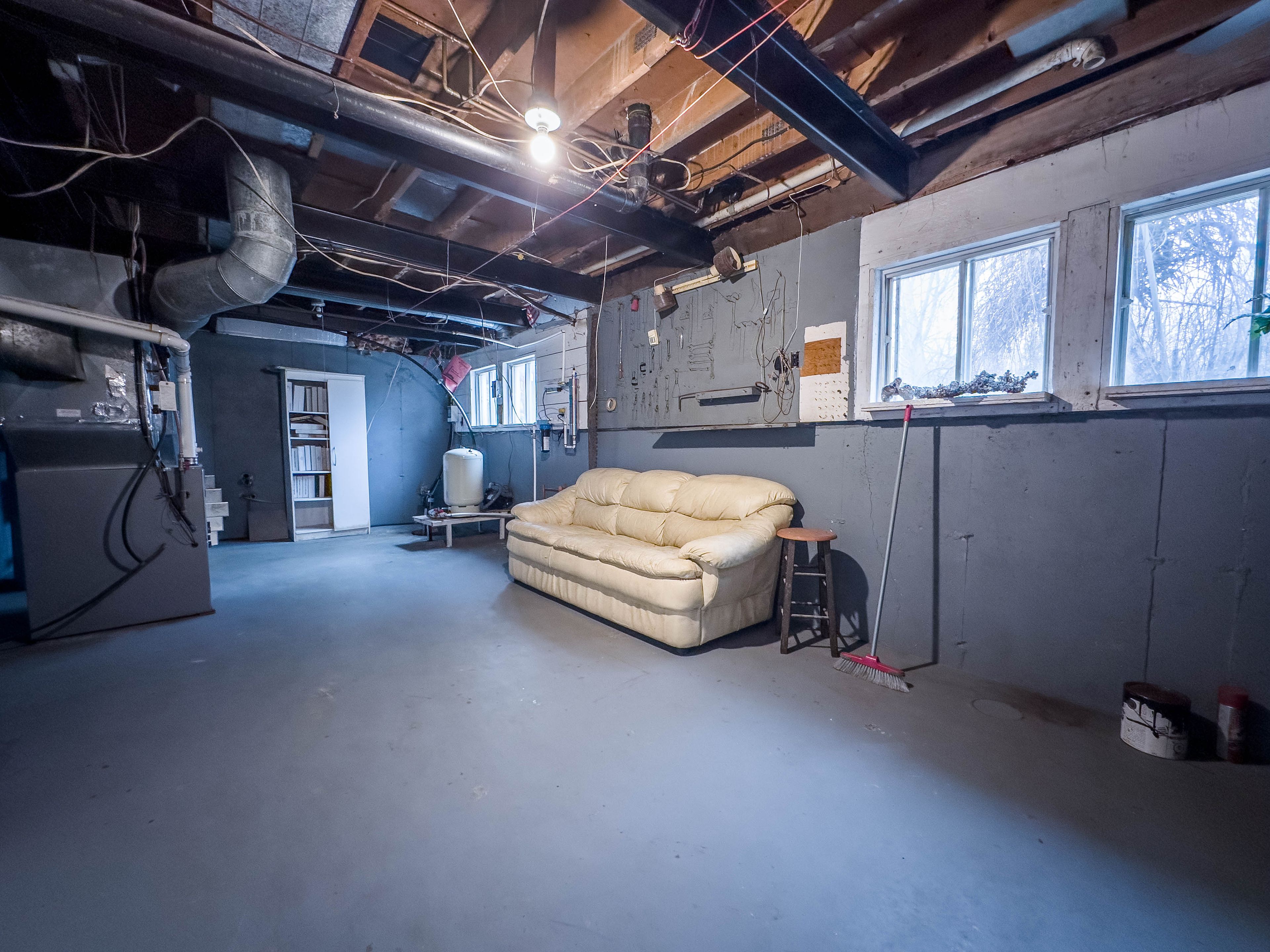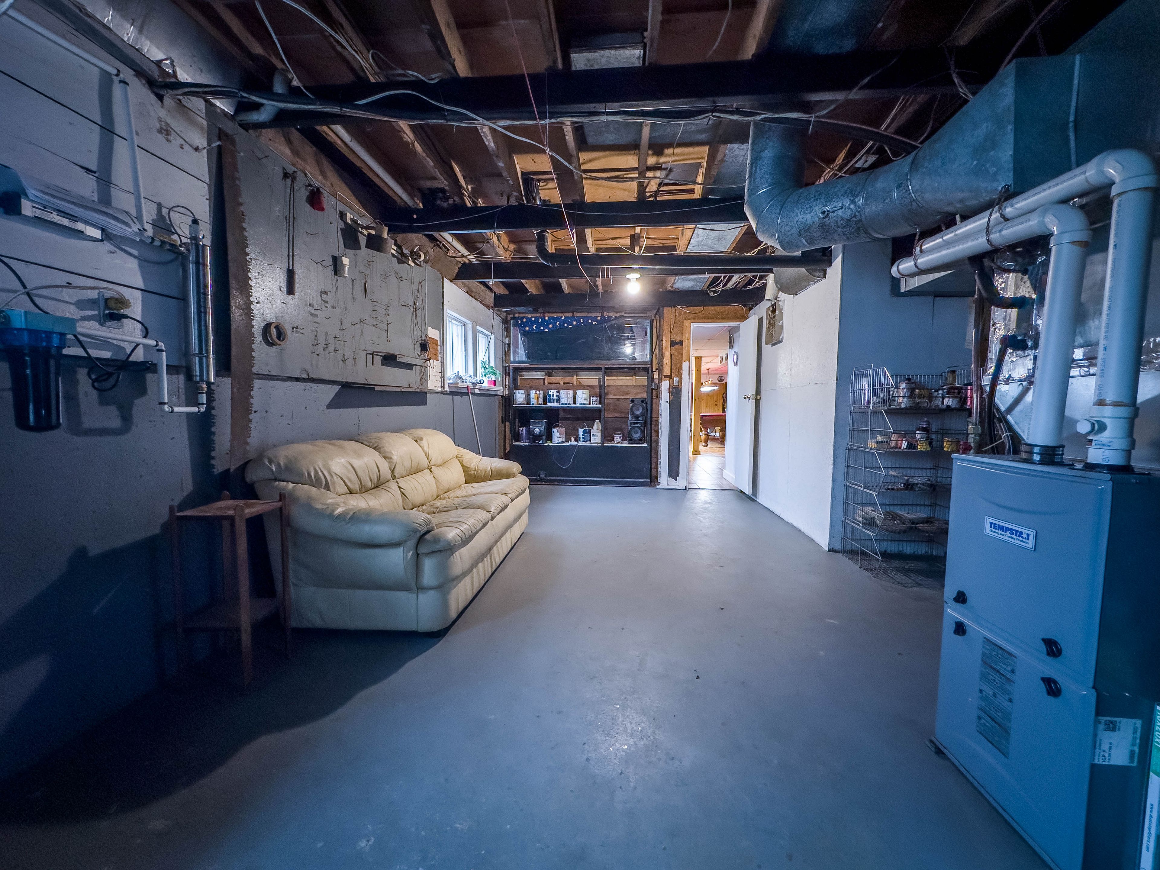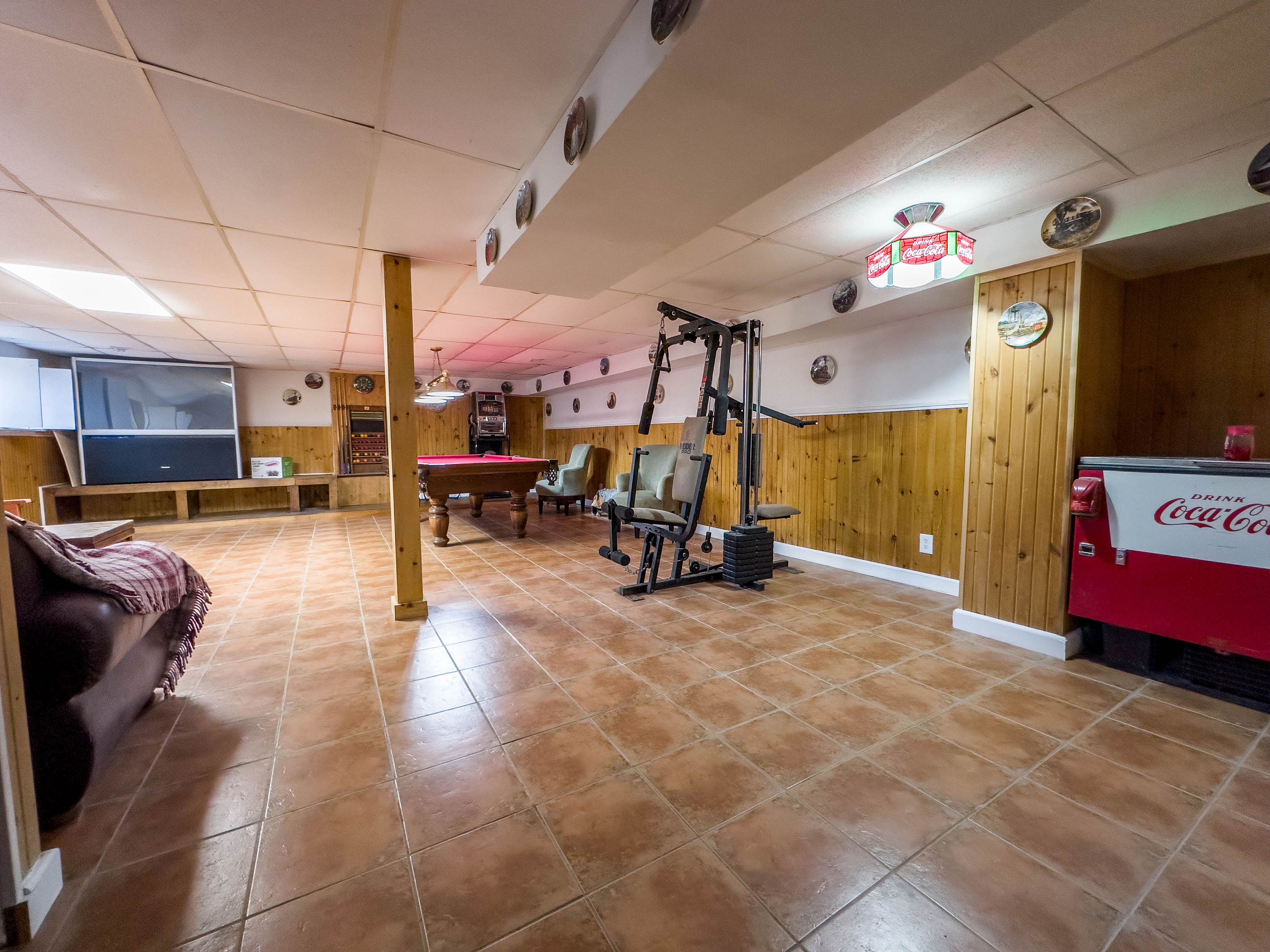 • Lower level features a rec room and pool table for entertainment.