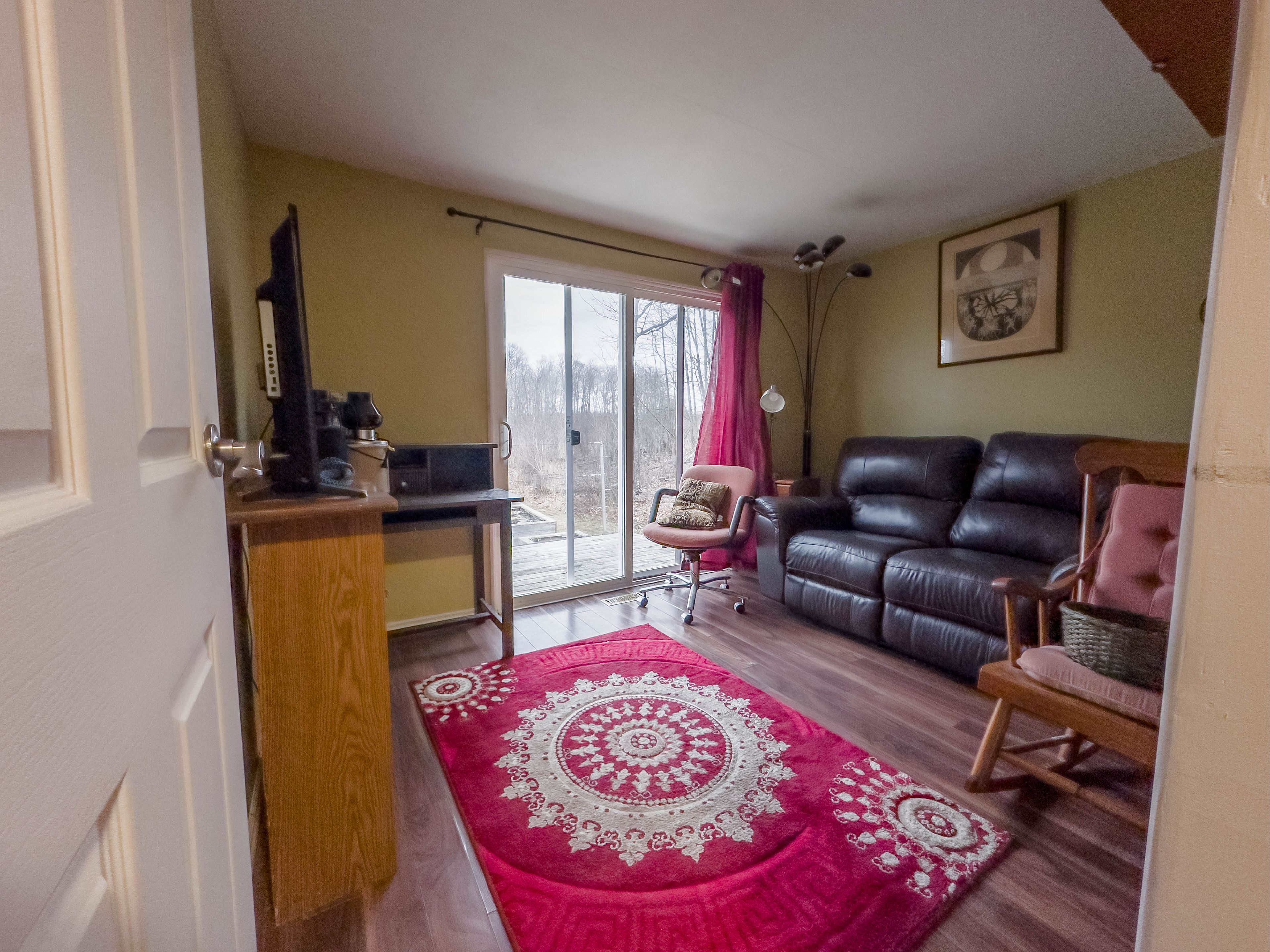 • Two patio doors lead to a deck perfect for outdoor relaxation.
