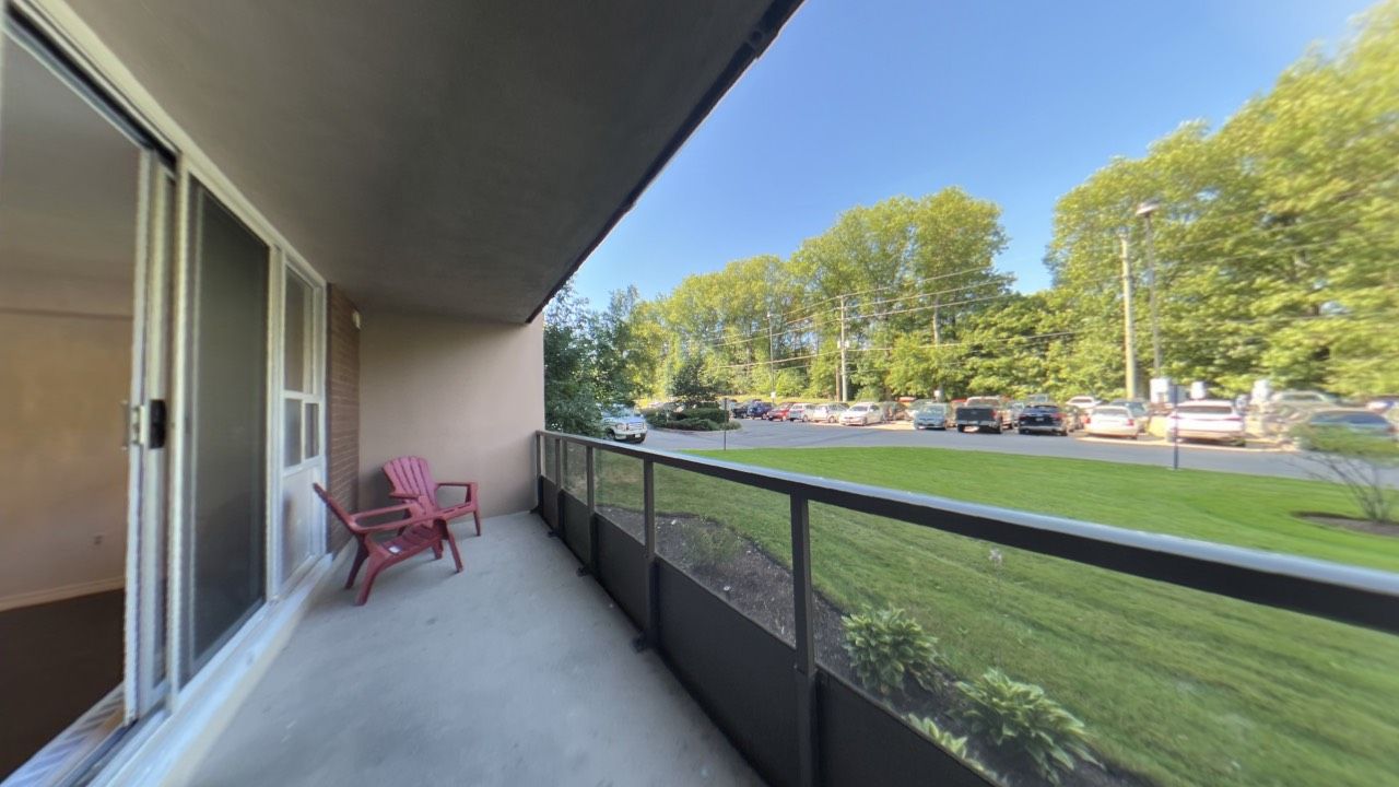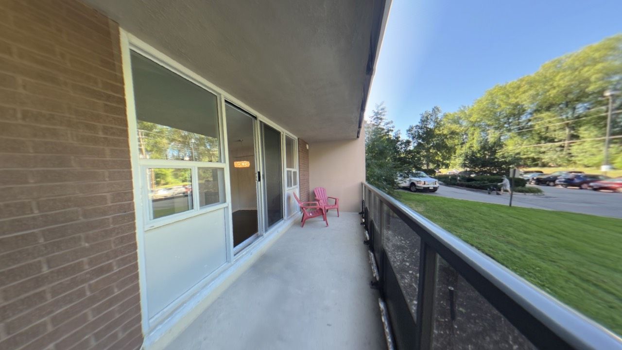 • Private balcony with views of landscaped gardens and trees.