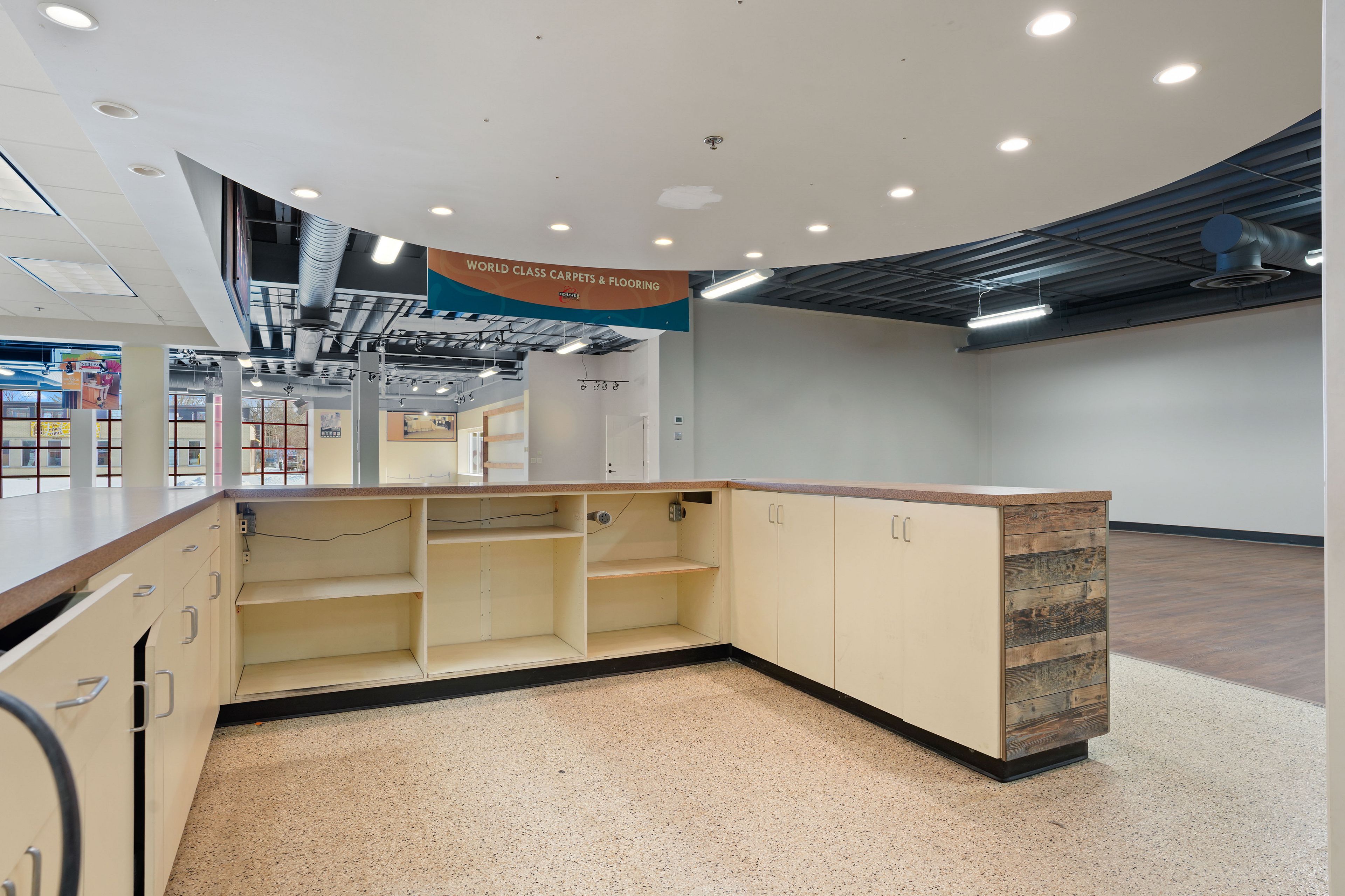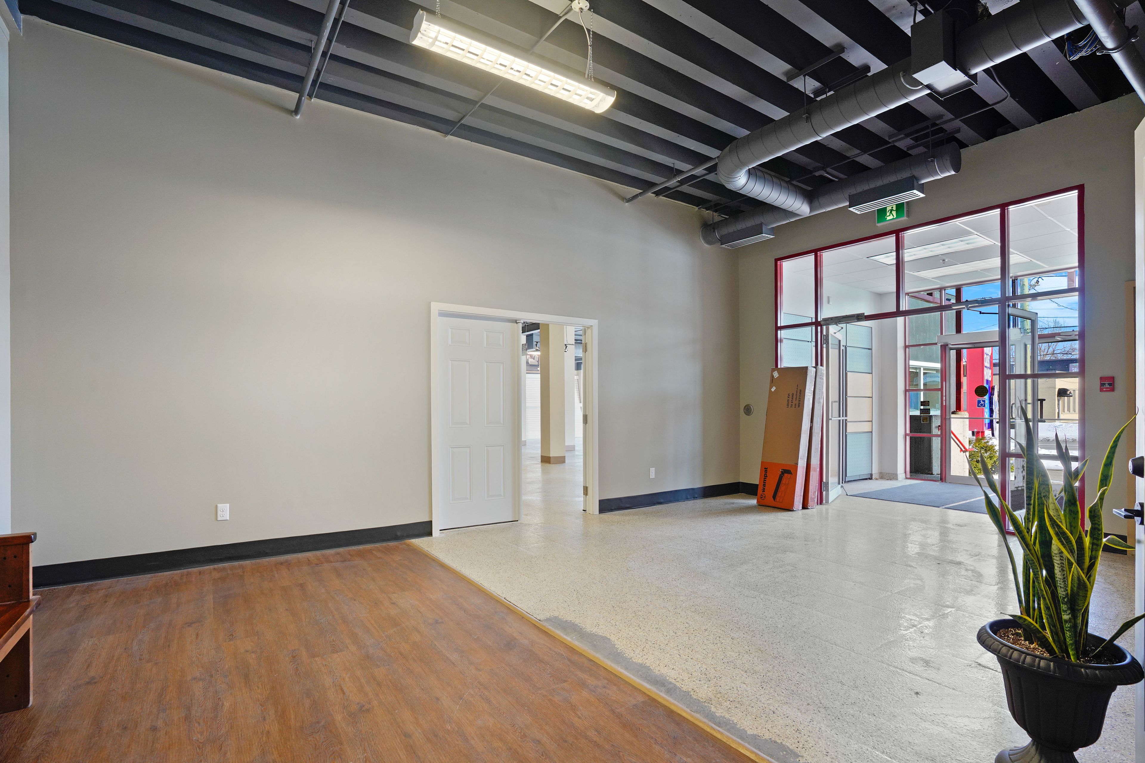• Open concept design with high ceilings and modern finishes.