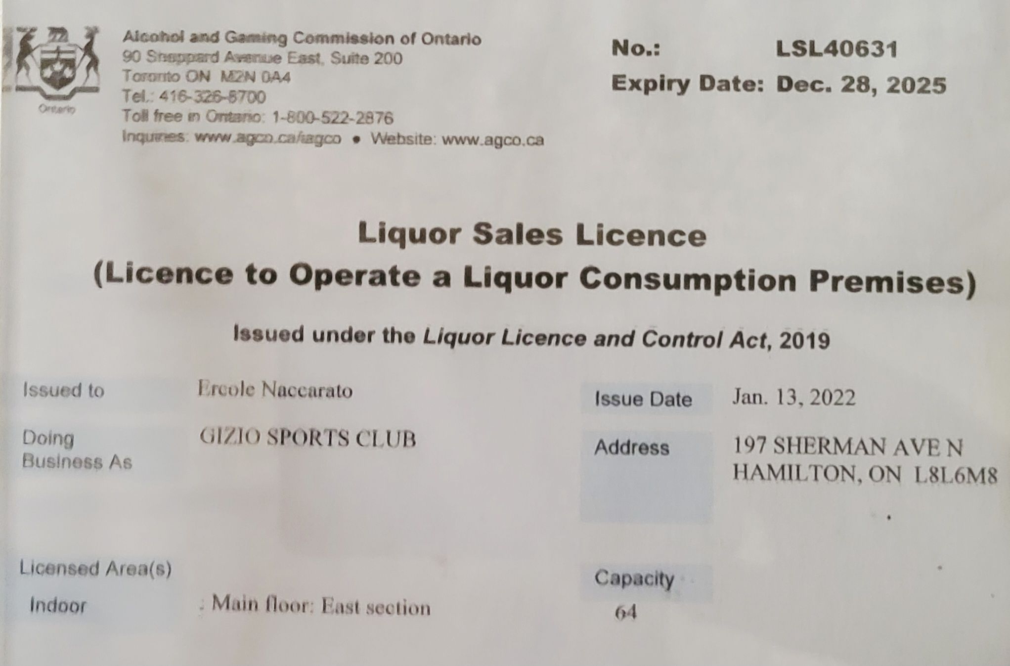 Amazing opportunity ! Fully detached all brick building operating as a sports club / bar with a two bedroom rental apartment on the upper level. Premium 20' x 158' pie - shaped lot ( 40' rear ) located in the up and coming " gibson community ". This is a fully operational " sports club" with a 64 person capacity and is being sold with the " liquor sales license " ( see attached ). The new owner is responsible to transfer the license to his / her name. The building is solid but needs cosmetic updating on all three levels, large rear yard with multiple storage buildings and a detached all brick garage fronting onto the rear laneway. All fixtures and chattels are included " as-is ", no financials are available for the sports club and there is no guarantee that the alcohol and gaming commission will accept the new applicant. This is a perfect opportunity for the new owner to live / work in the same location and create equity by improving the existing building / property. Second floor apartment has a side entrance as well as a rear stairwell. Hot water gas heat, gas hot water tank ( rental ). Sale price includes the building and operating business.