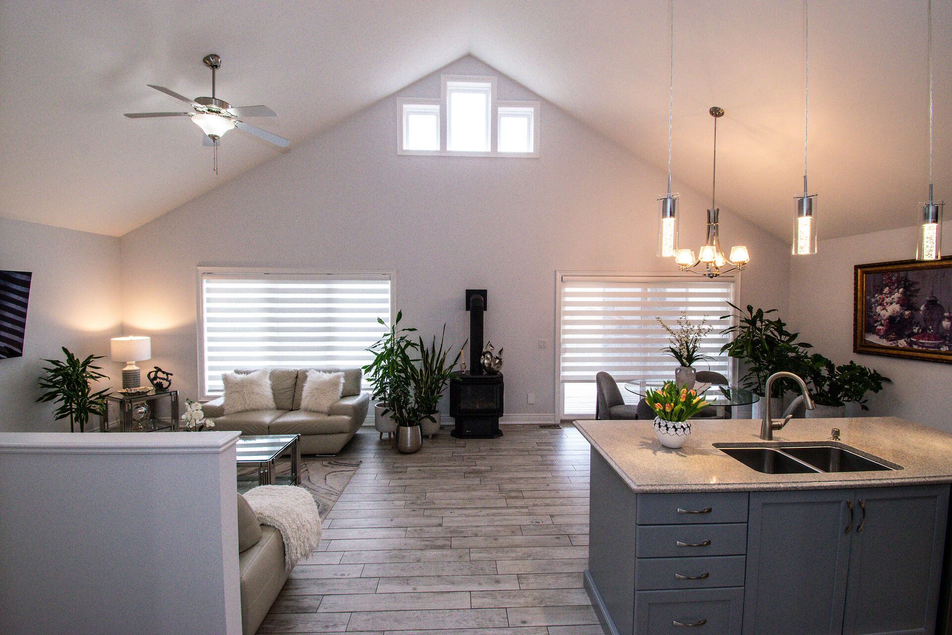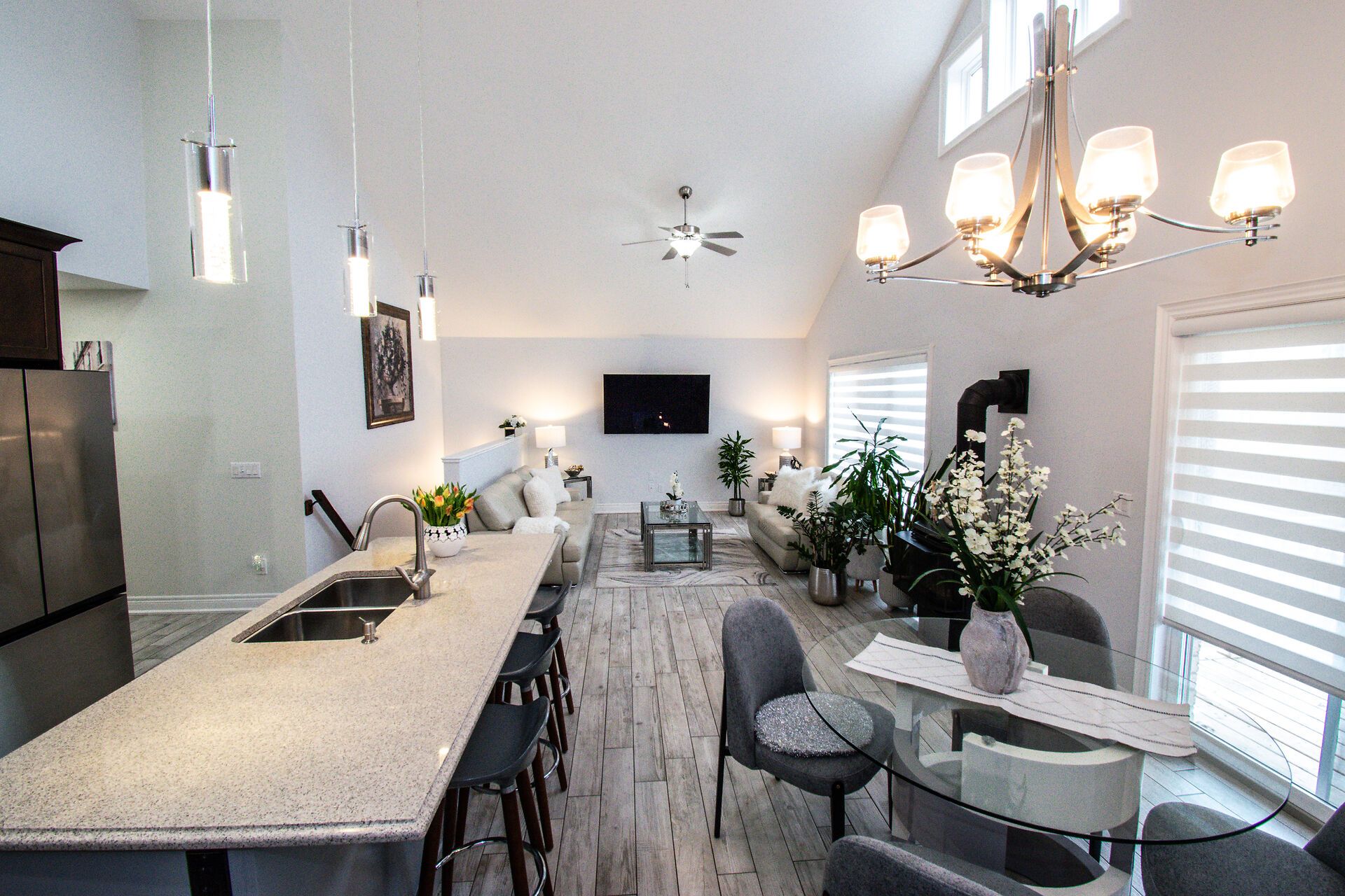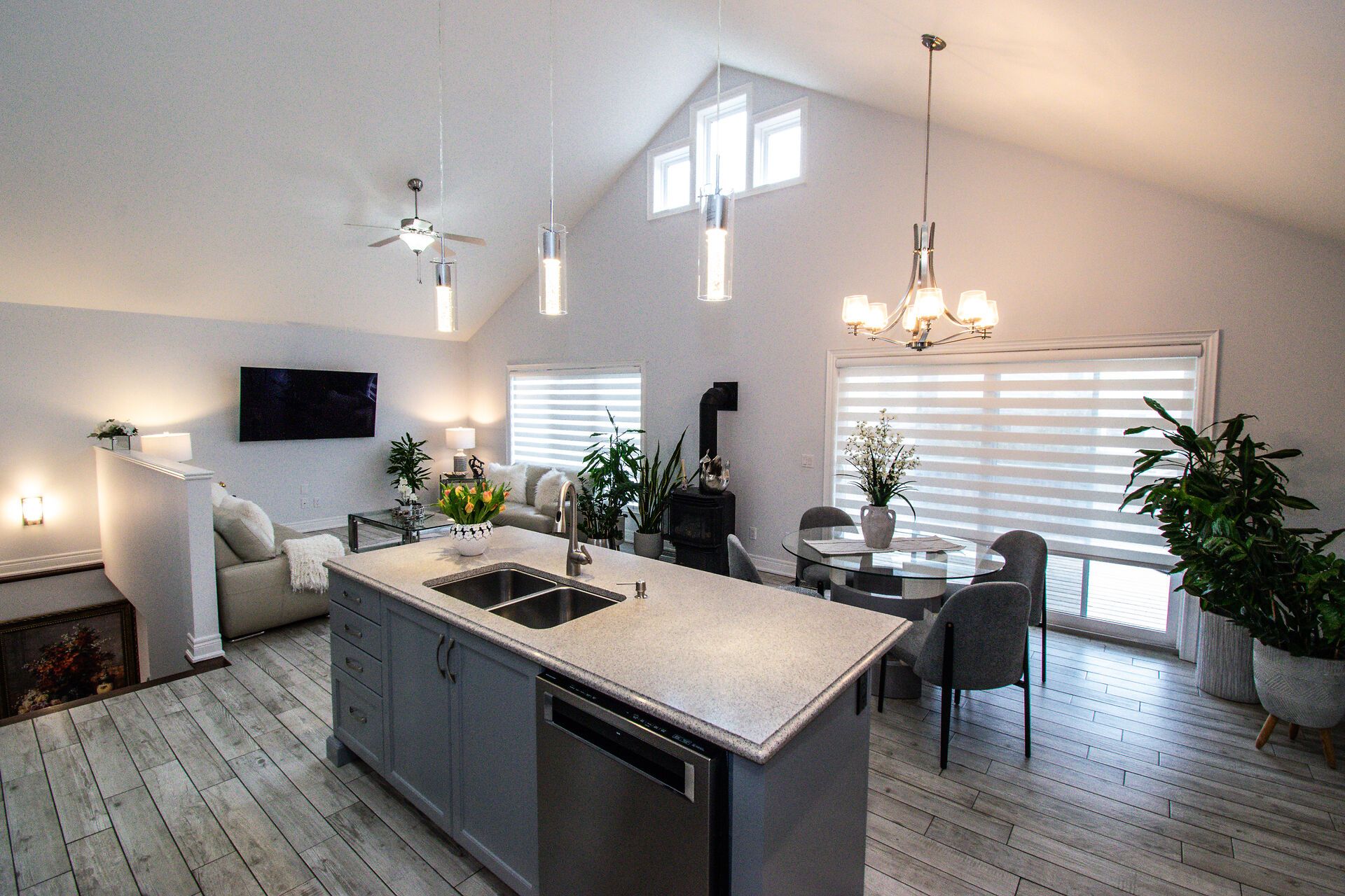 • Open concept kitchen and dining area flows into a great room with cathedral ceilings.