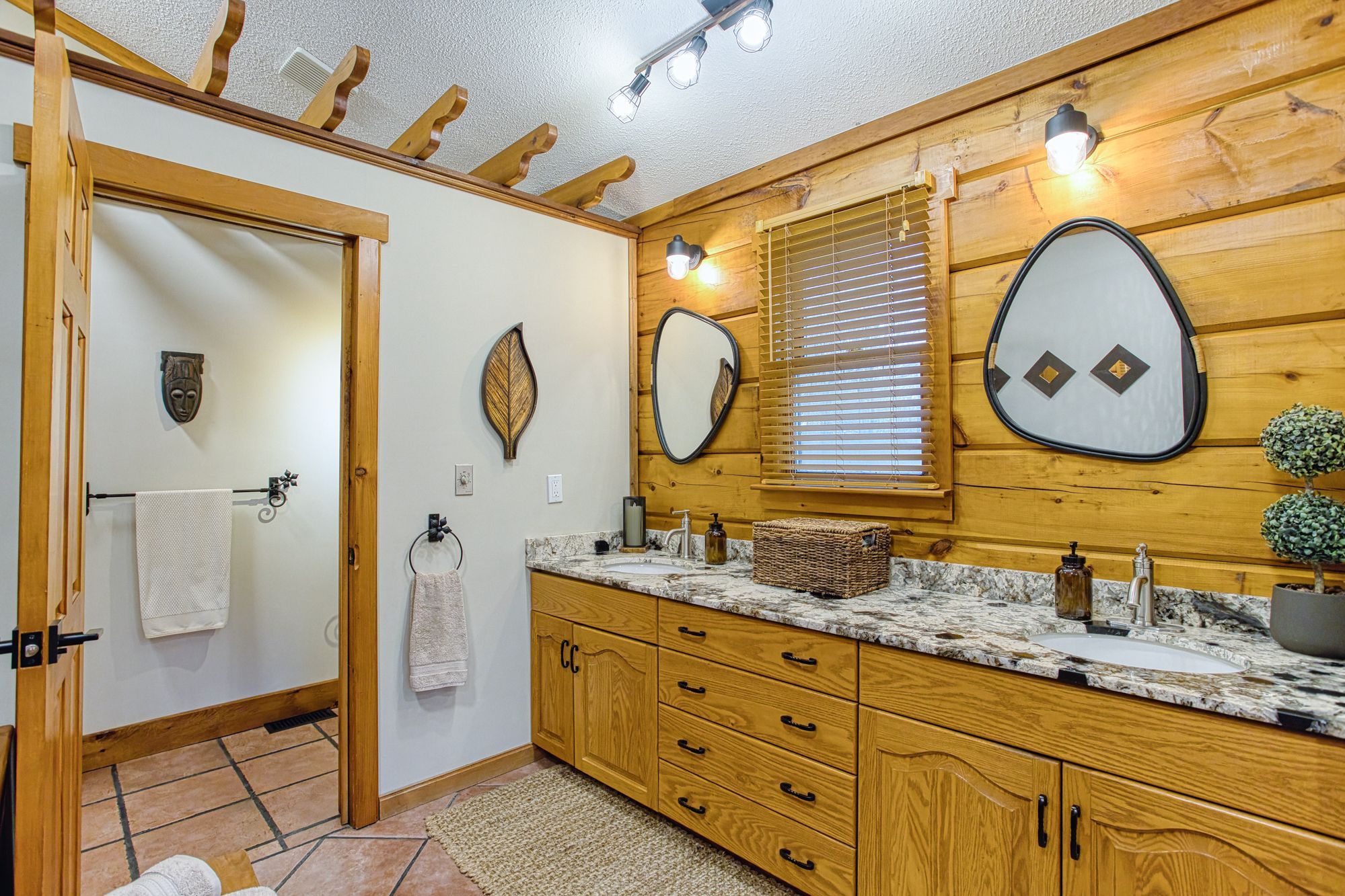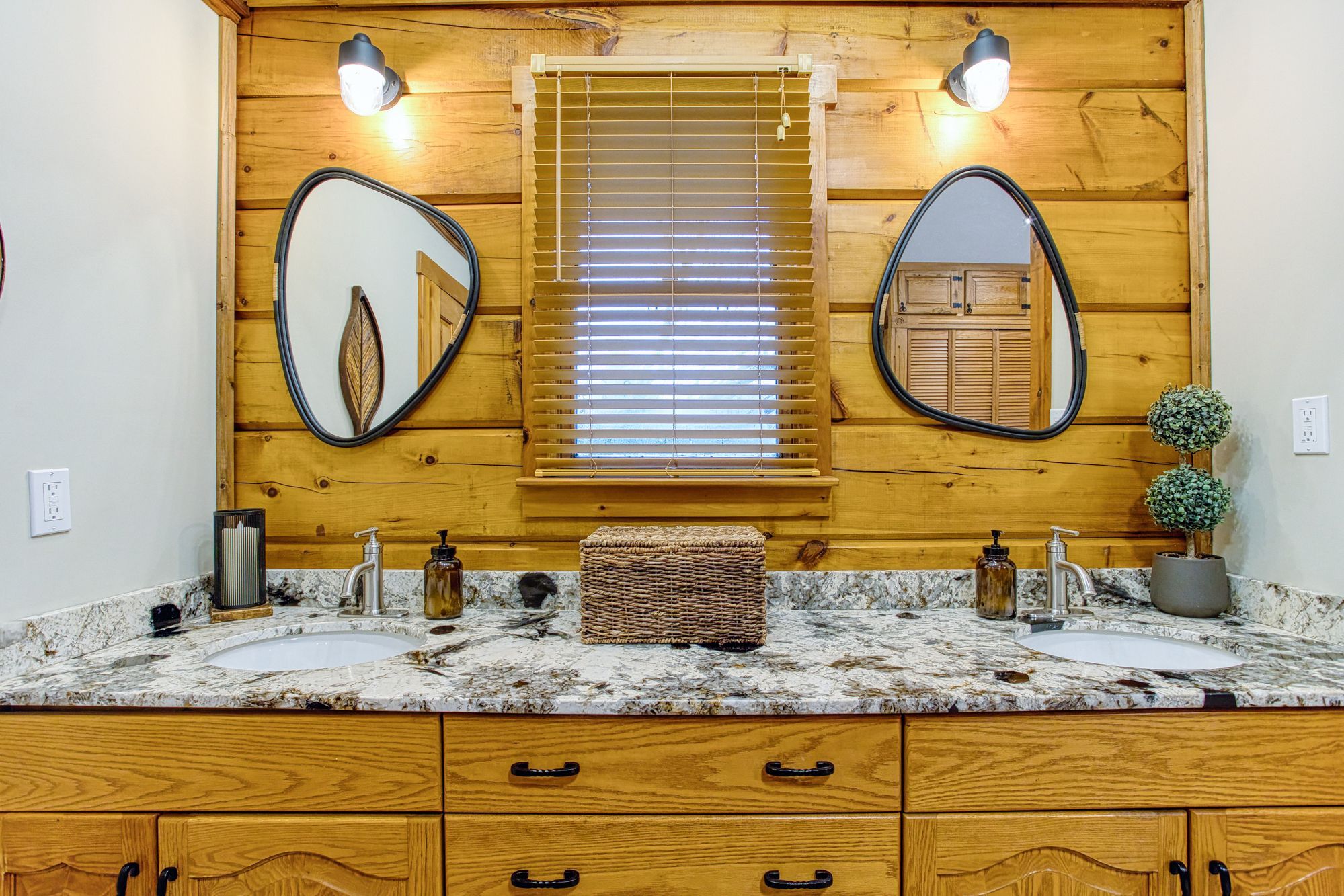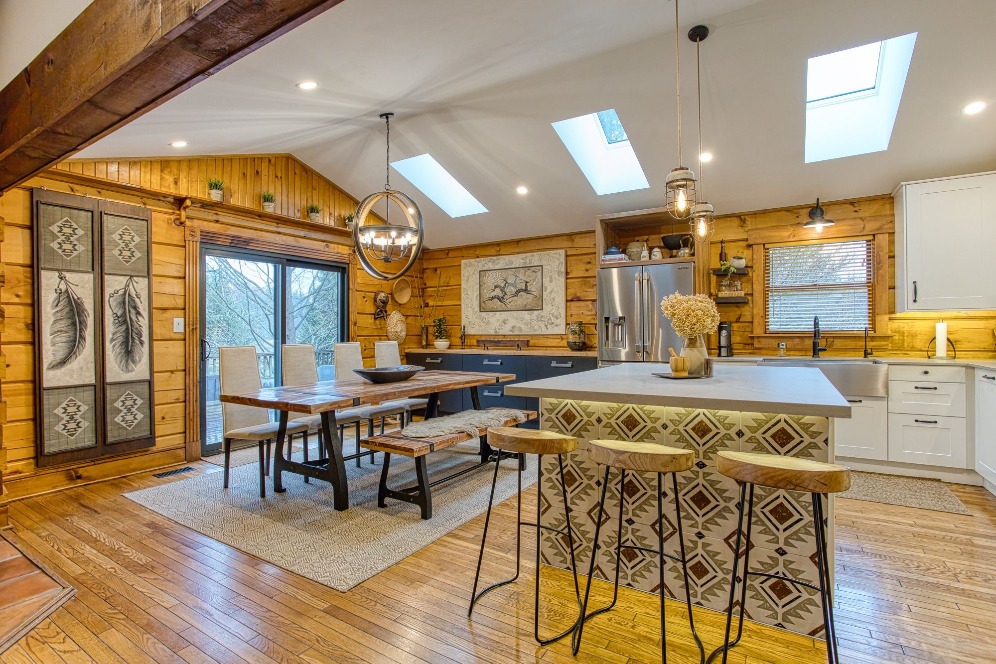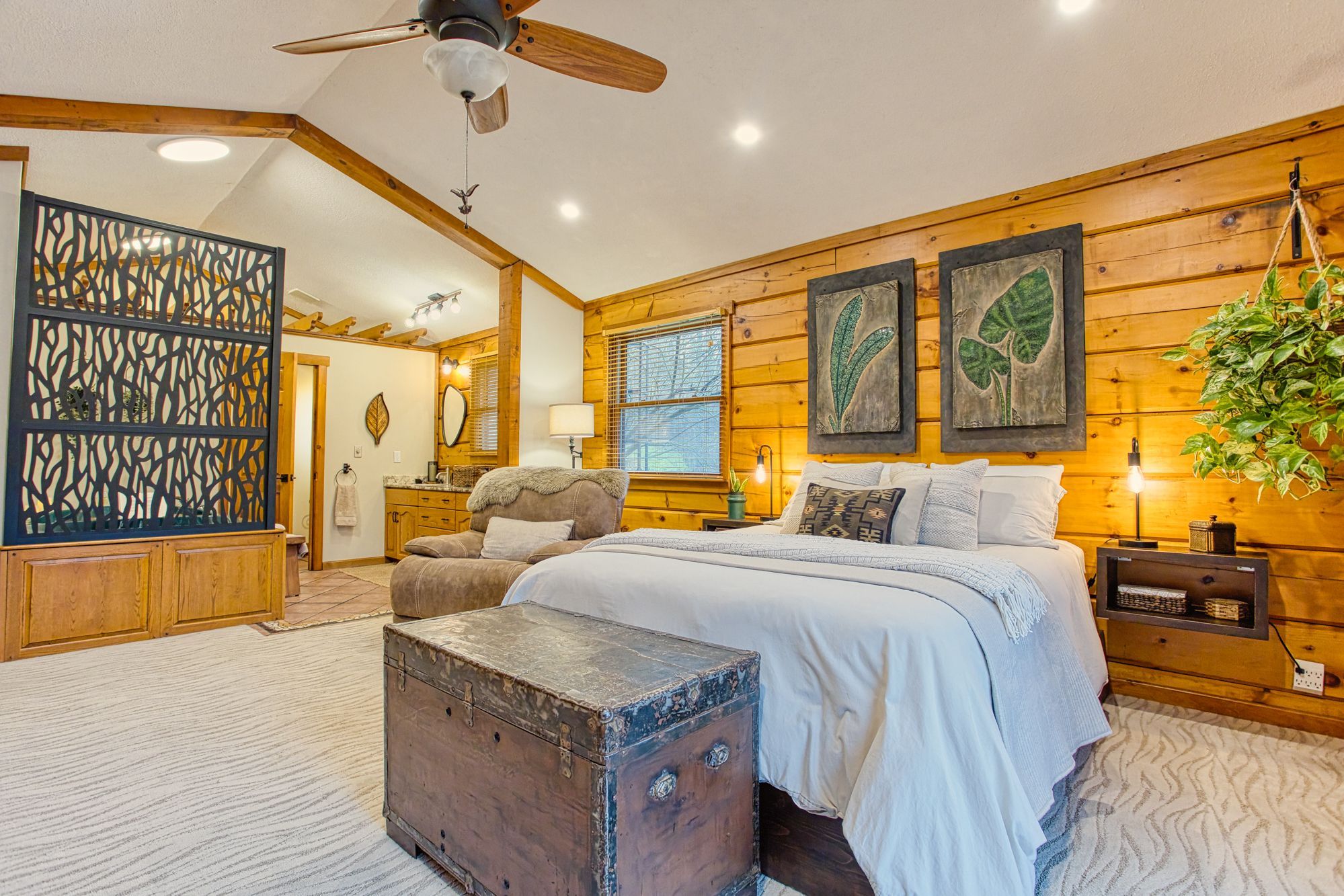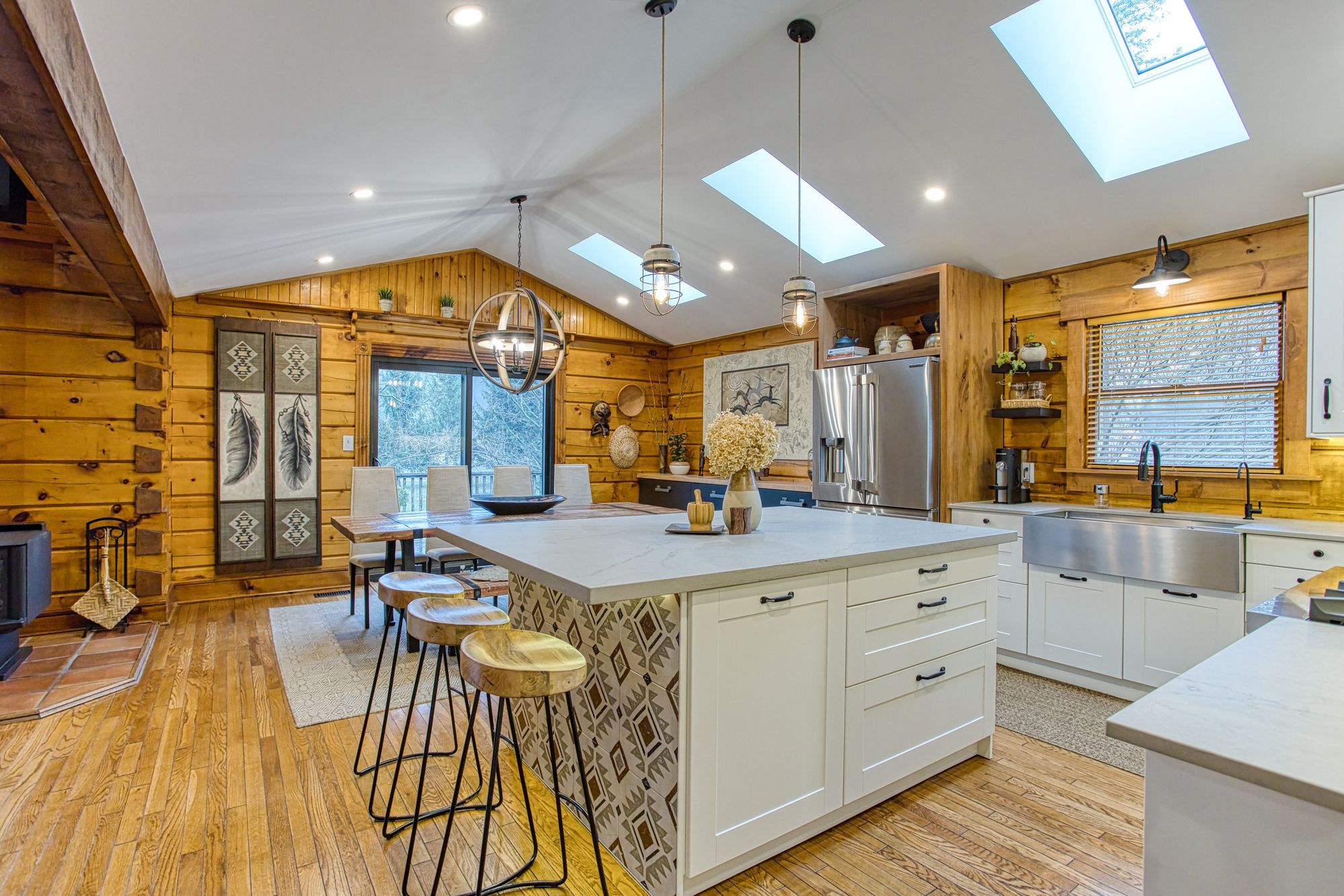 • Vaulted ceilings and luxurious countertops create a refined atmosphere.