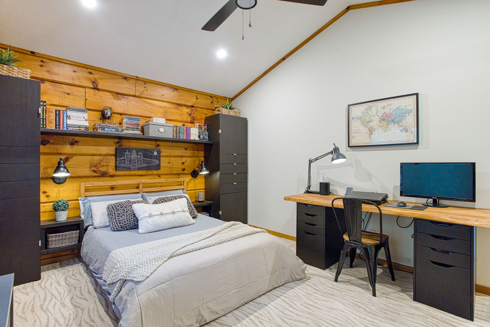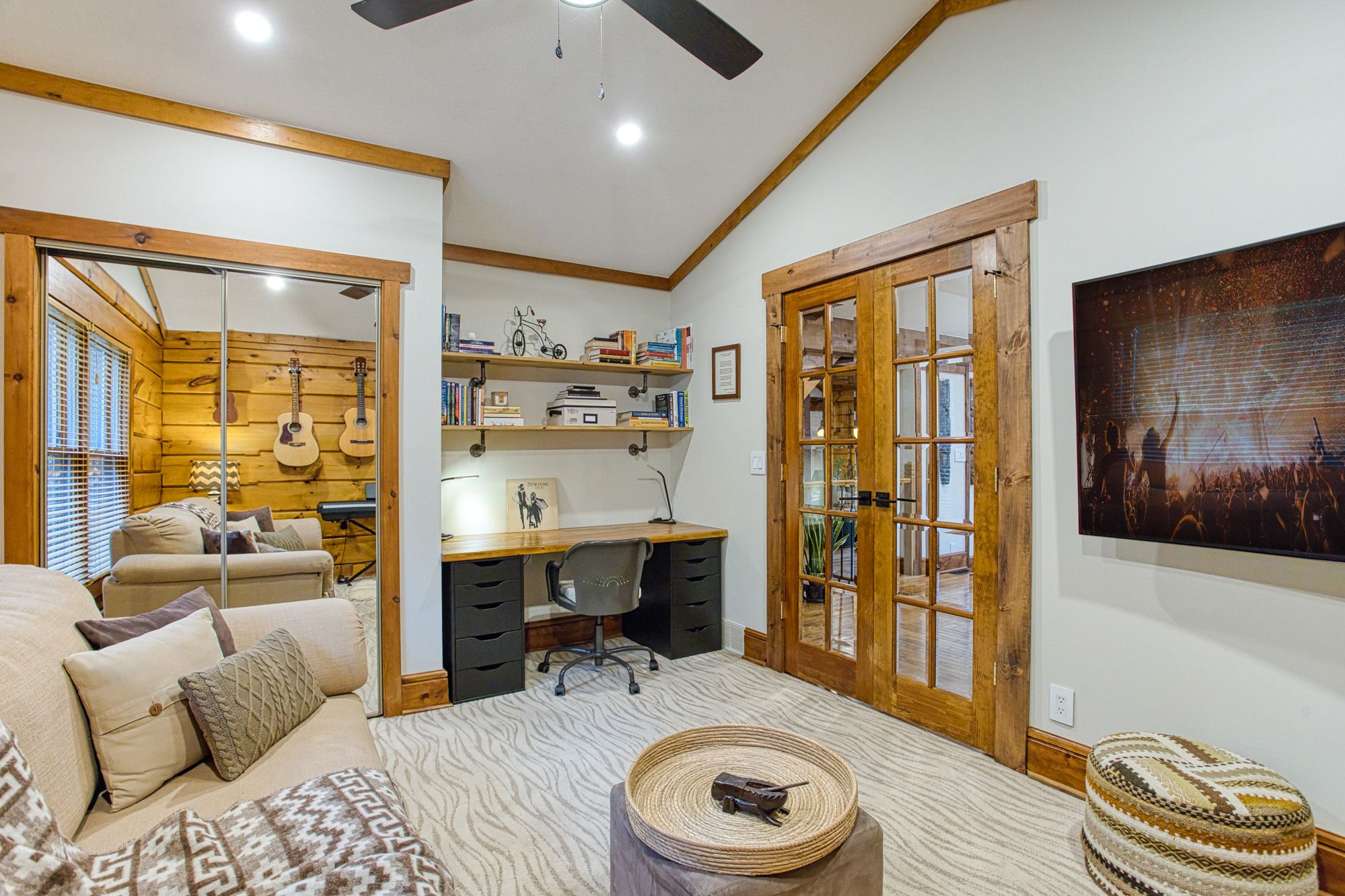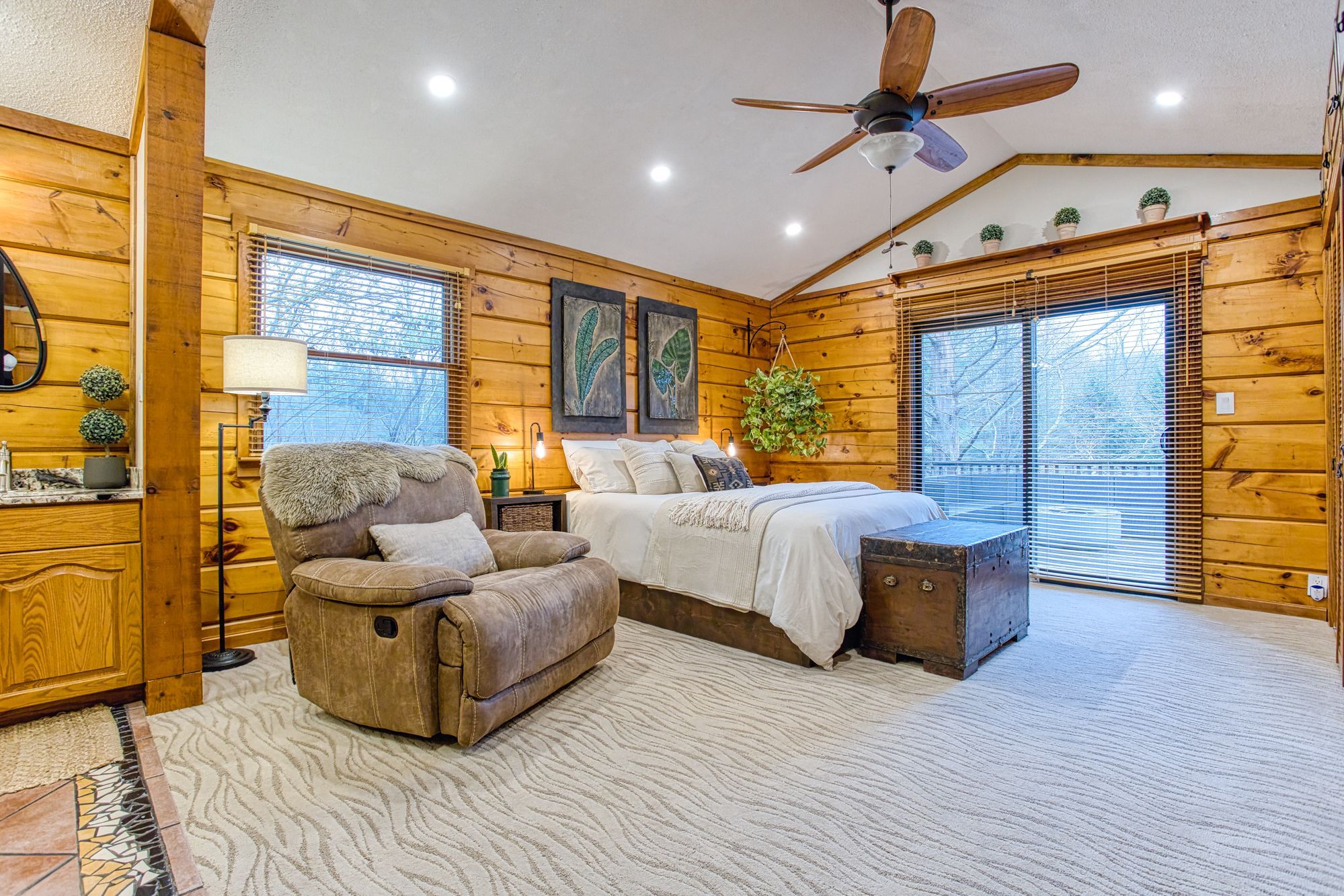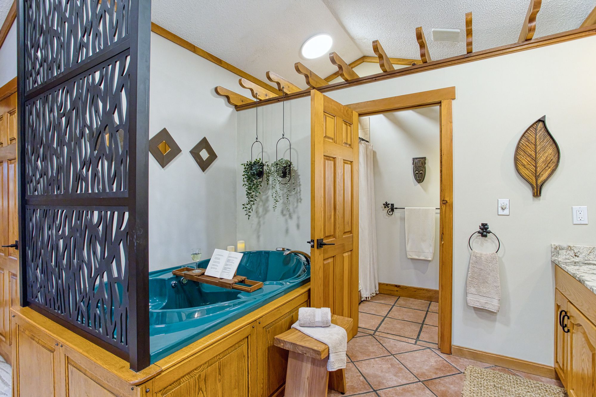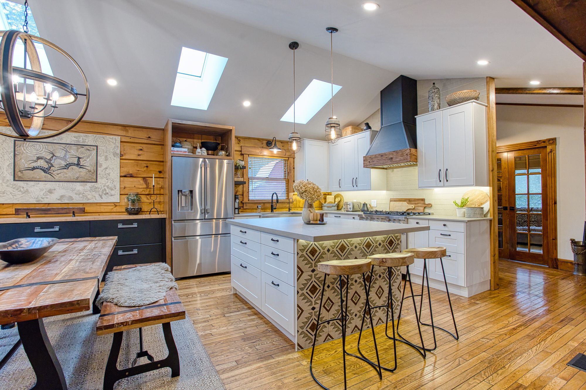 • Vaulted ceilings and luxurious countertops create a refined atmosphere.