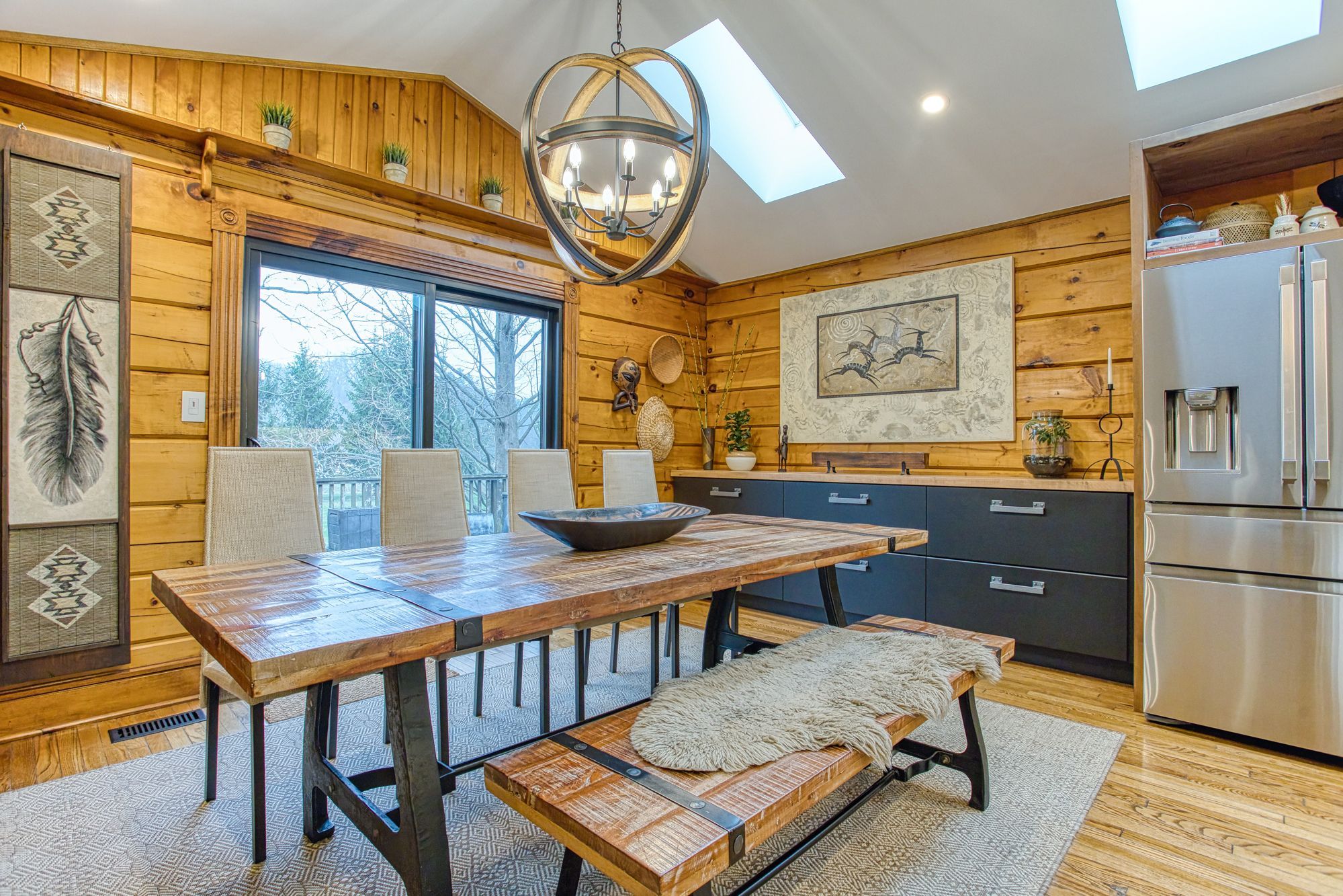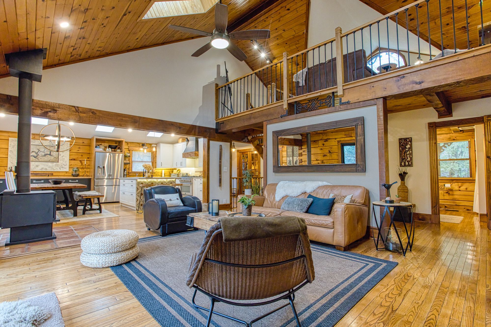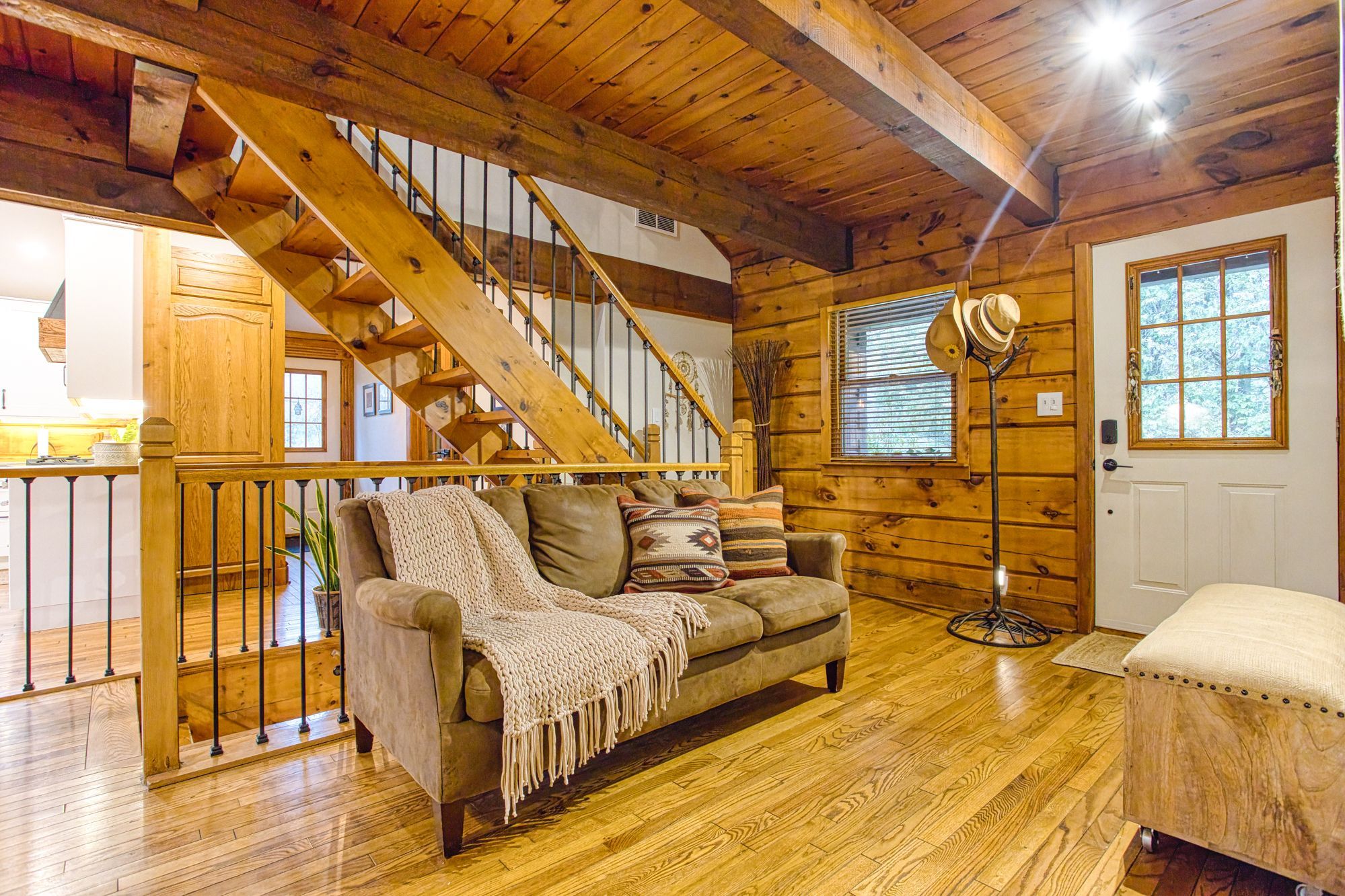 • Authentic log home crafted from white pine with unique dovetail joinery.
