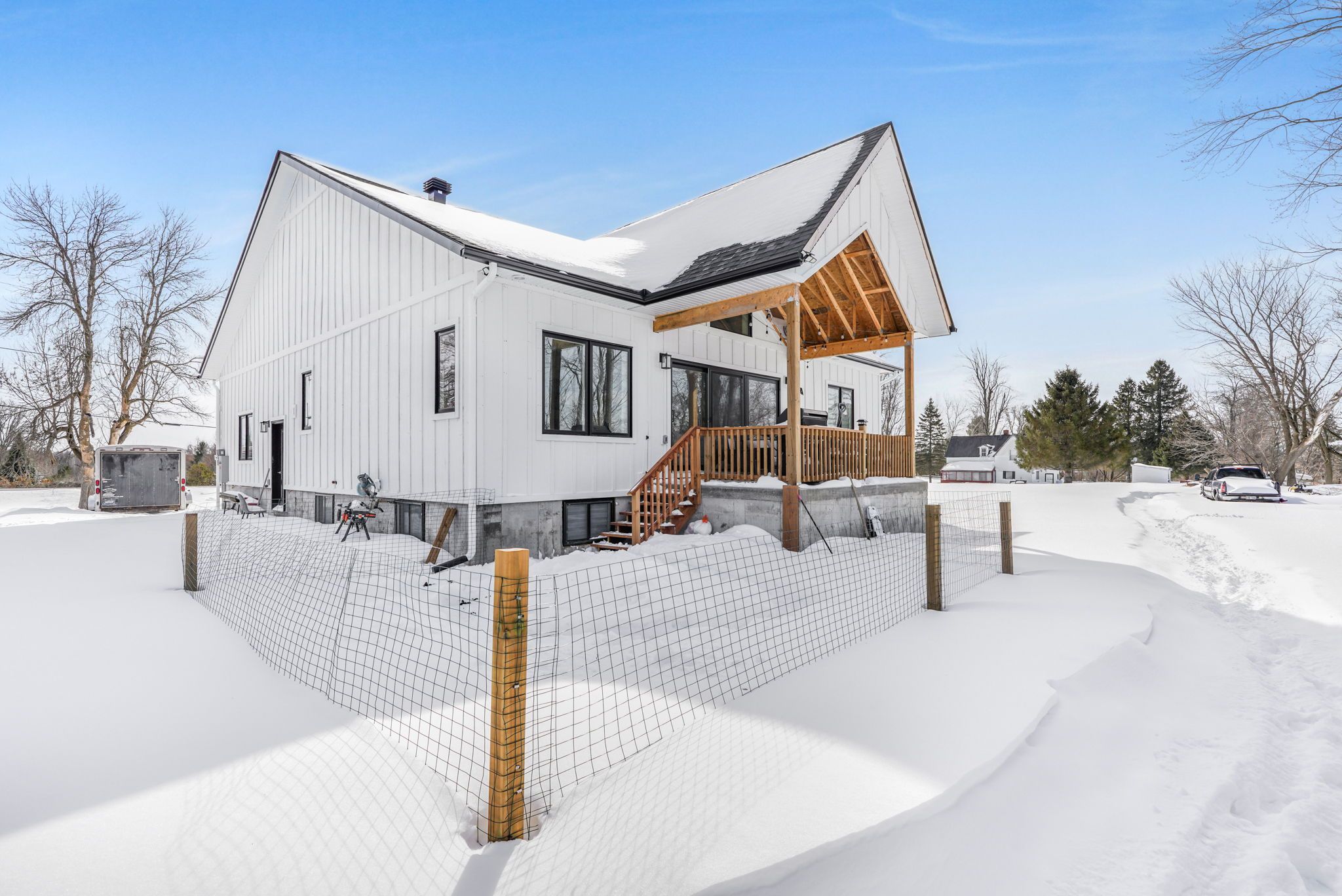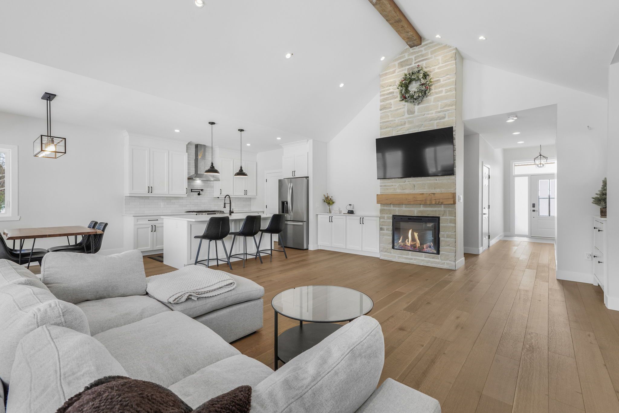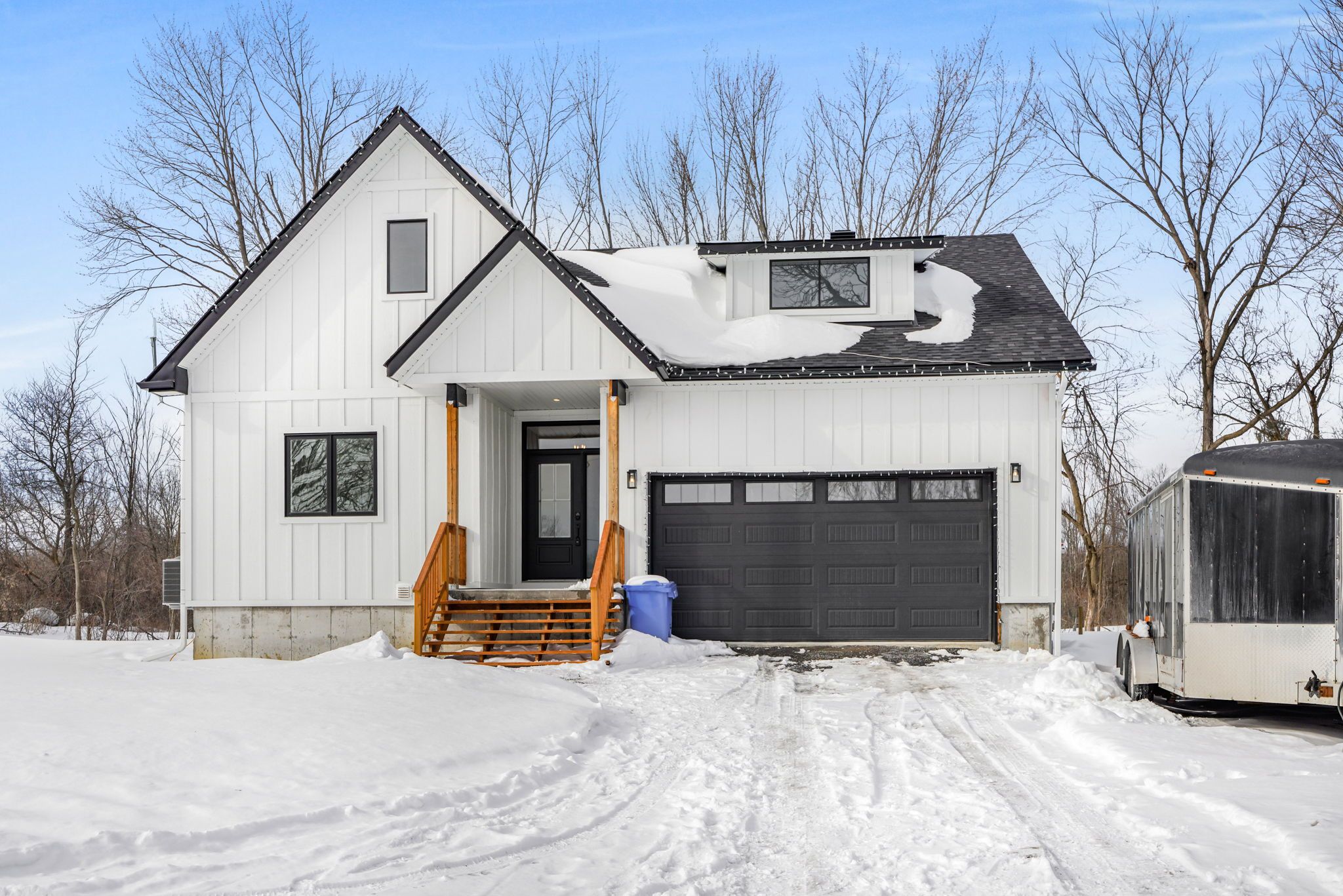 Welcome to this beautifully built 2025 modern farmhouse set in a quiet location with minimal neighbouring properties. Featuring striking board and batten vinyl siding with black accents and a double car garage, this home offers 3+2 bedrooms, 3 full bathrooms, and a fully finished basement with 9' ceilings. The bright, functional layout showcases laminate flooring, an electric fireplace, and comfortable living space throughout. Built for efficiency with a high-efficiency natural gas forced air furnace, central air conditioning, hrv system, 200-amp service, spray foam insulated basement, and quality insulation throughout. An unfinished back porch offers future potential to customize the outdoor space. Move-in ready with modern finishes and strong mechanical features already in place.