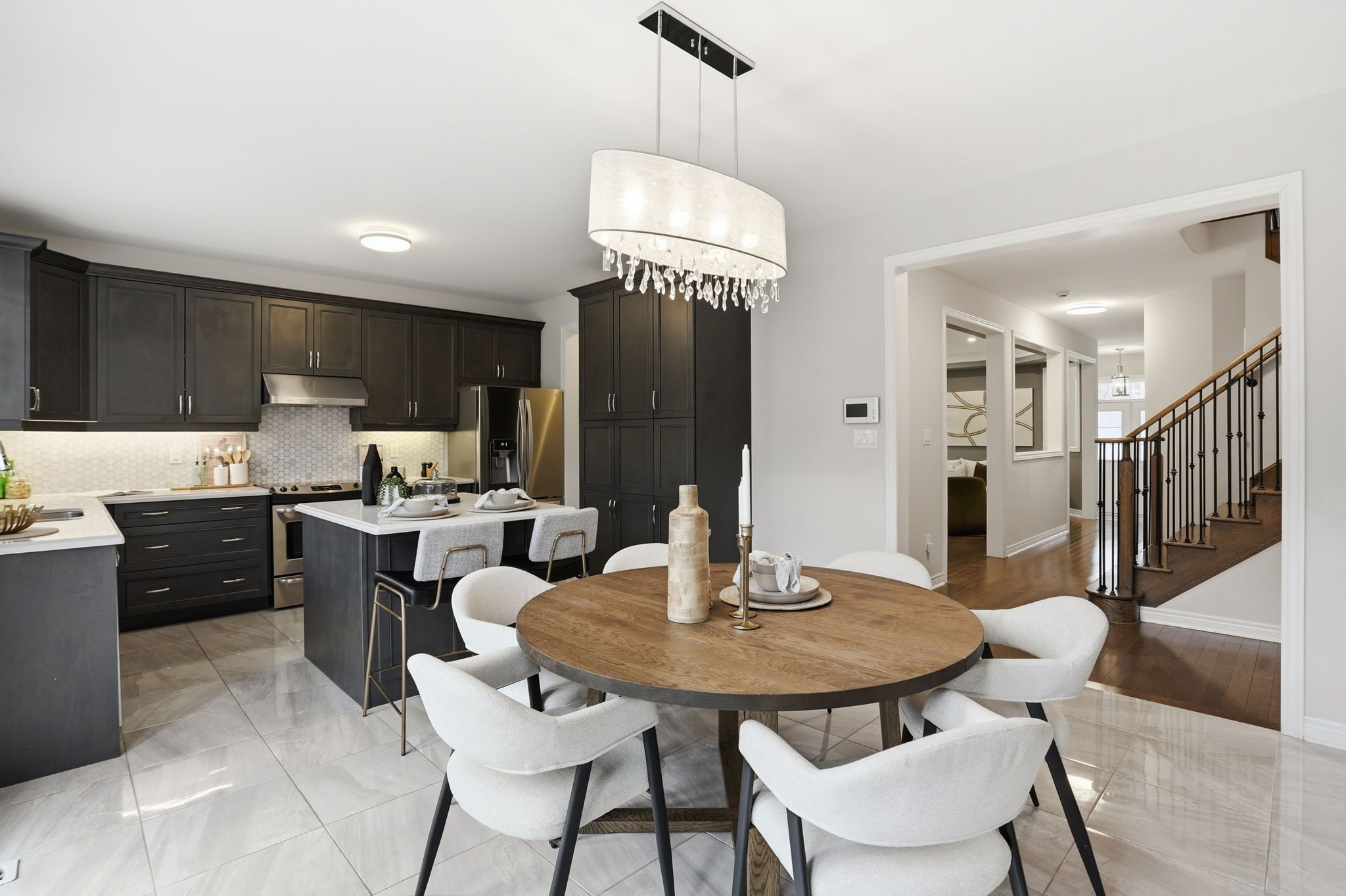 • Chef's kitchen equipped with quartz countertops and stainless steel appliances.